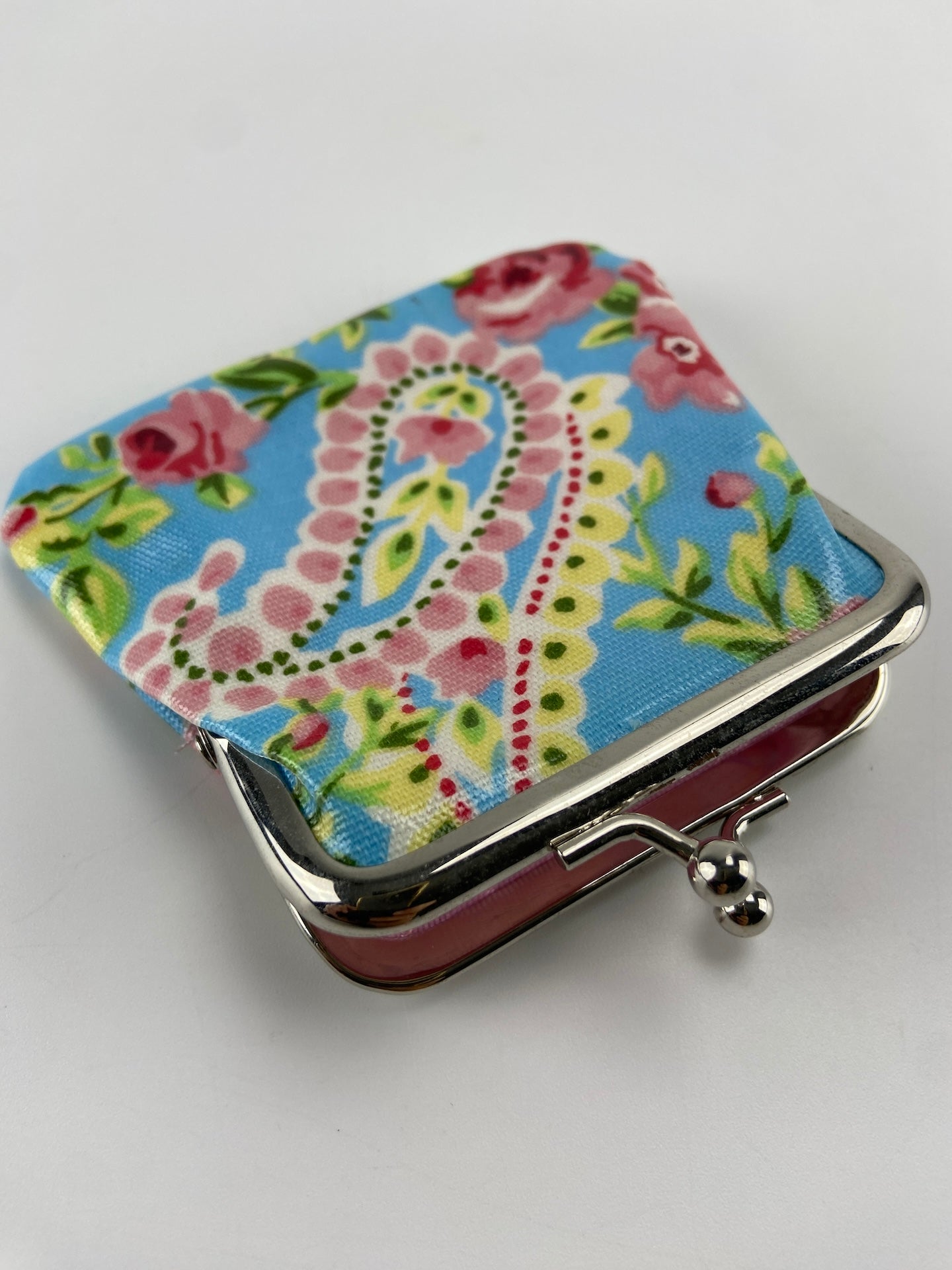 Porta moedas com tecido plastificado com padrão de flores.