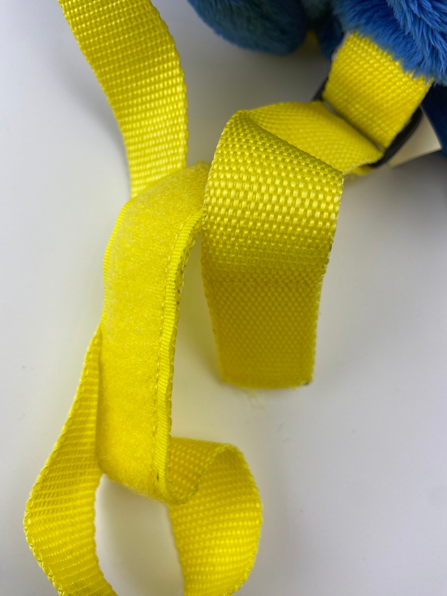 Mochila pequena de pelúcia. Com fecho nas costas e barriga transparente.