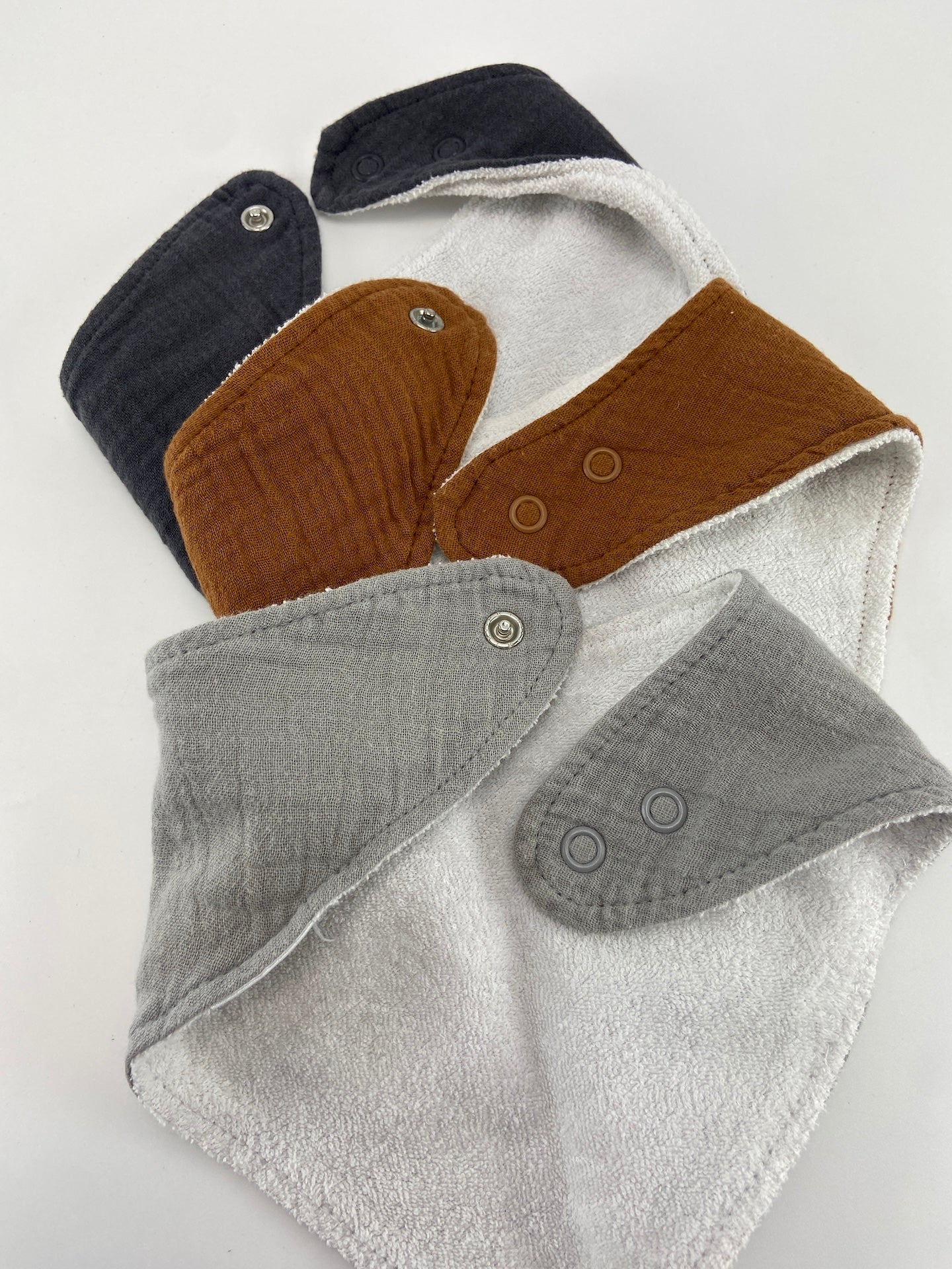 Pack de 3 bandanas com forro turco. Prende com mola de pressão.