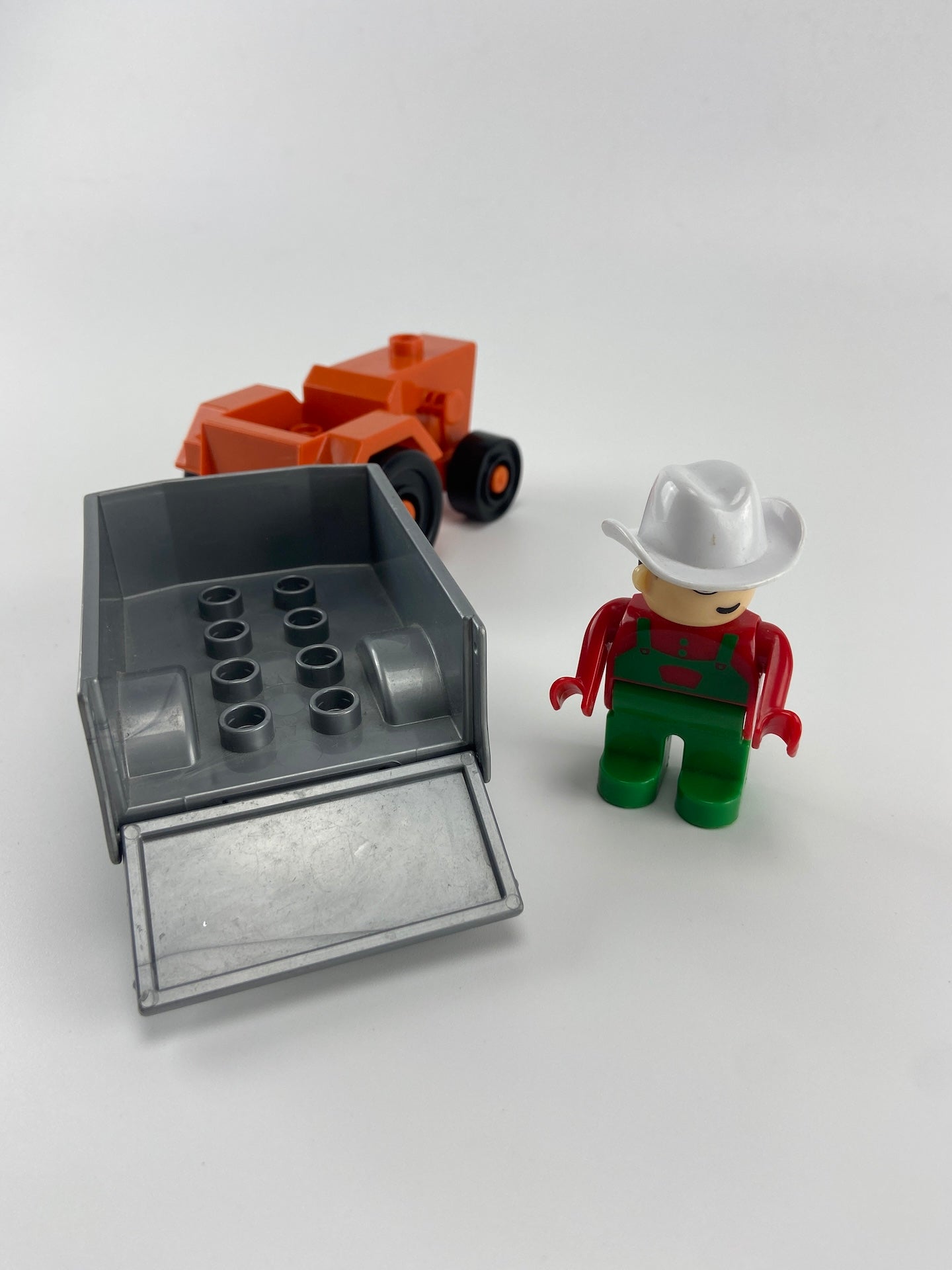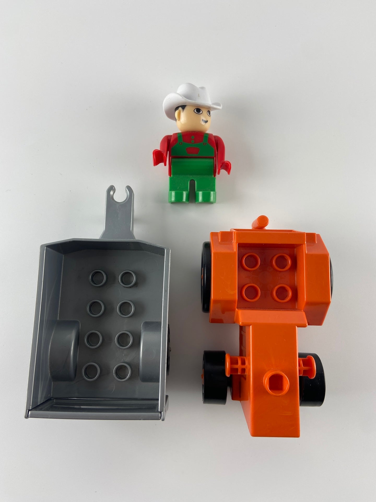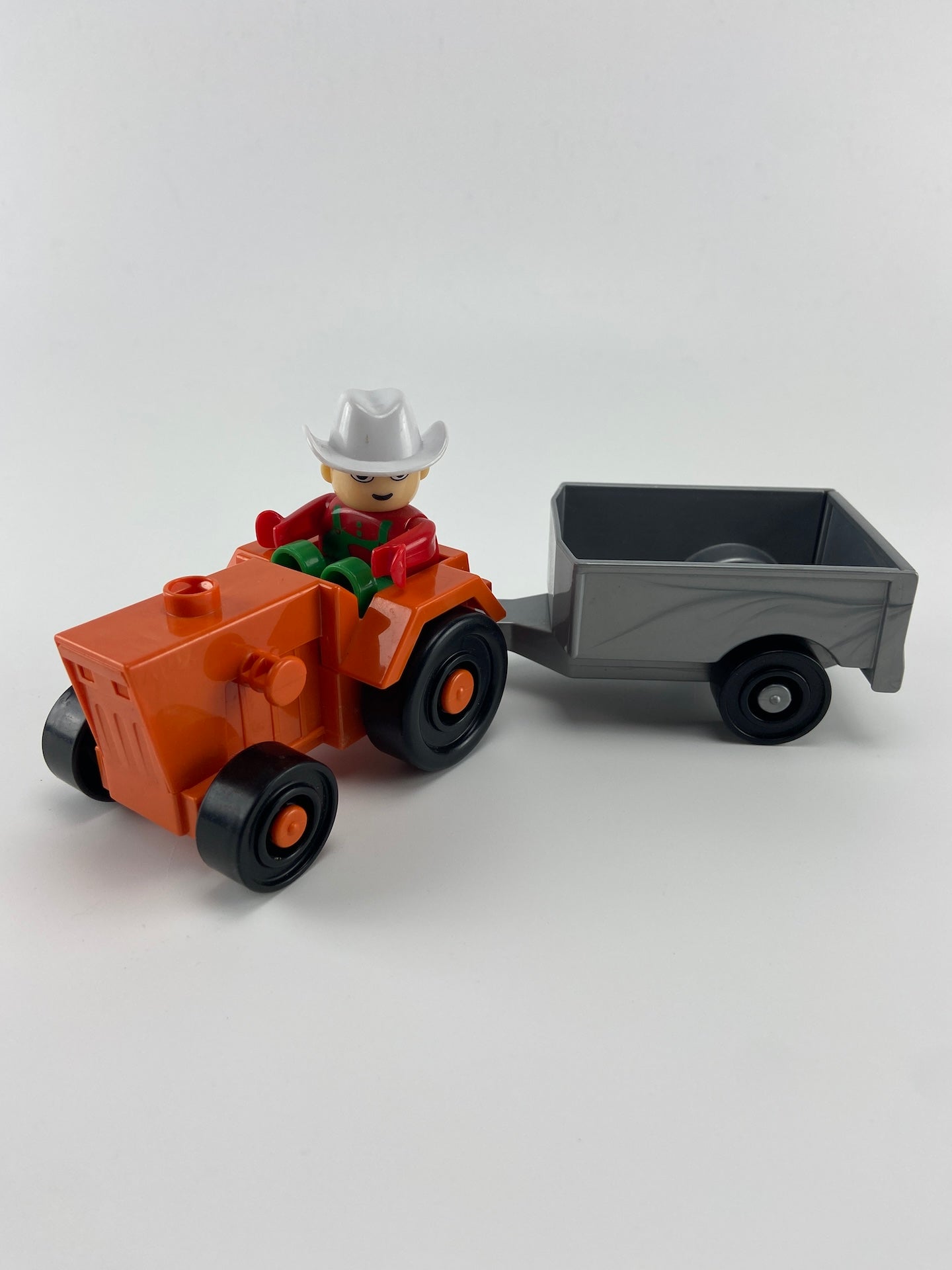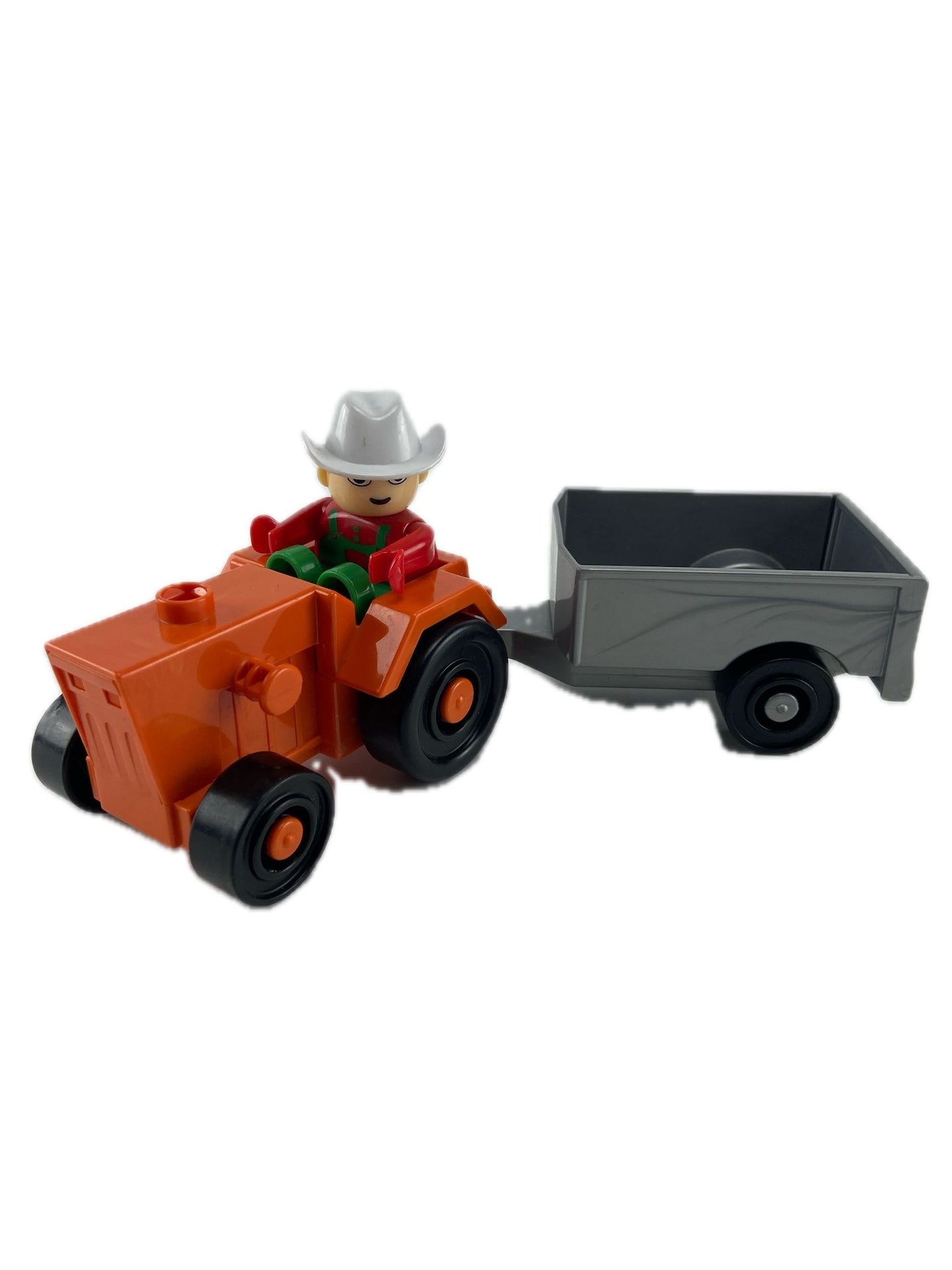 Conjunto de trator, atrelado e boneco em peças tipo lego.