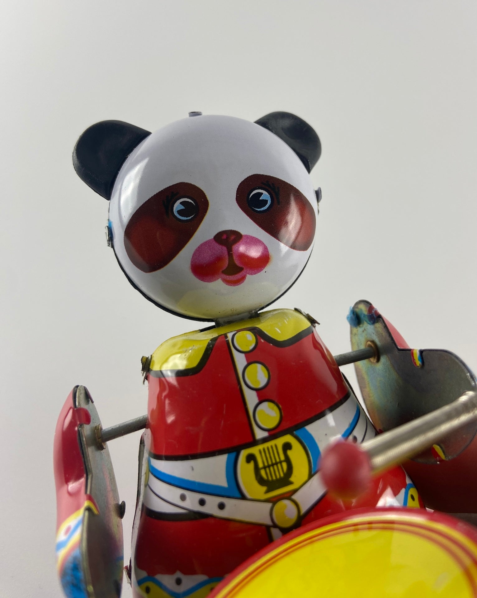 Brinquedo em folha de metal com sistema de corda para panda tocar tambor. ATENÇÃO! Artigo de colecionador não adequado a crianças.