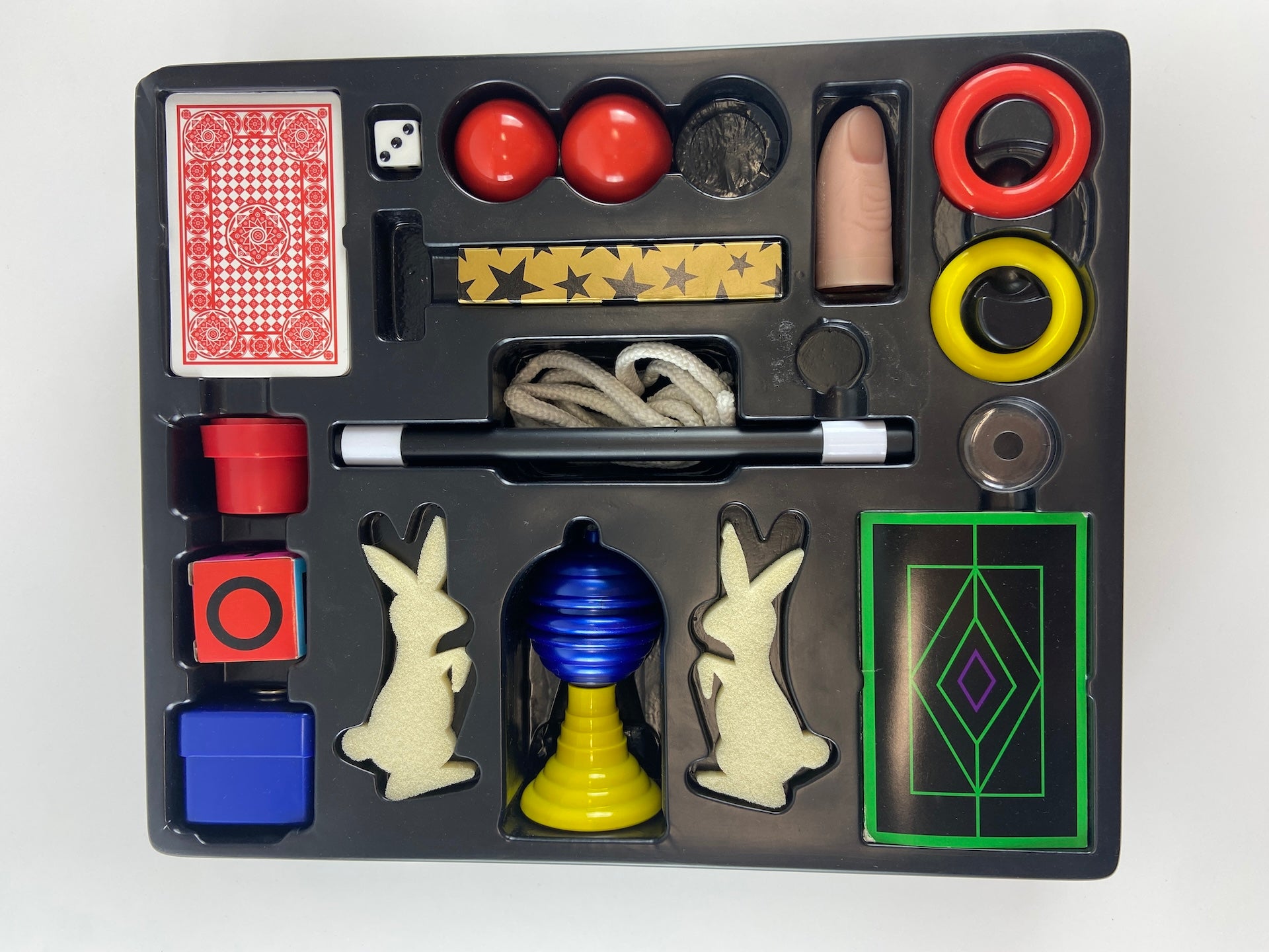 Inclui cartas mágicas e suporte mágico, o truque da moeda mágica, suporte para bolas e muitos acessórios.