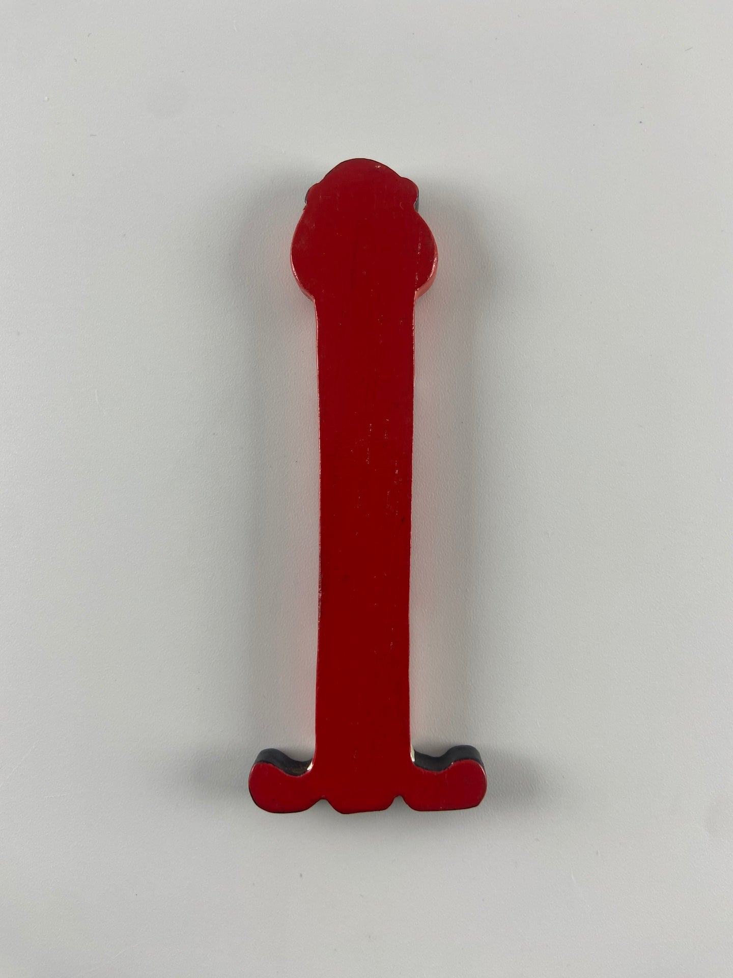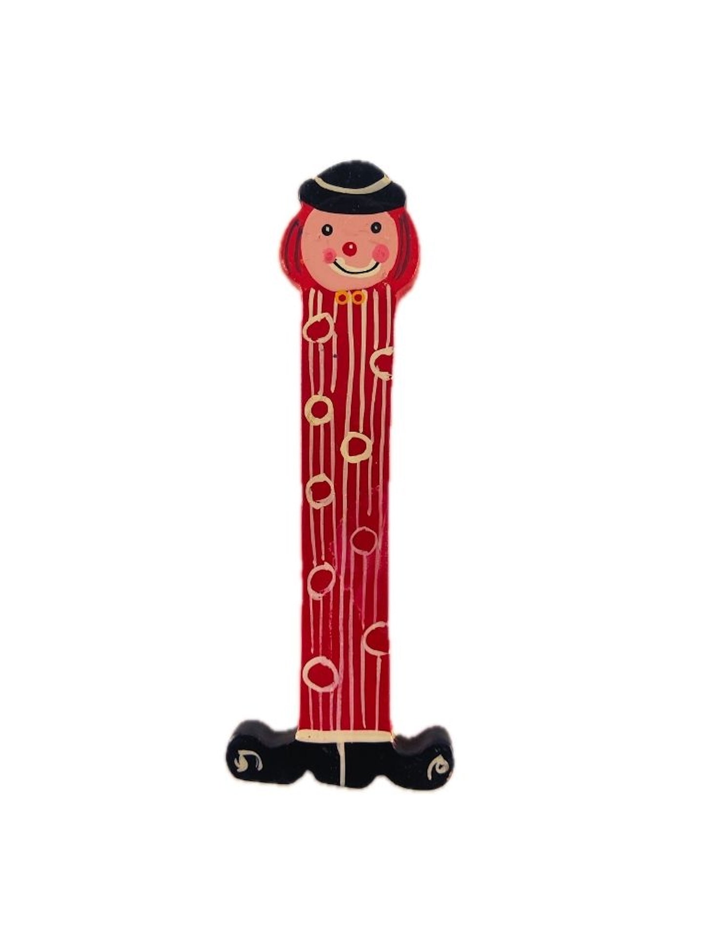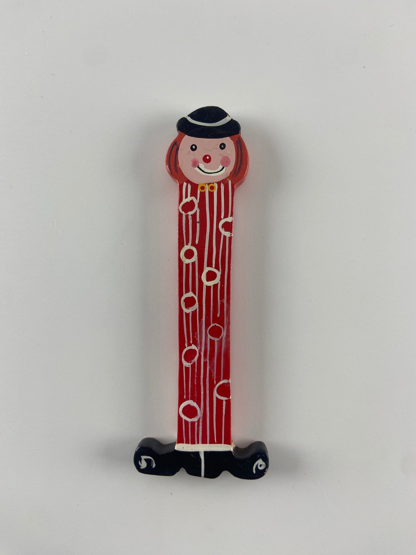 Letra de madeira pintada com pés e cabeça de palhaço.