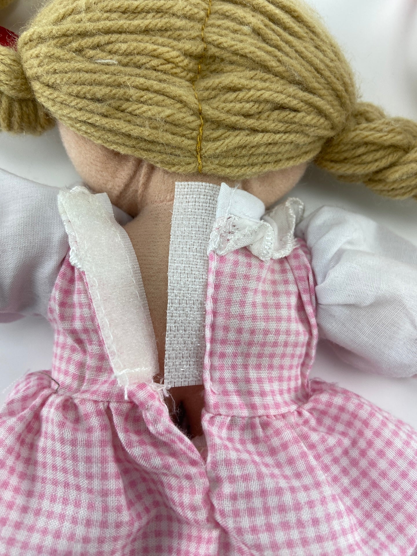 Boneca de pano com cabelo de lã. Vestido, calças e avental amovíveis para a criança poder vestir e despir a boneca.