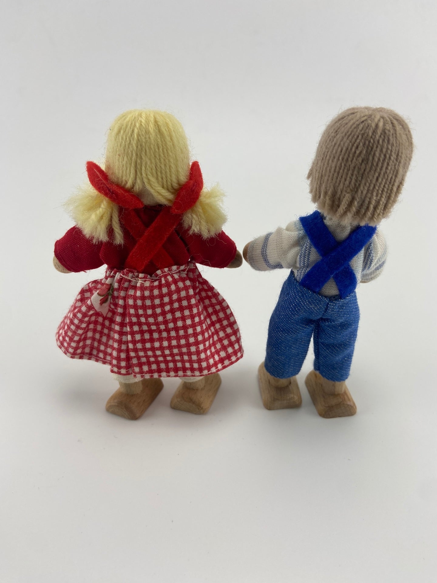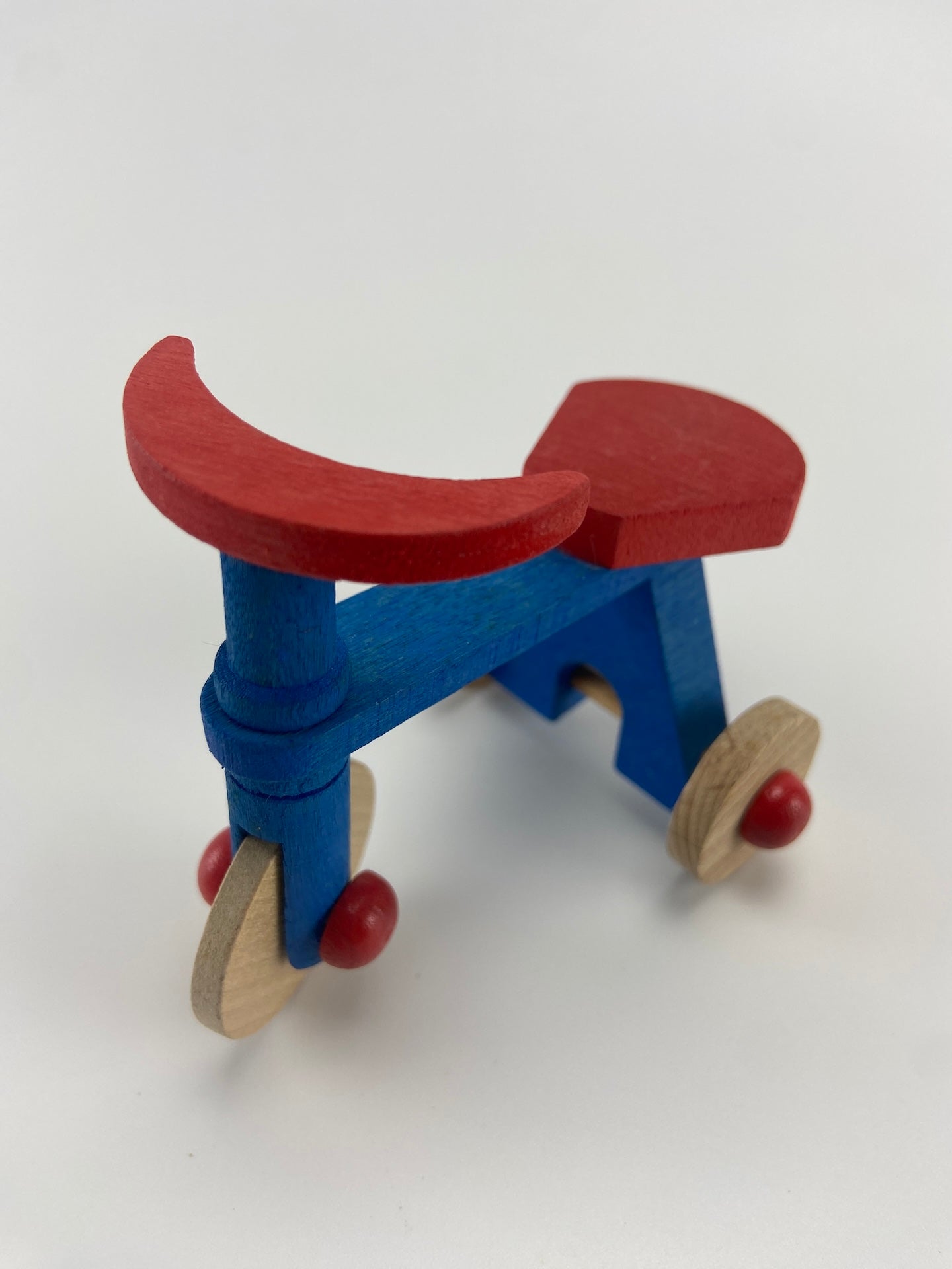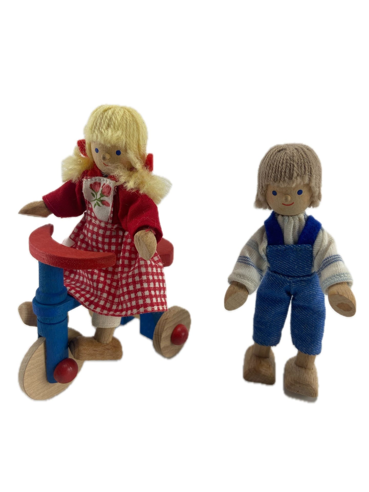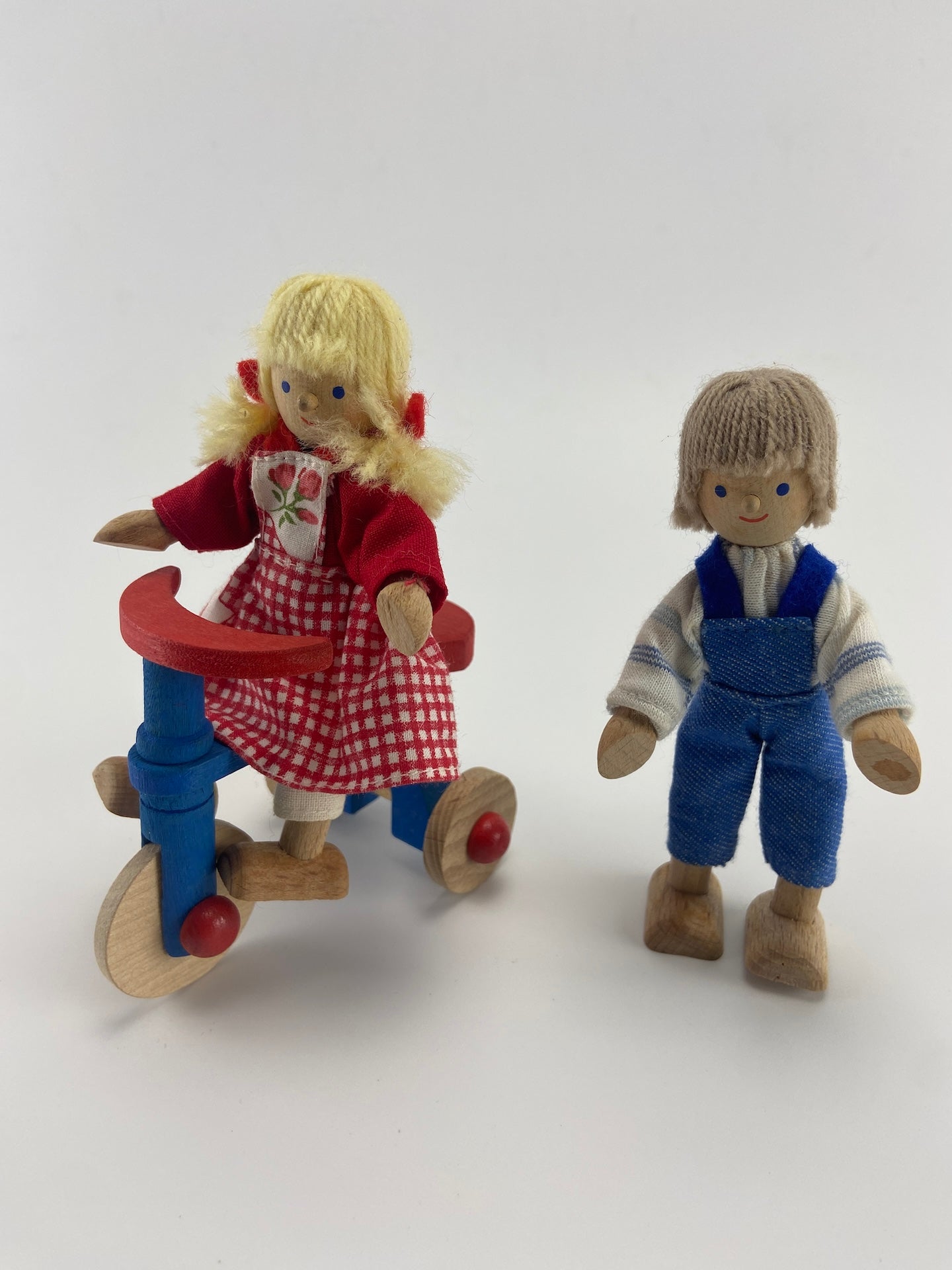 Miniatura de triciclo de madeira com conjunto de bonecos em tecido e madeira.