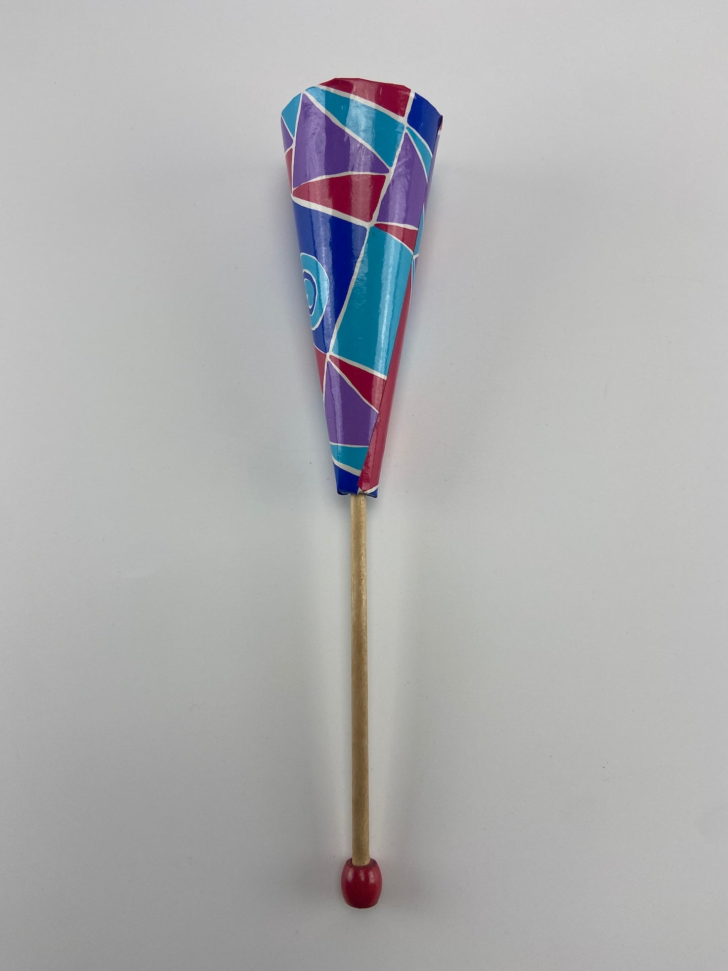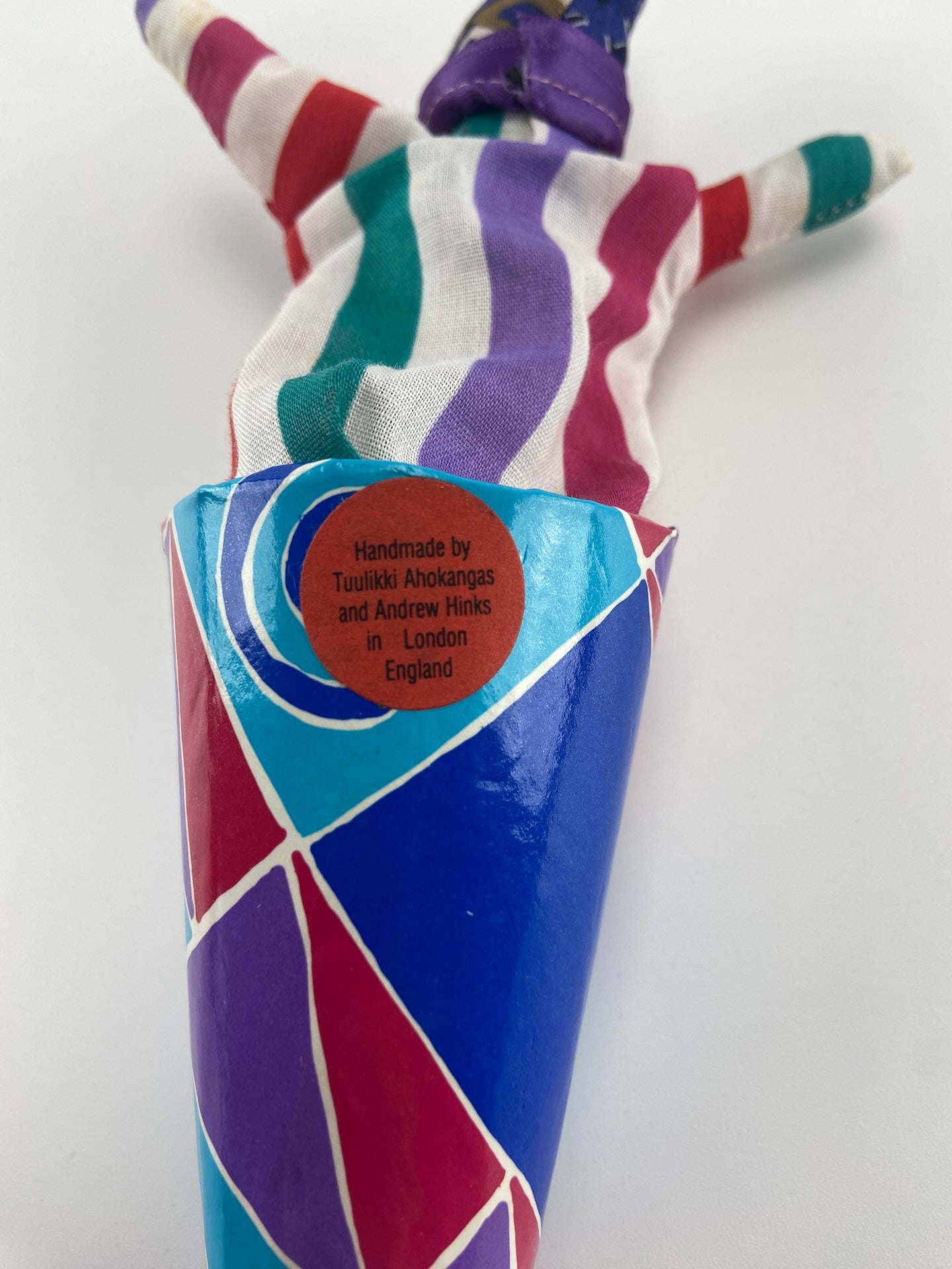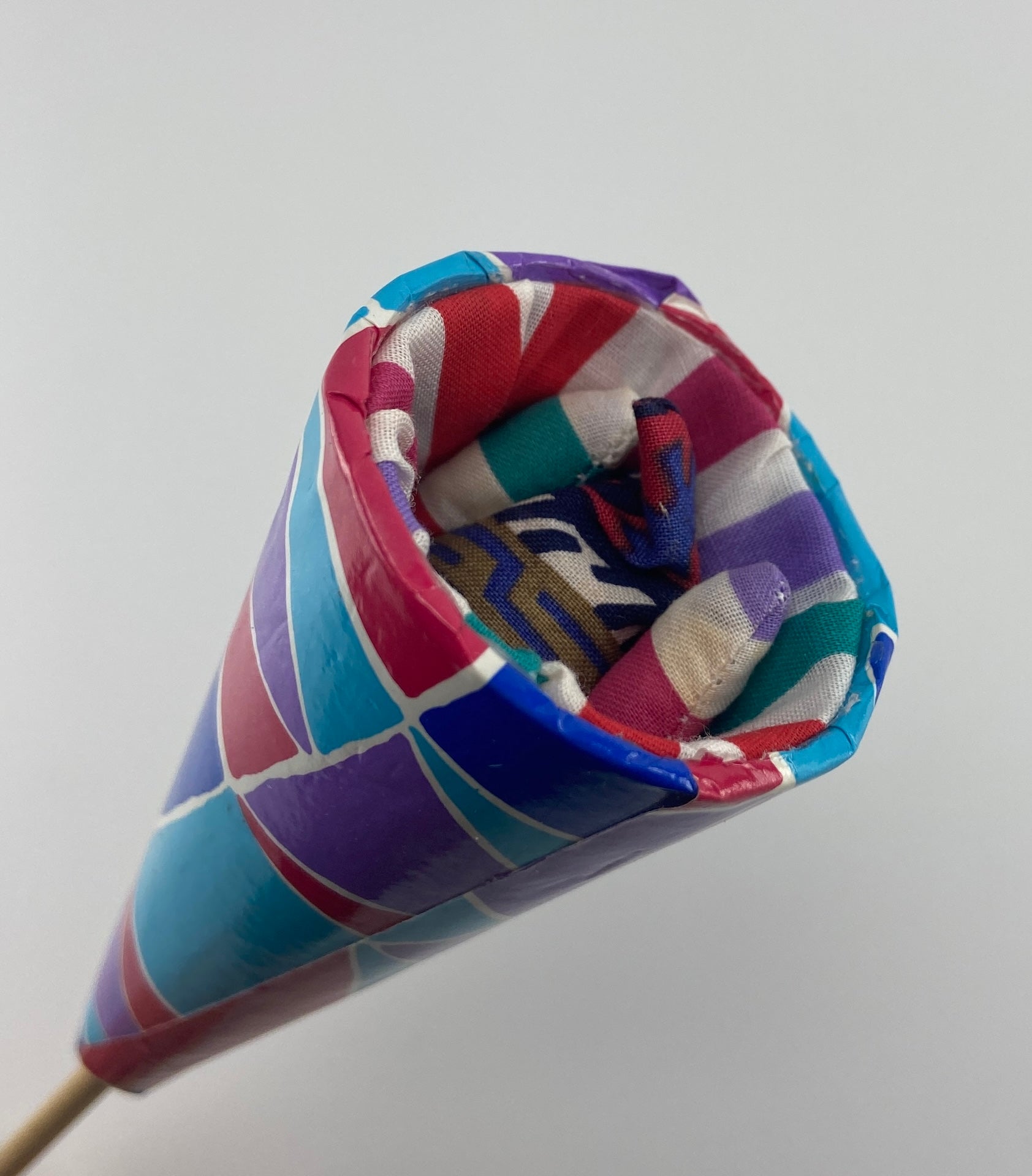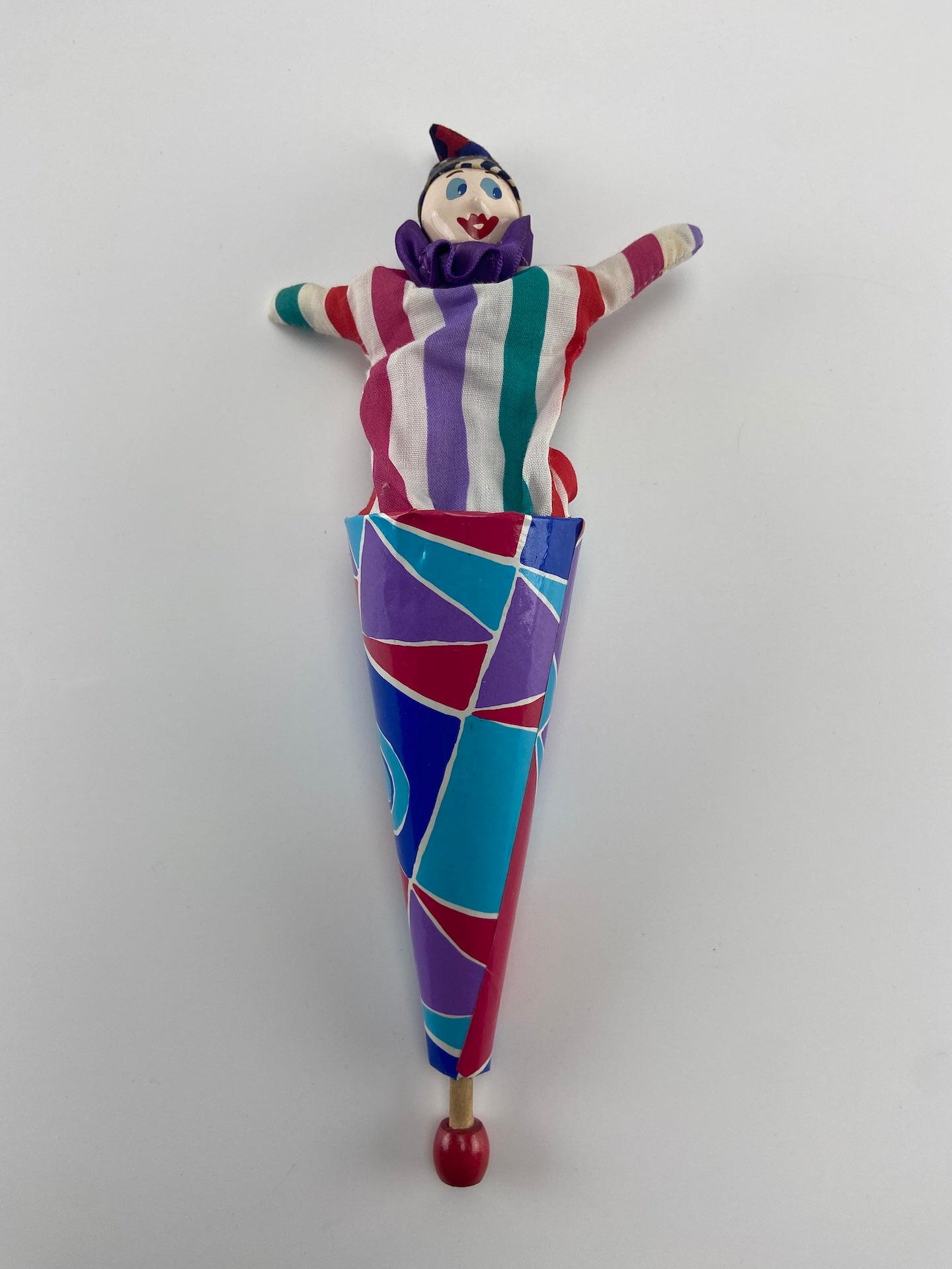 Fantoche pop-up em tecido. Cone de cartão e tecido. Eixo e cabeça em madeira pintada.