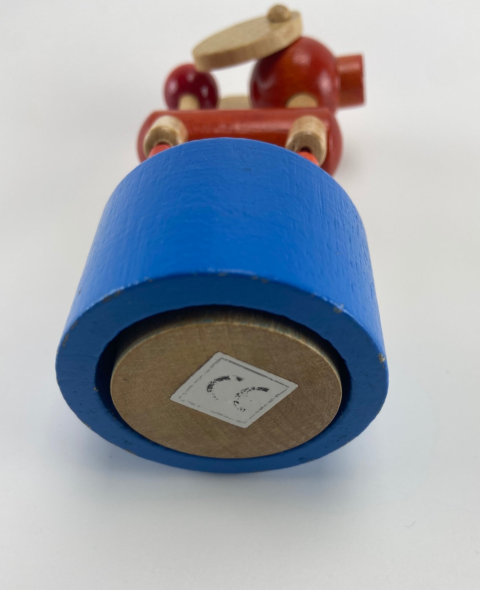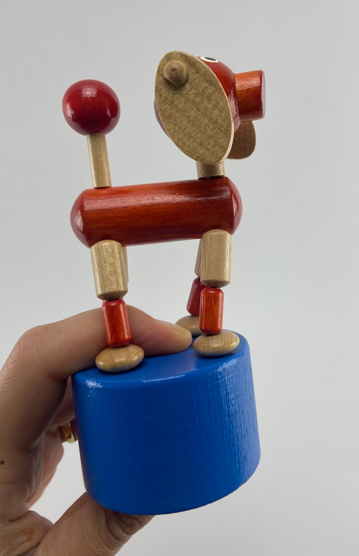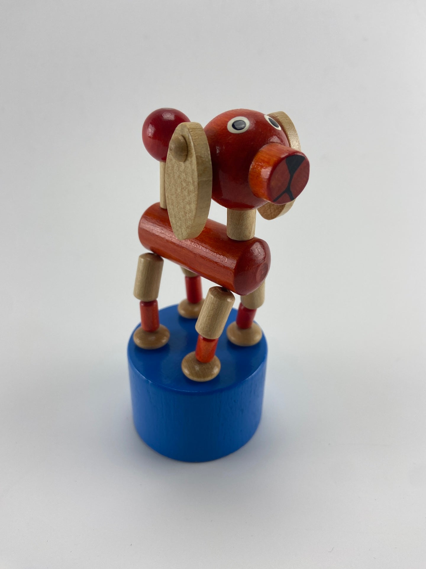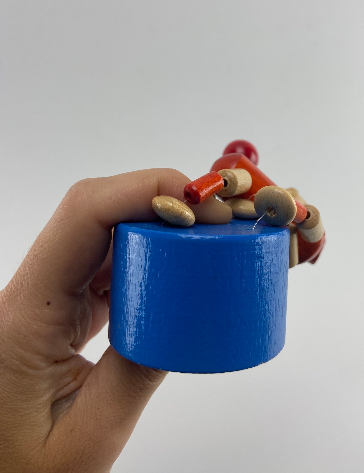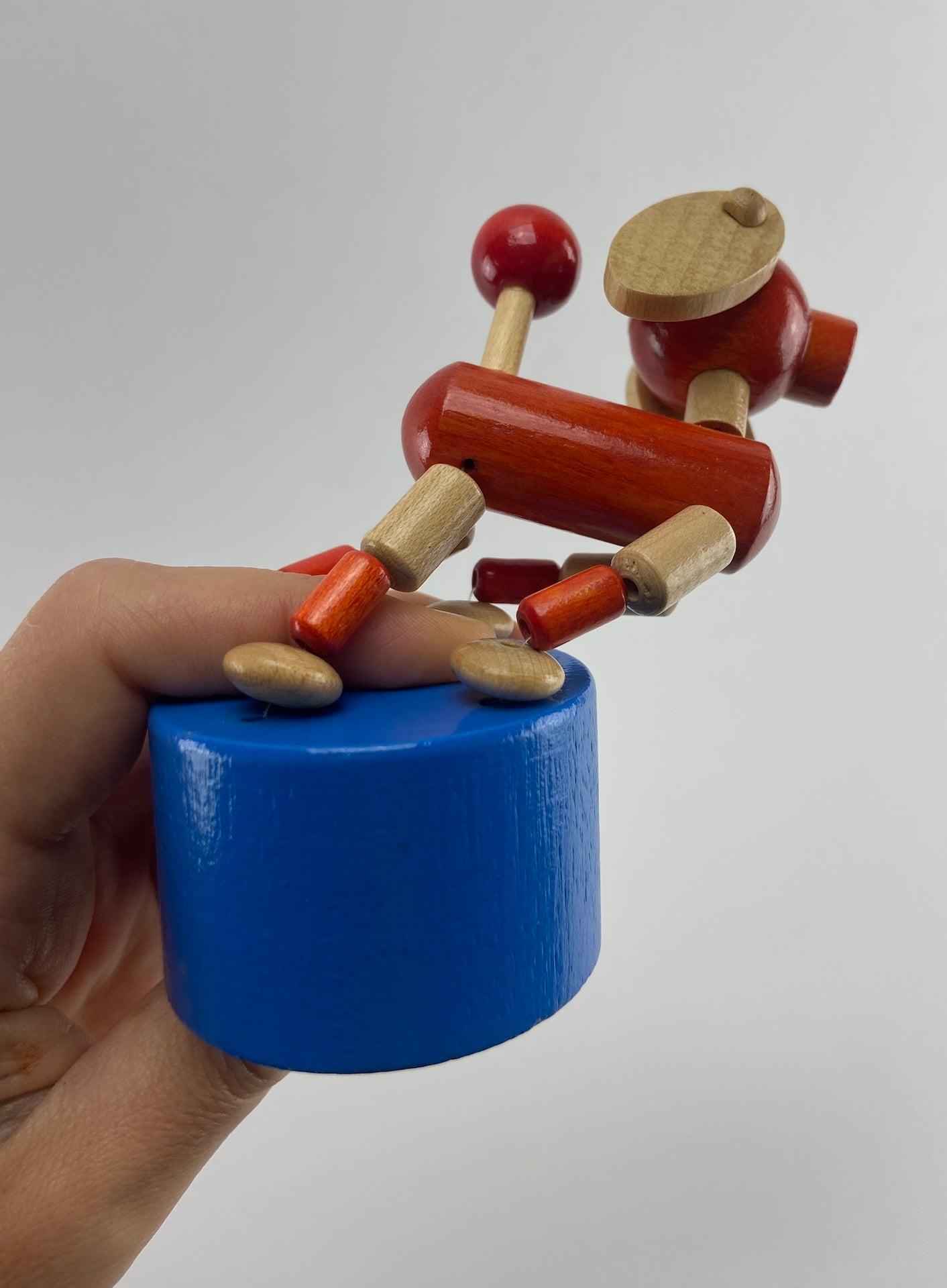 Figura articulada em madeira. Quando a base é pressionada a figura perde a verticalidade.