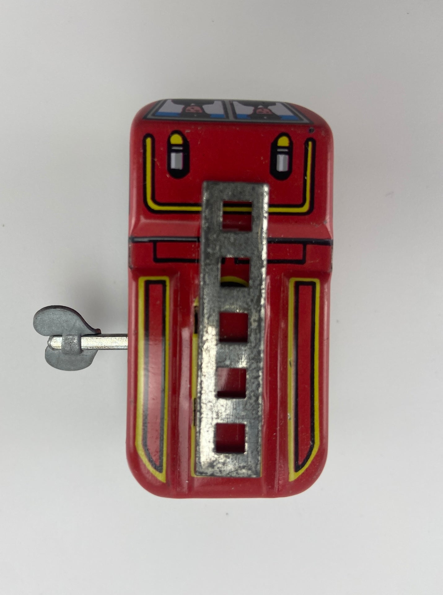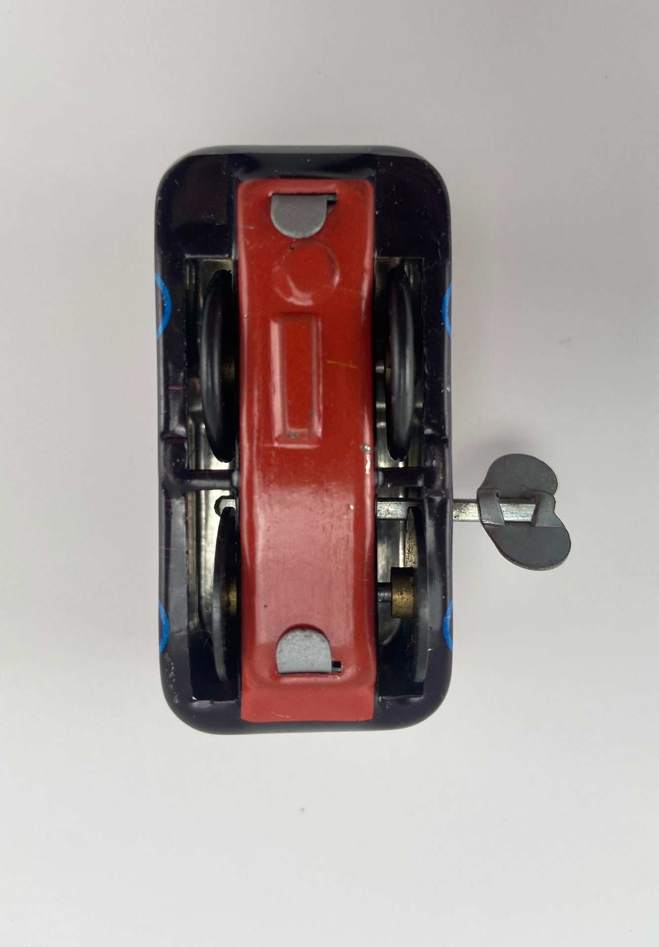 Brinquedo em folha de metal com rodas e sistema de corda para andar.