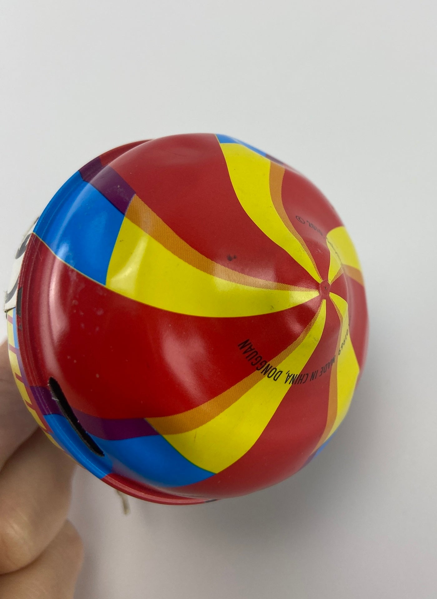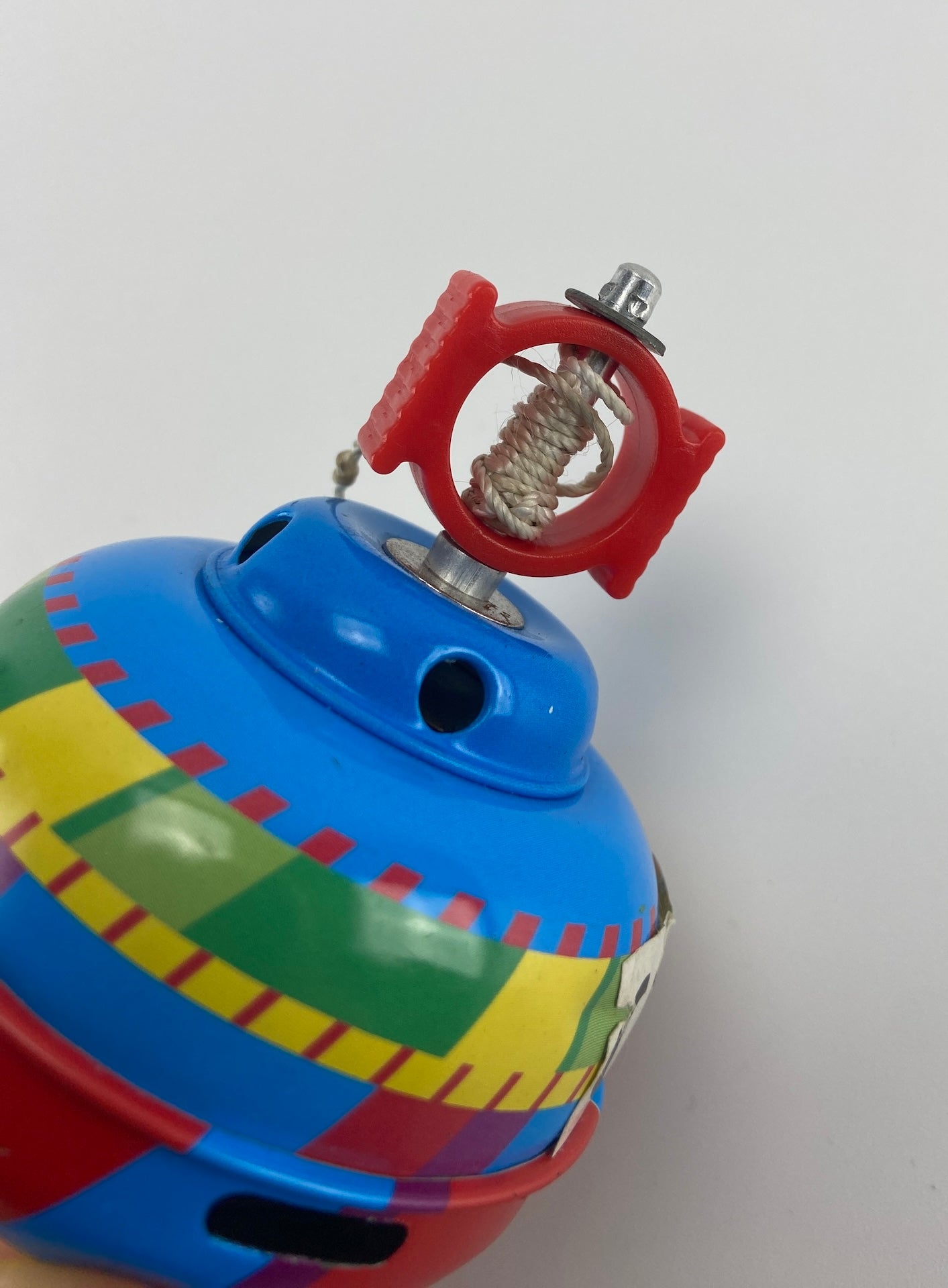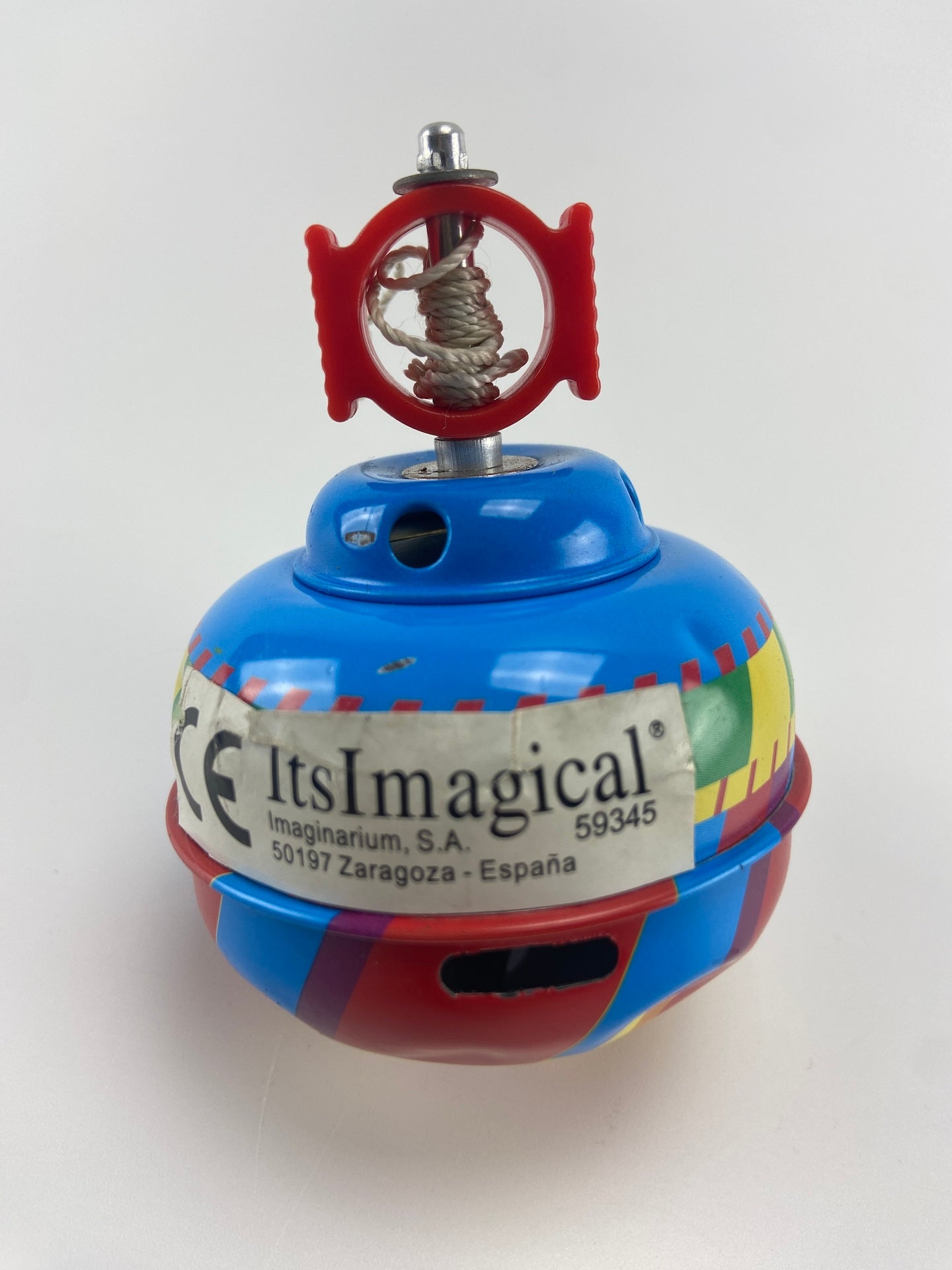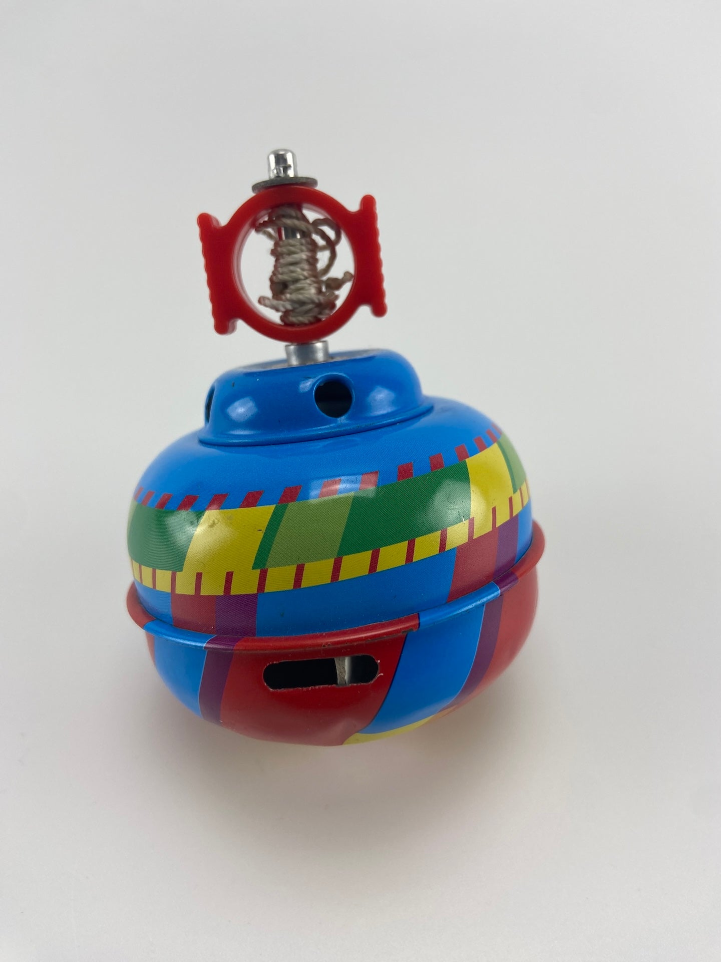 Pião em folha de metal com sitema de cordel para o pôr a rodar.