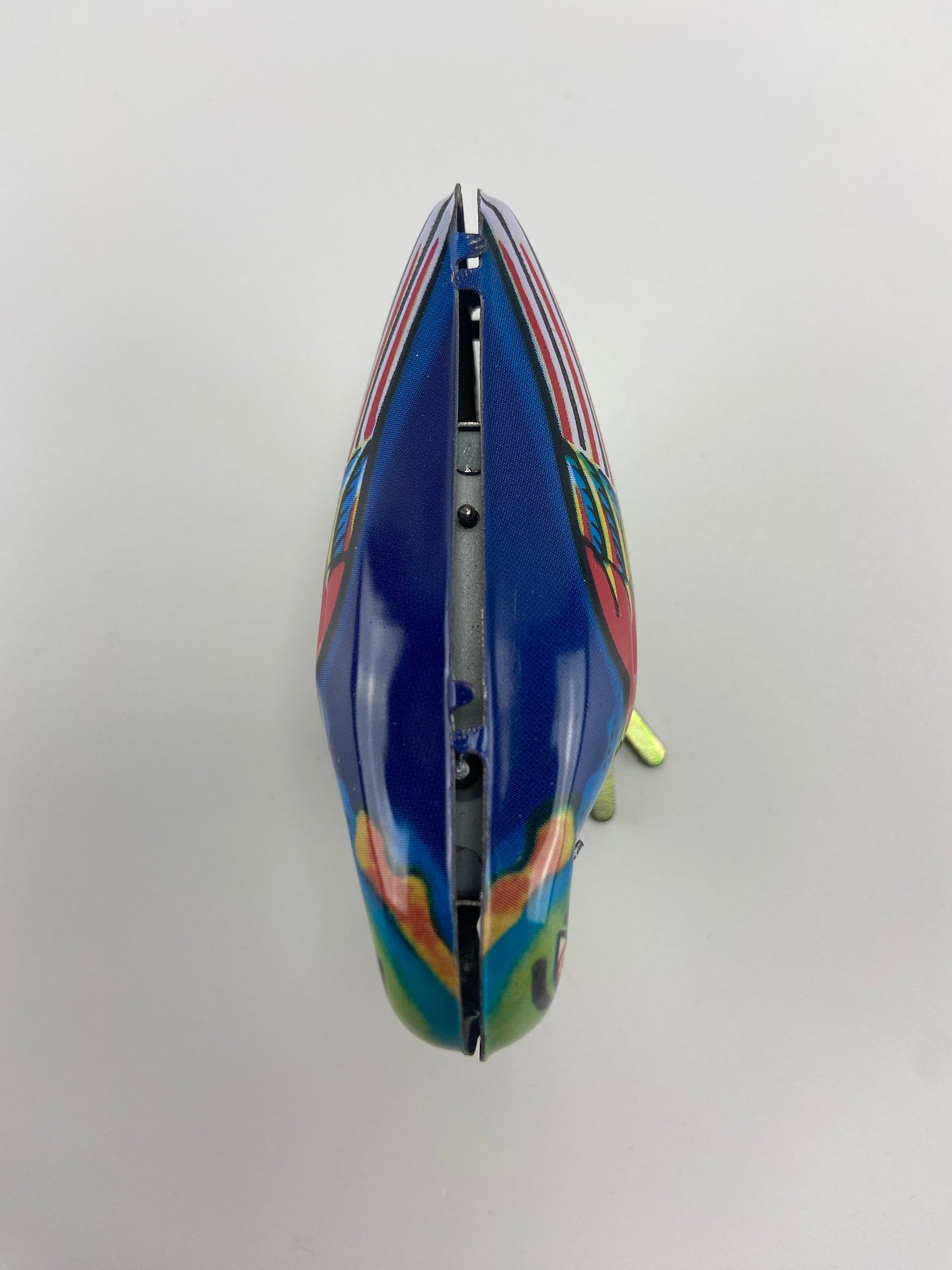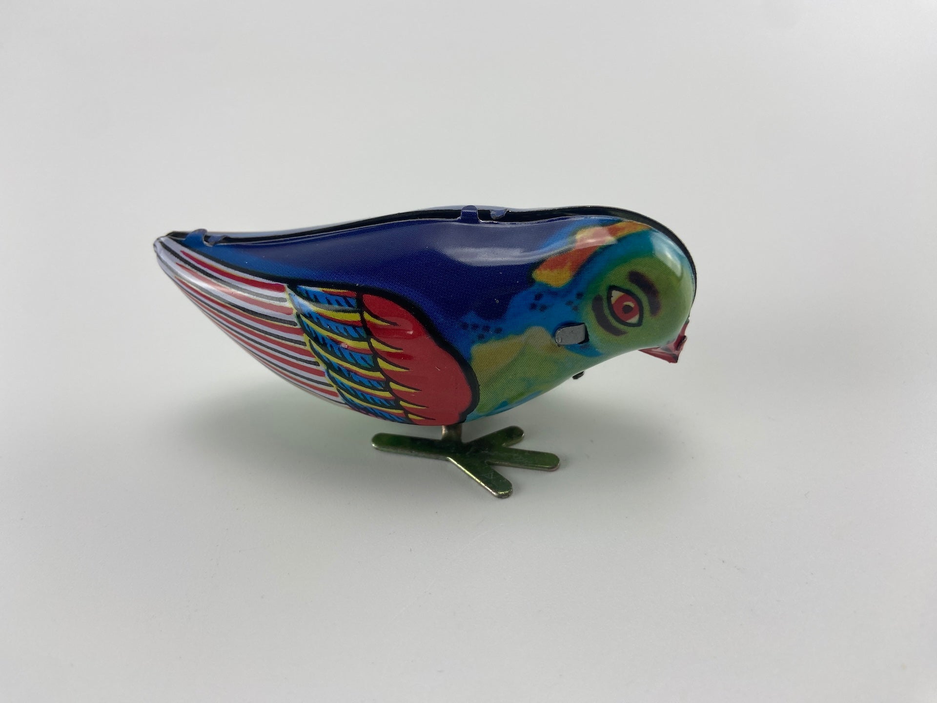 Brinquedo em folha de metal com sistema de corda para o passaro saltar. ATENÇÃO! Artigo de colecionador não adequado a crianças.