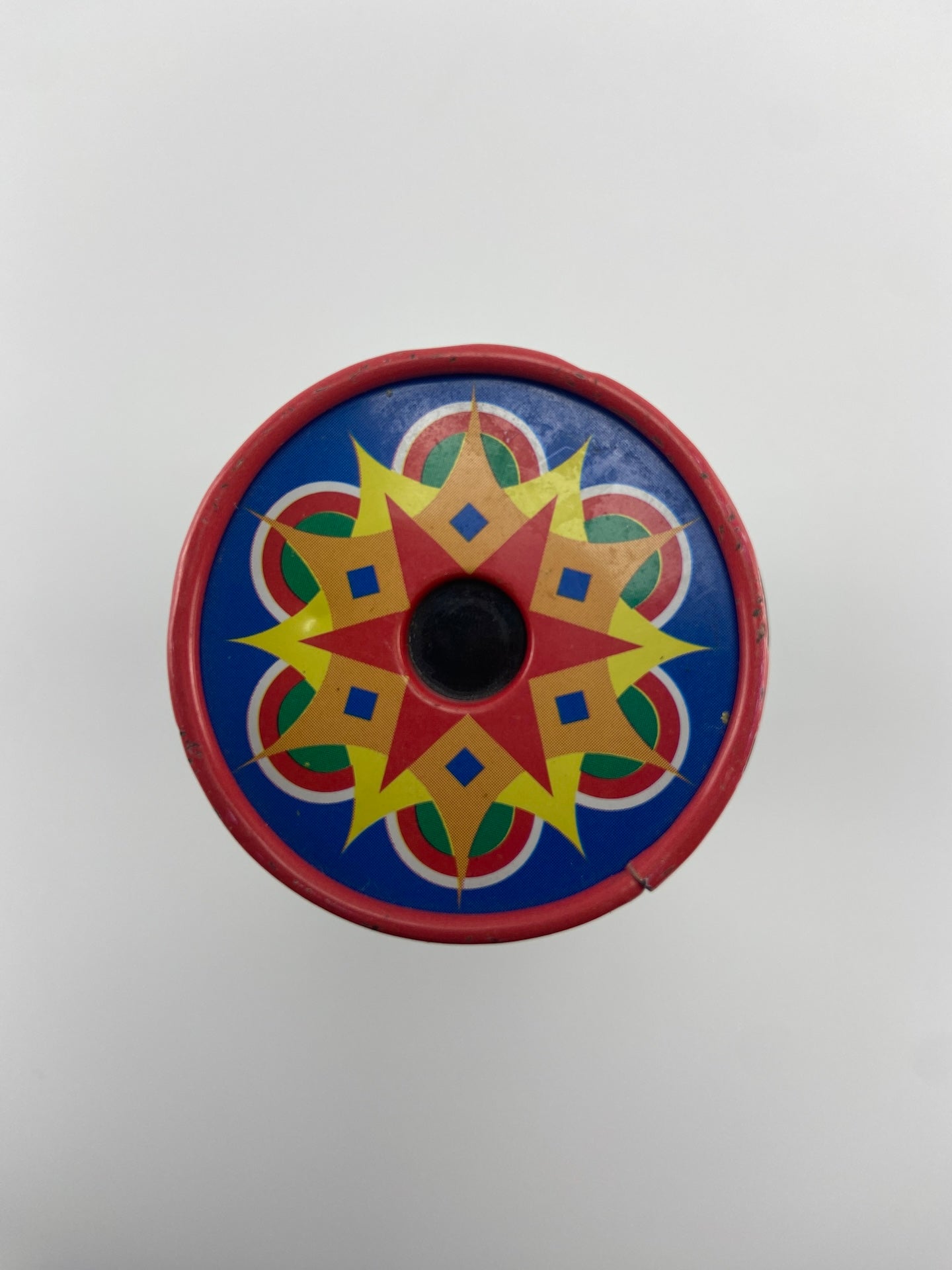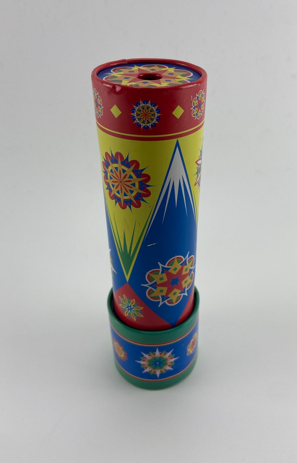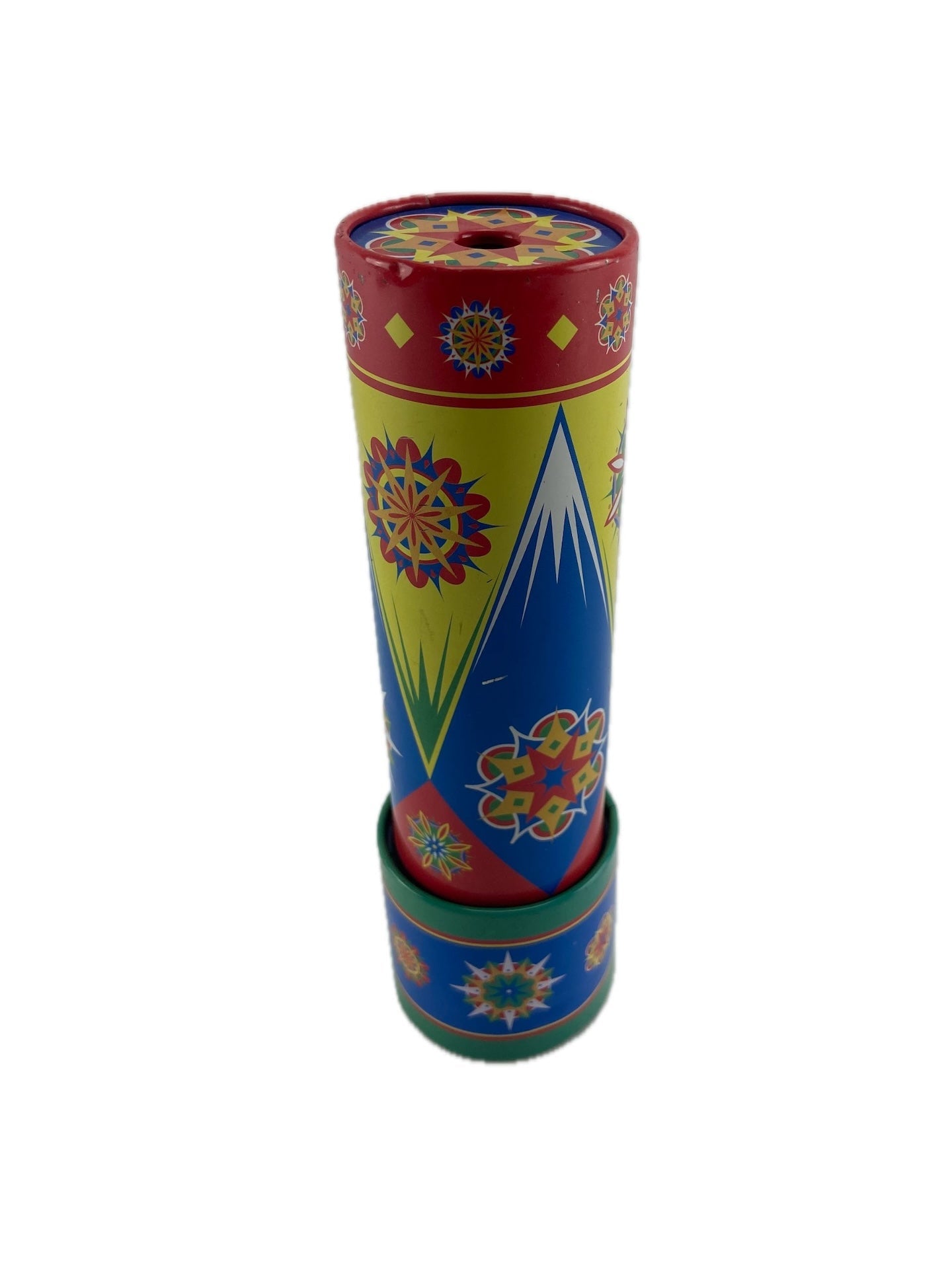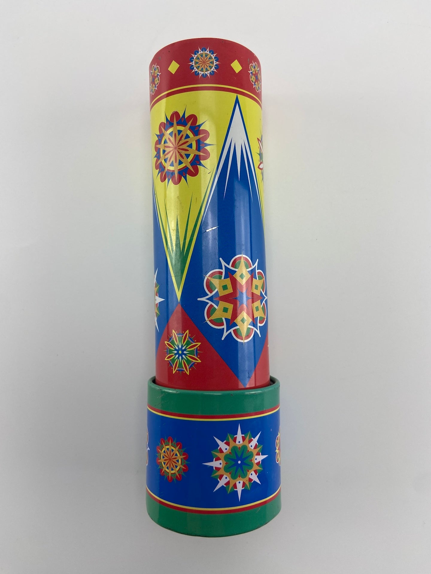 Brinquedo clássico em folha de metal. Espreitando pelo orificio, pode observar padrões geométricos que se vão alterando à medida que vai rodando.