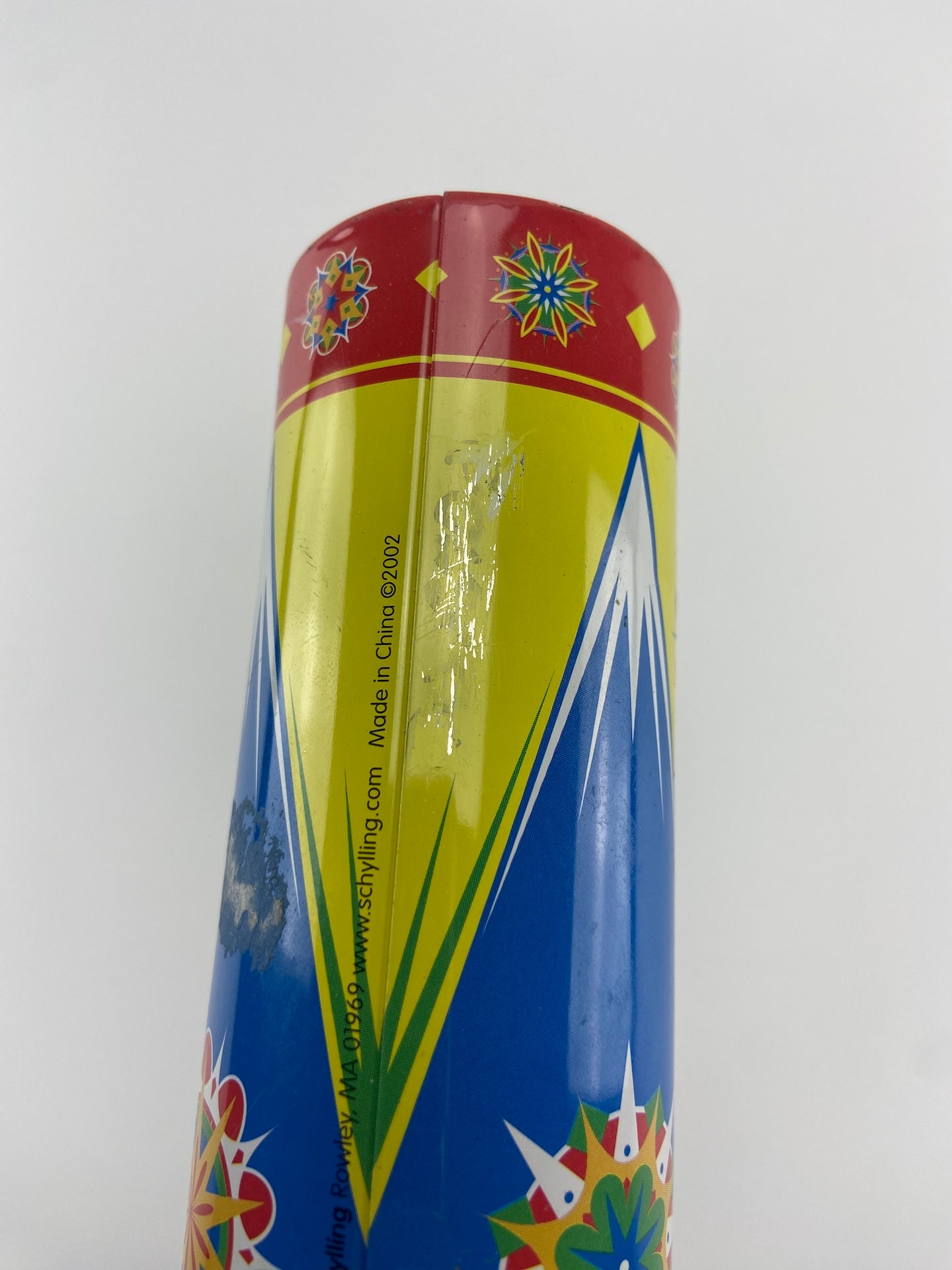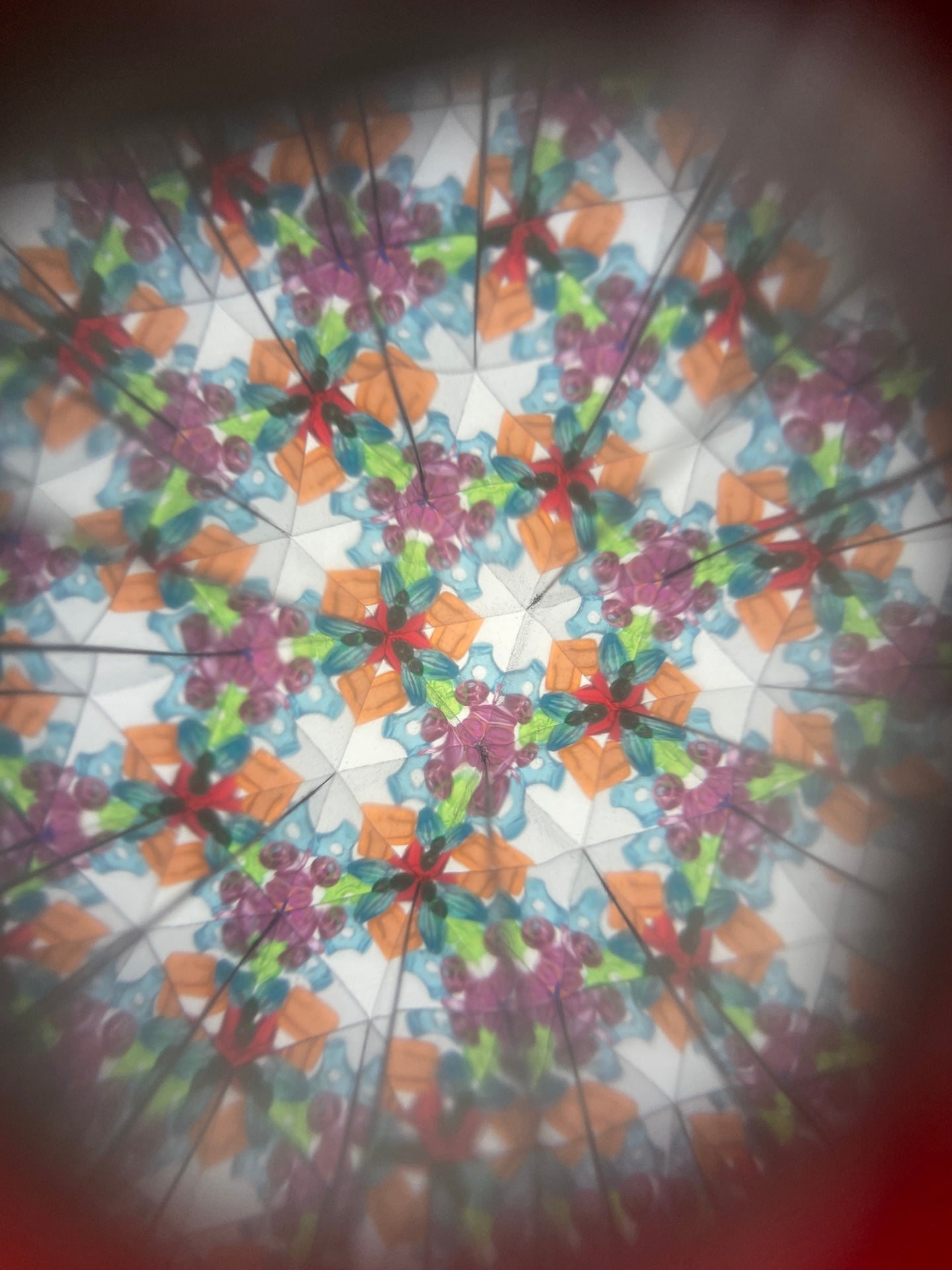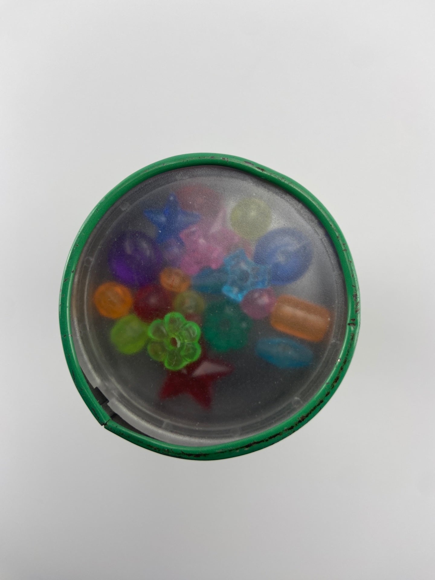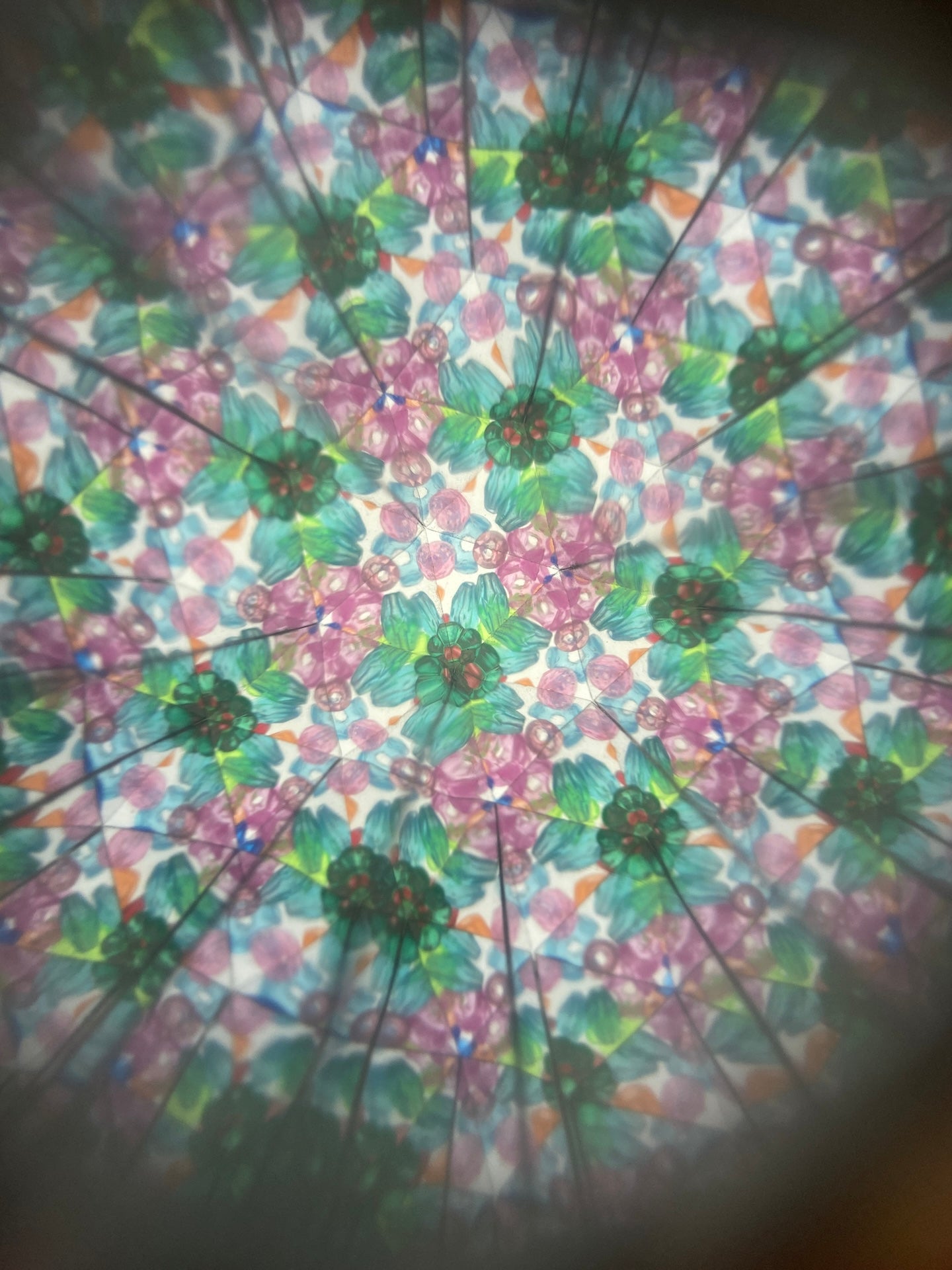 Brinquedo clássico em folha de metal. Espreitando pelo orificio, pode observar padrões geométricos que se vão alterando à medida que vai rodando.