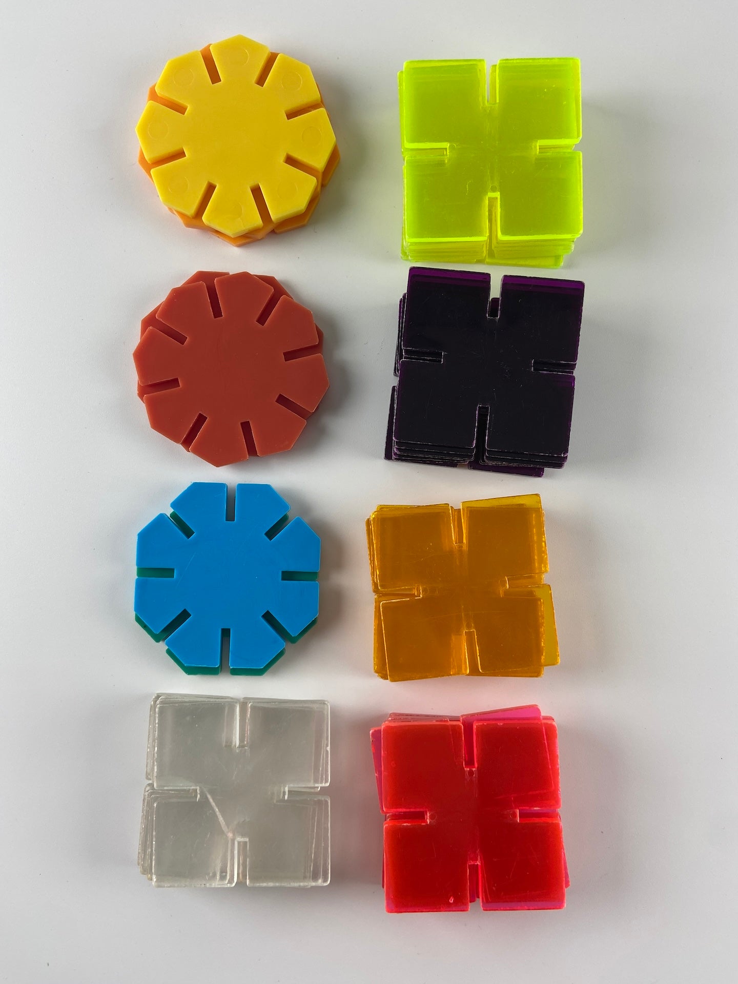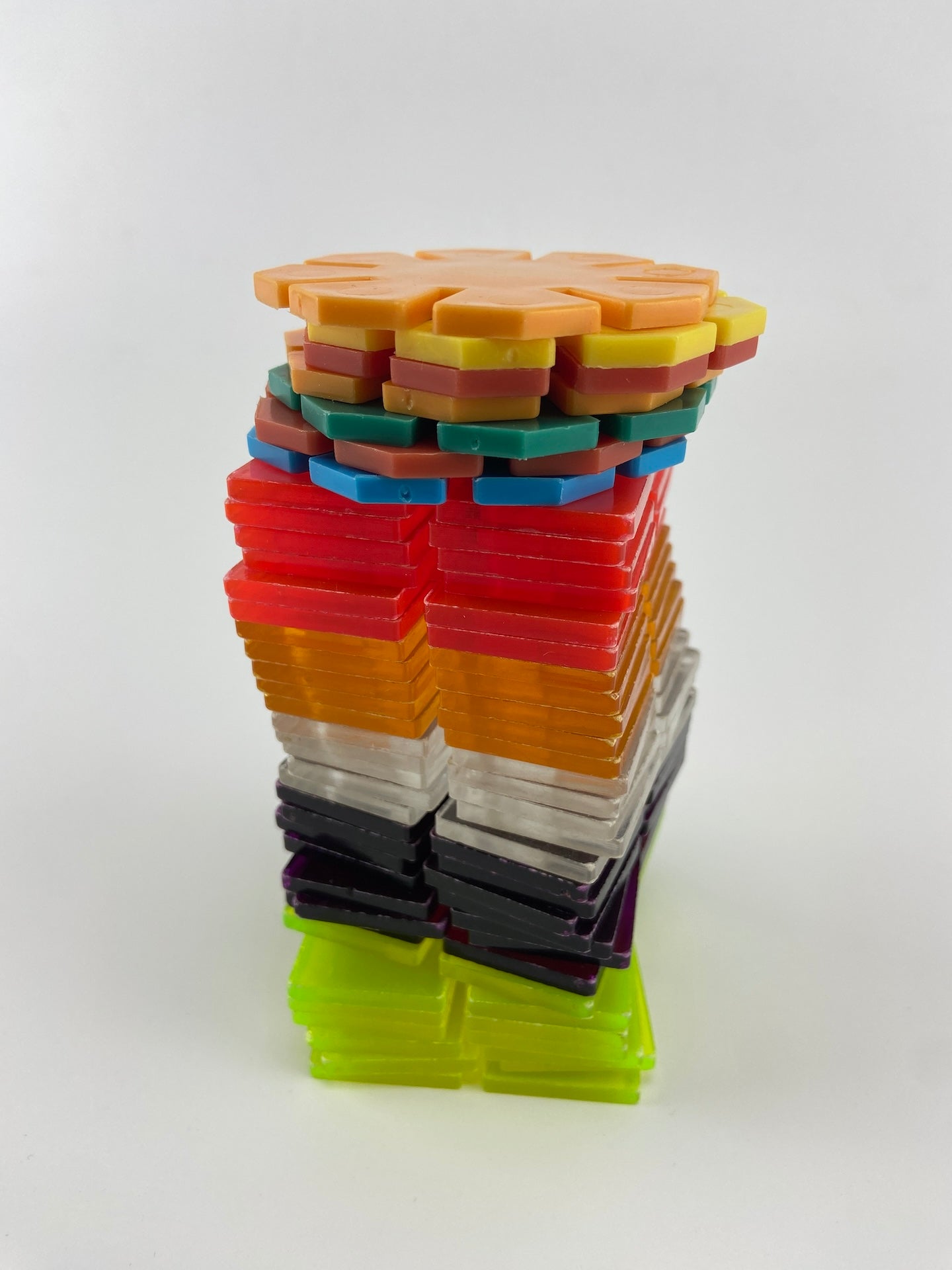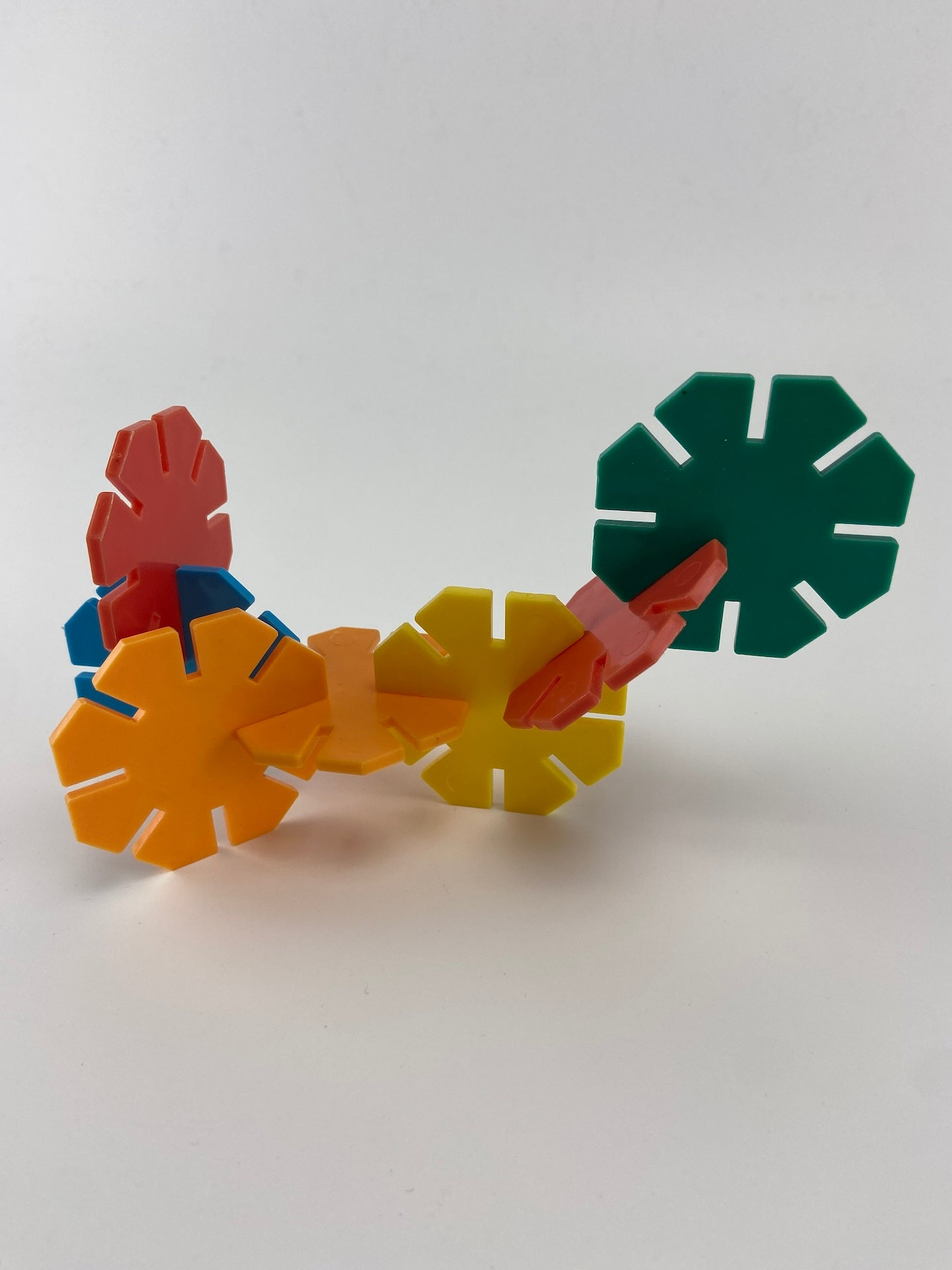 Conjunto de peças de brinquedo clássico. Peças de plástico rígido com ranhura para serem encaixadas umas nas outras.