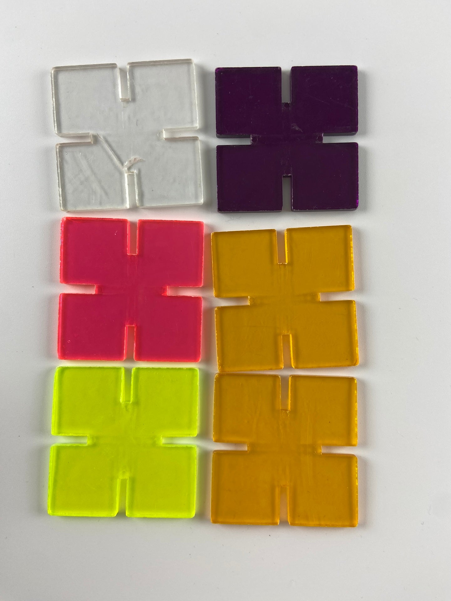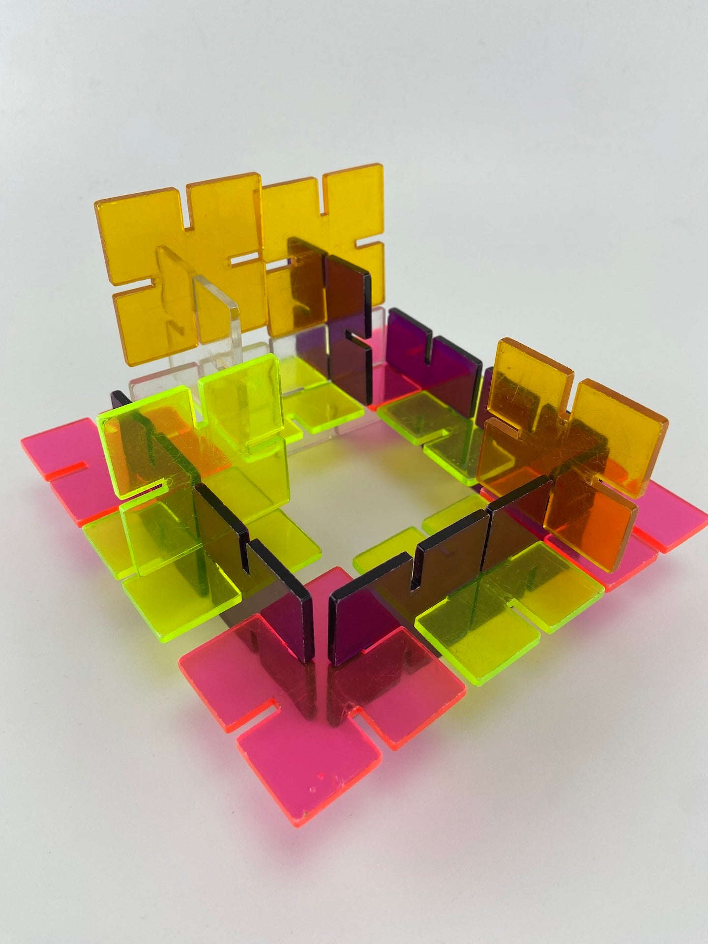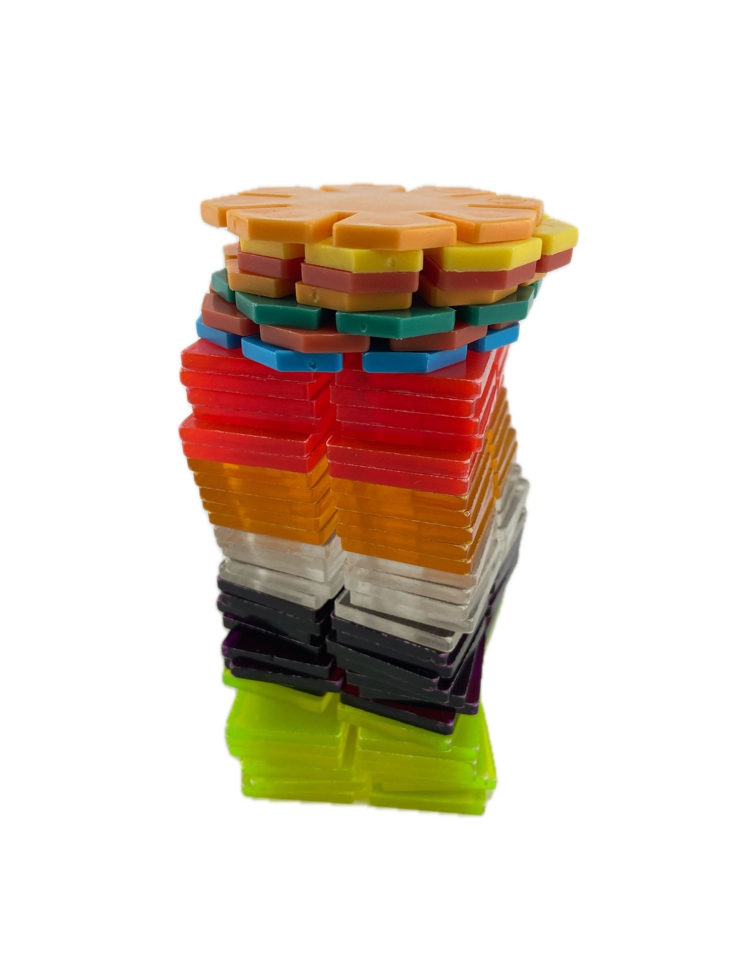 Conjunto de peças de brinquedo clássico. Peças de plástico rígido com ranhura para serem encaixadas umas nas outras.