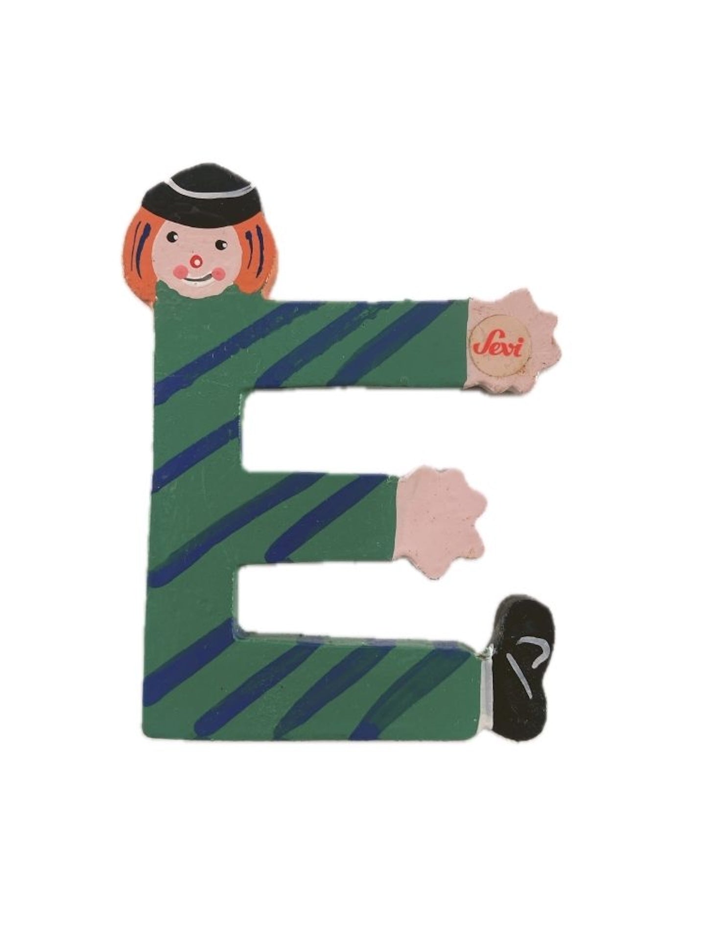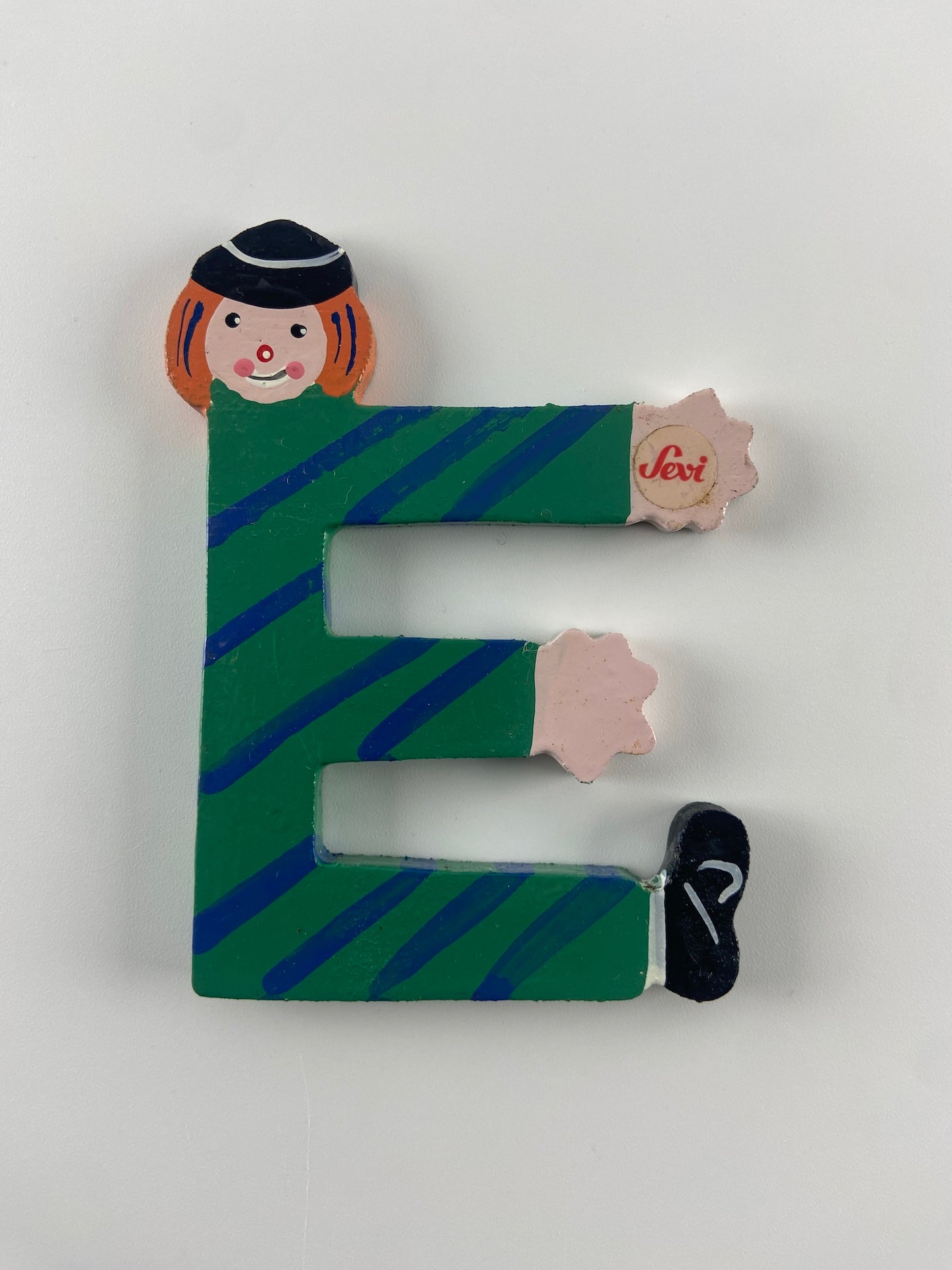 Letra de madeira pintada com pés e cabeça de palhaço.