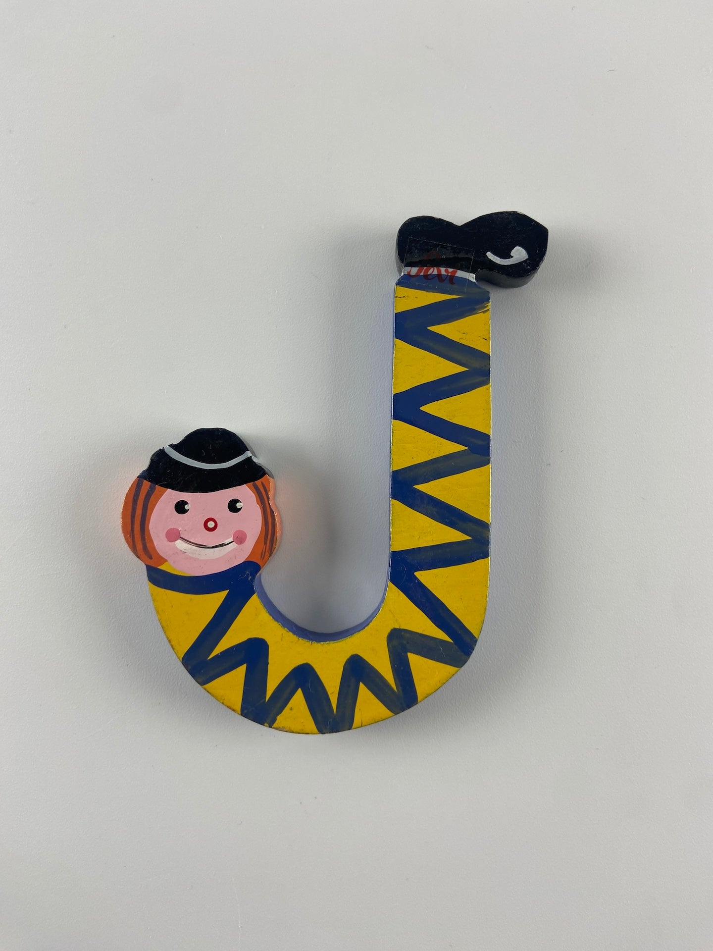 Letra de madeira pintada com pés e cabeça de palhaço.