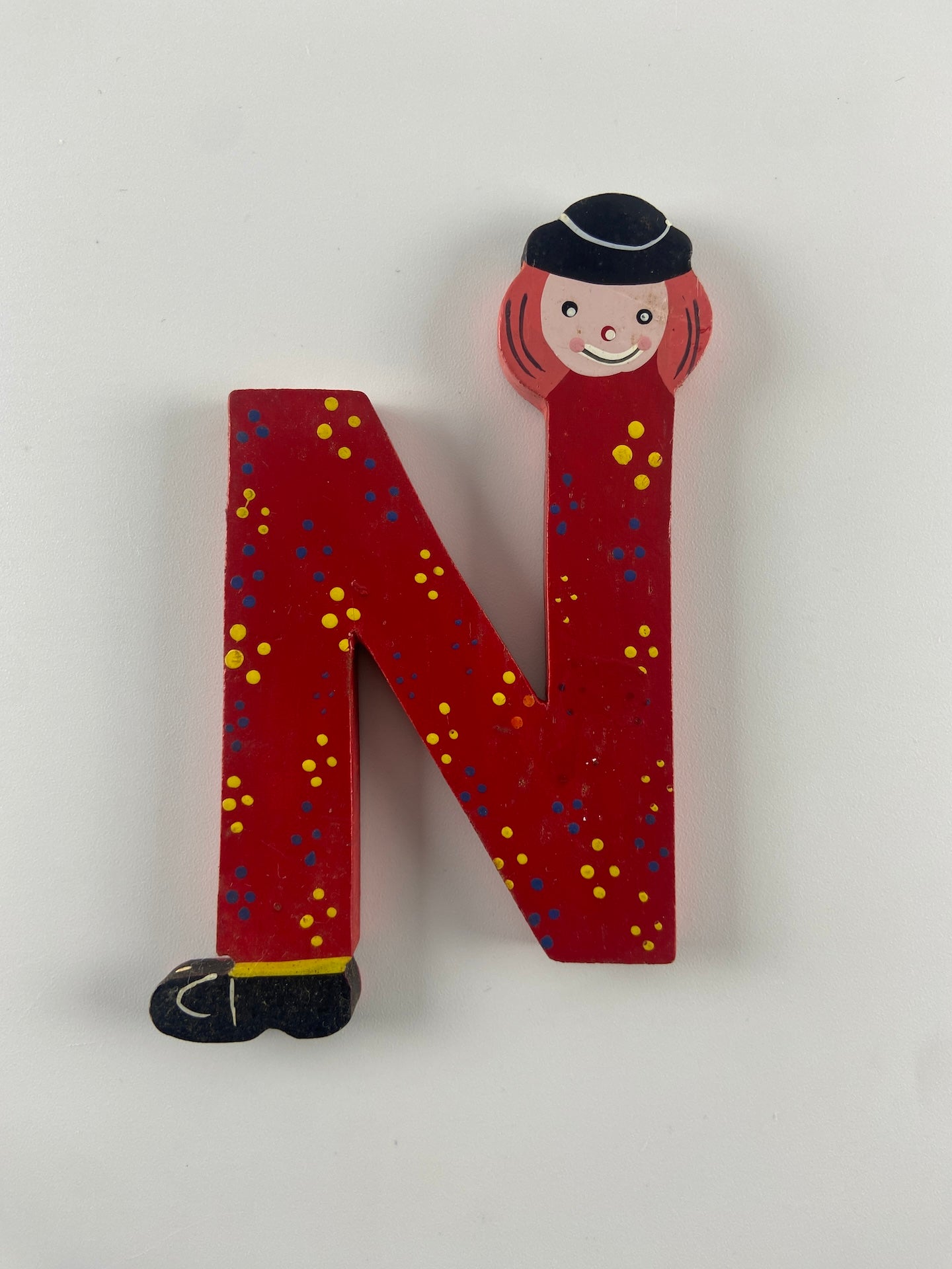 Letra de madeira pintada com pés e cabeça de palhaço.