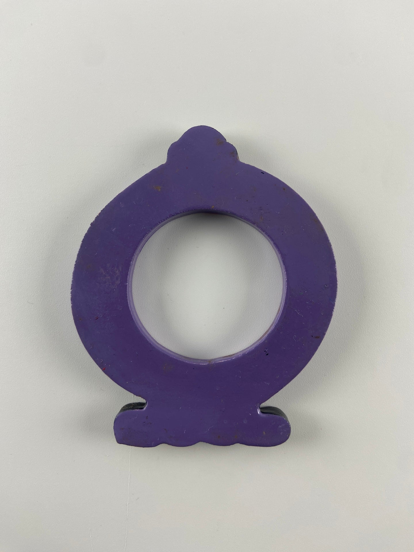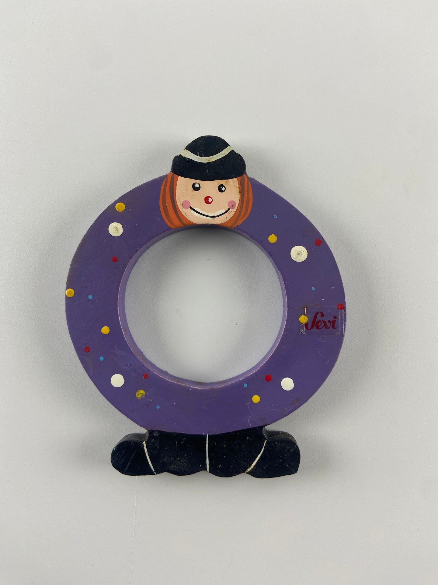 Letra de madeira pintada com pés e cabeça de palhaço.