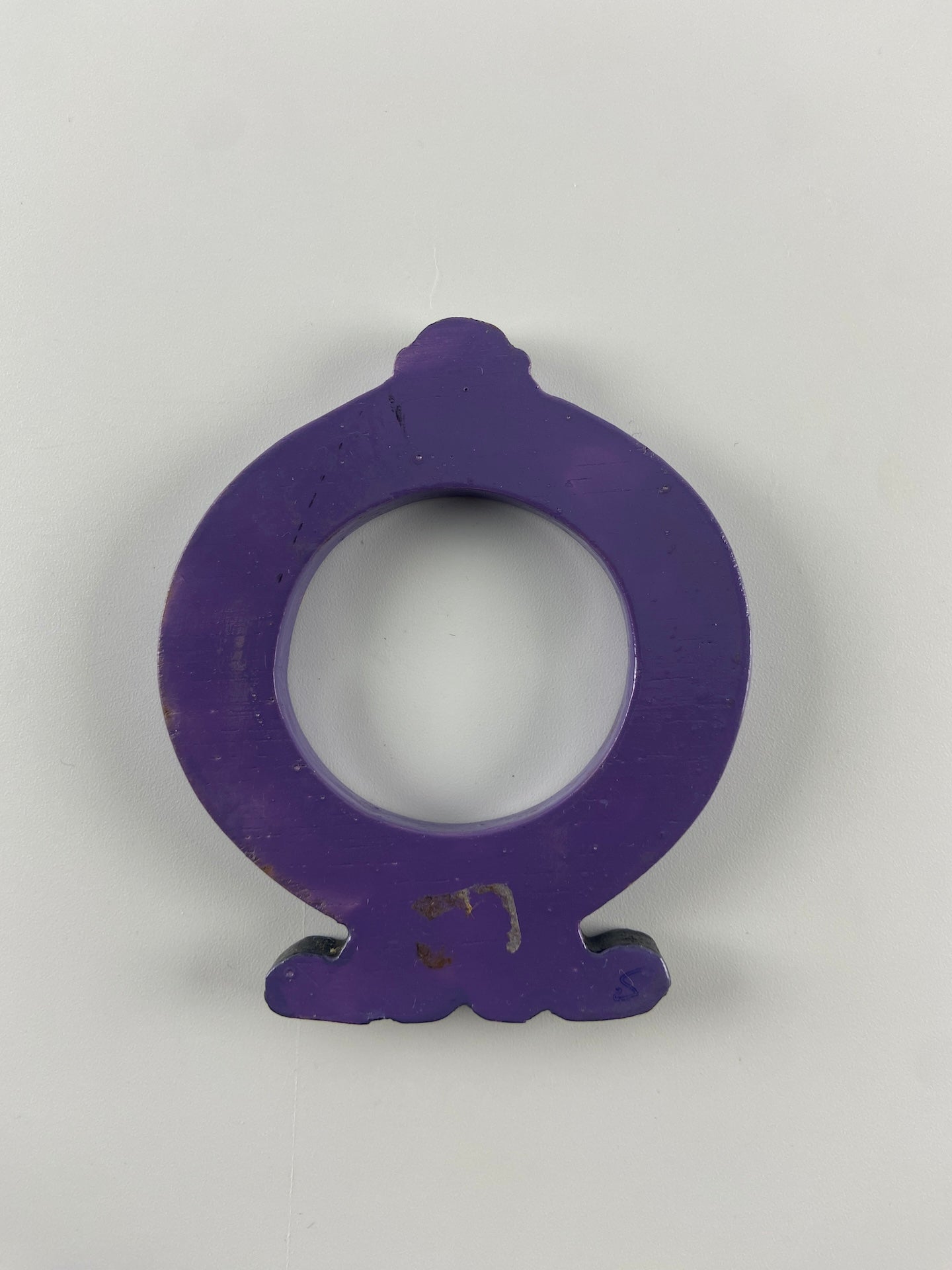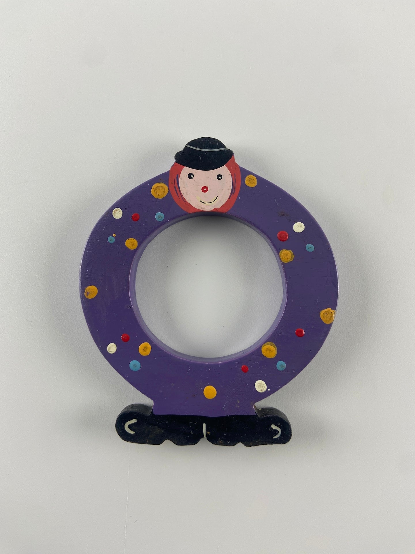 Letra de madeira pintada com pés e cabeça de palhaço.