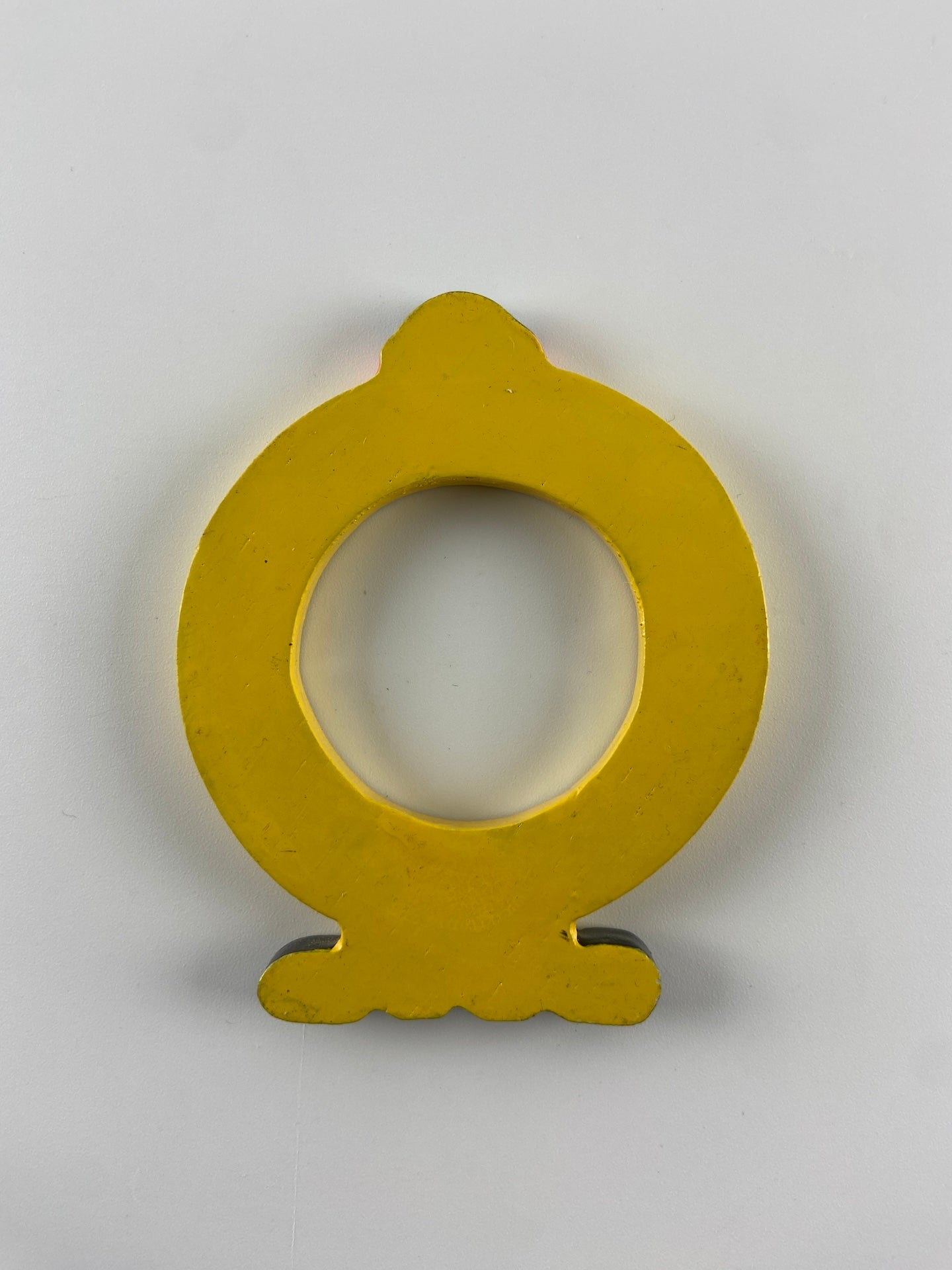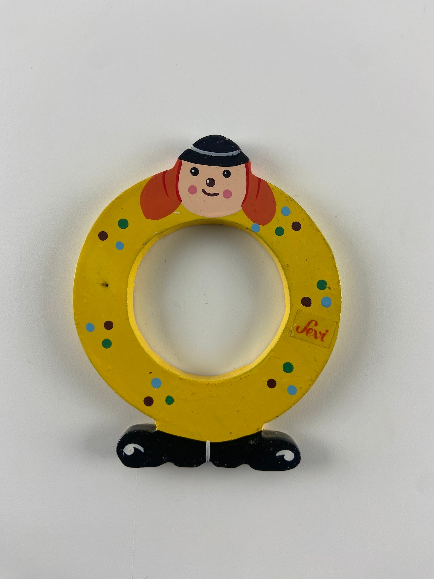 Letra de madeira pintada com pés e cabeça de palhaço.