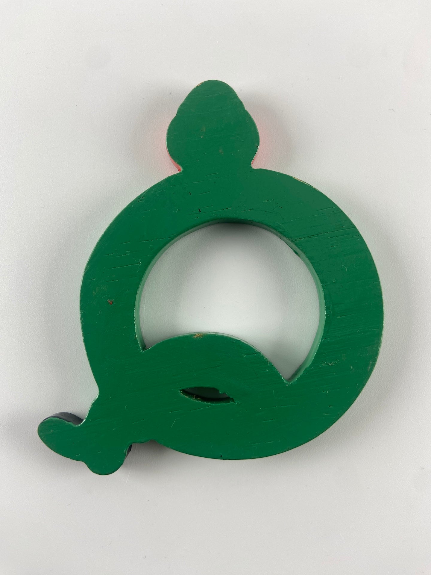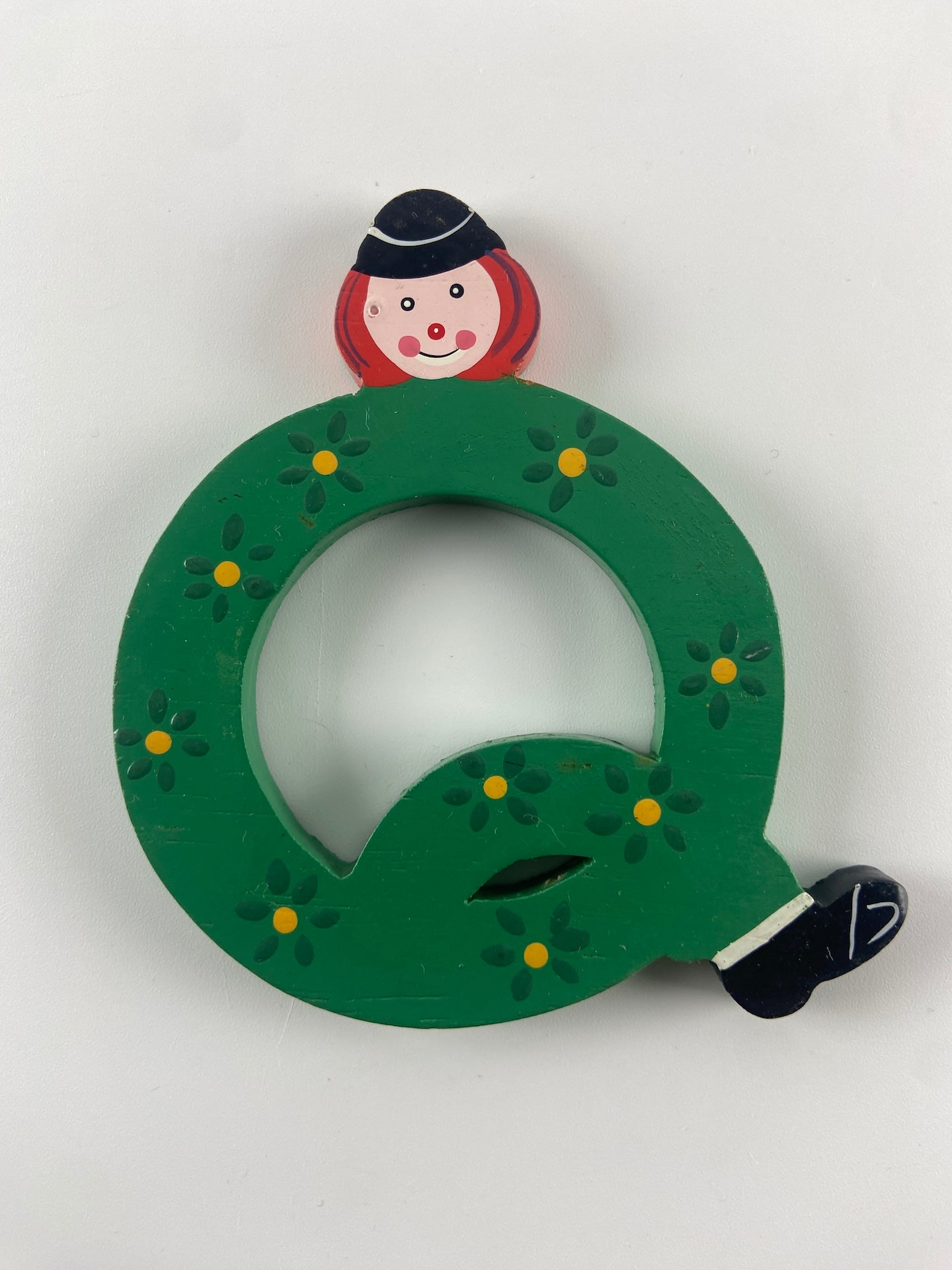 Letra de madeira pintada com pés e cabeça de palhaço.