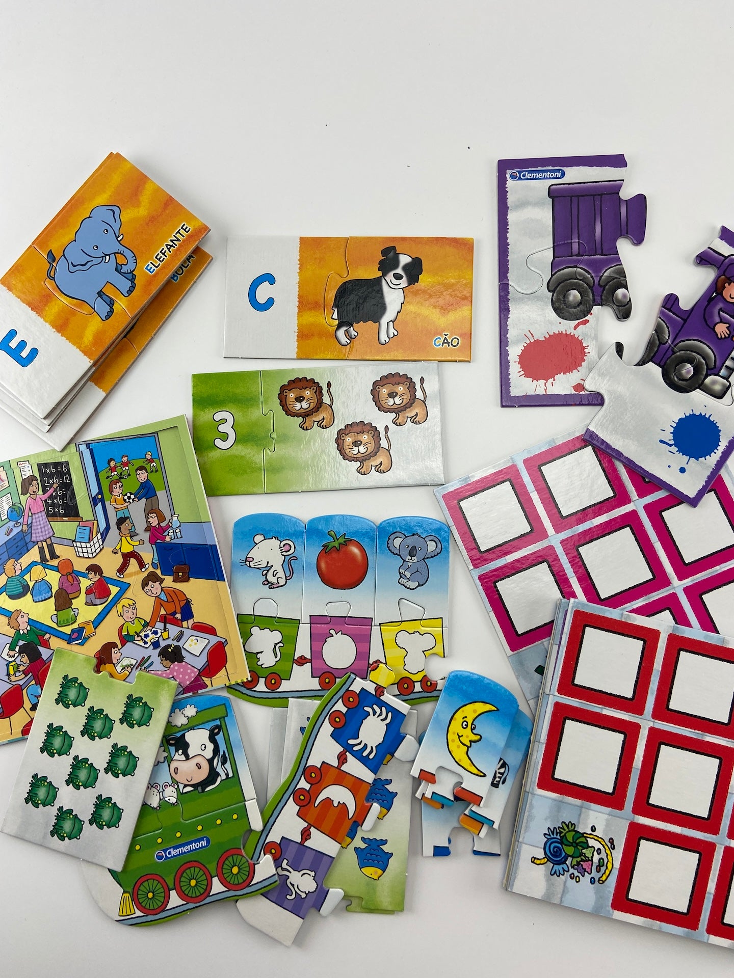 Jogo com puzzles de aprendizagem das cores, formas, números, quantidades, lógicas, estações do ano, alimentos, etc.