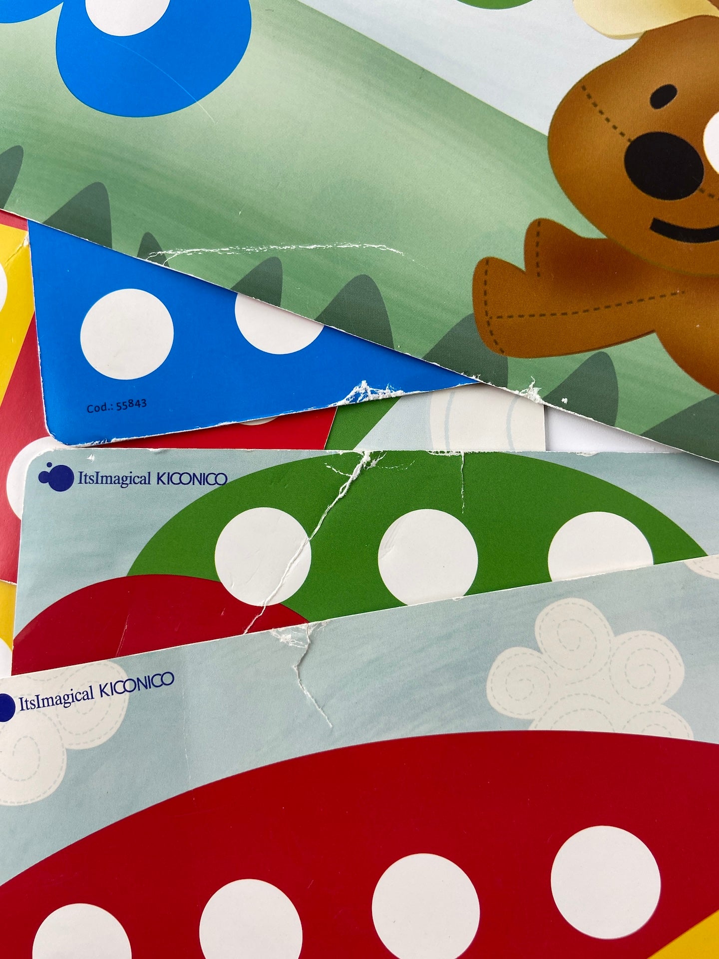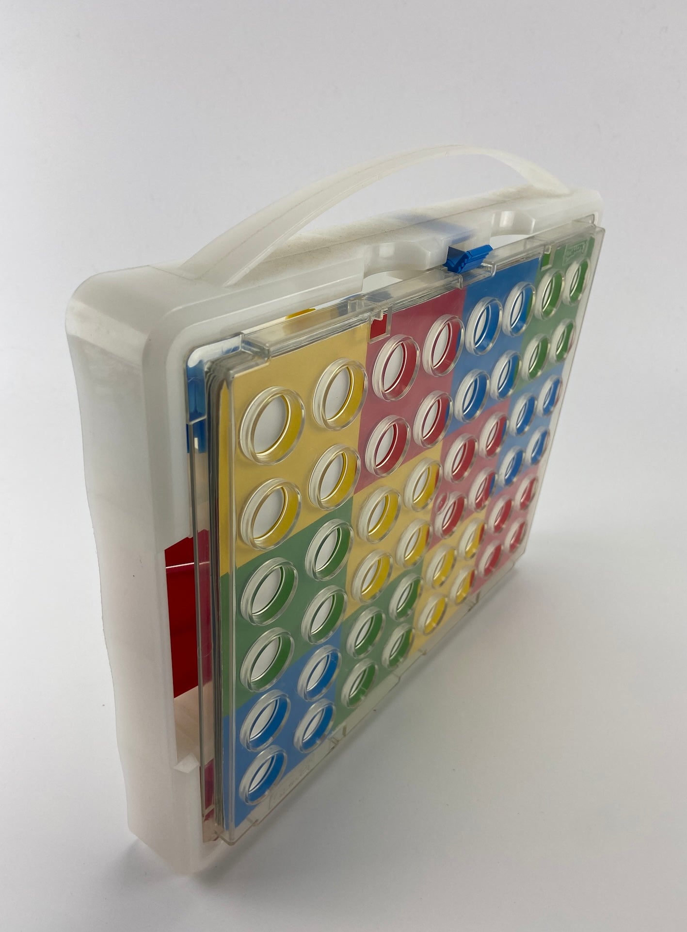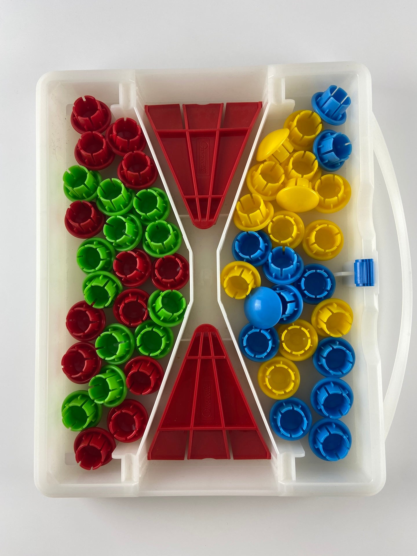 Peças e caixa em muito bom estado e paineis de cartão com muitas marcas de uso.
