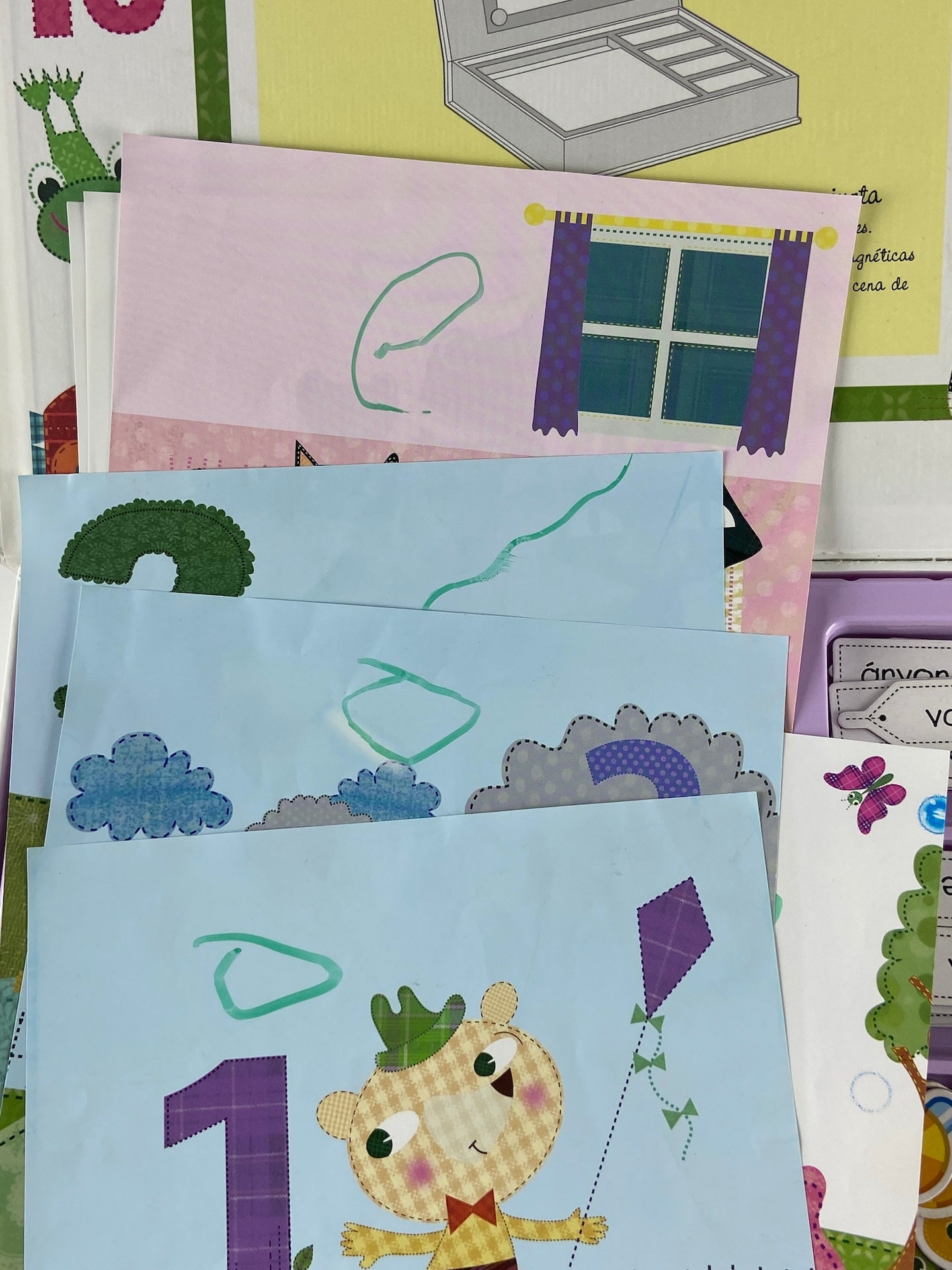 A criança pode ir replicando ou recriando as ces do livro, introduzindo os elementos em falta. Inclui 10 cartões de imagens, mais de 40 peças magnéticas e o livro Palavras e Números. Este é um artigo para doação. Está disponível para quem lhe quiser dar uso.