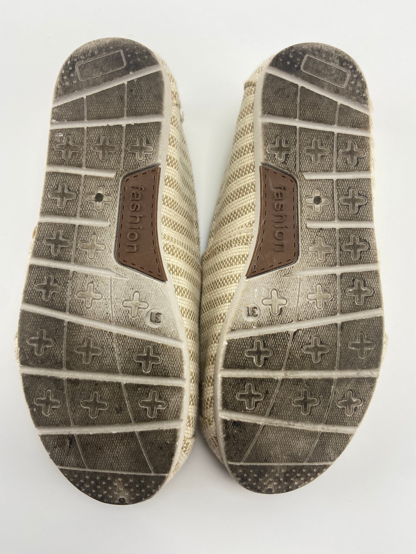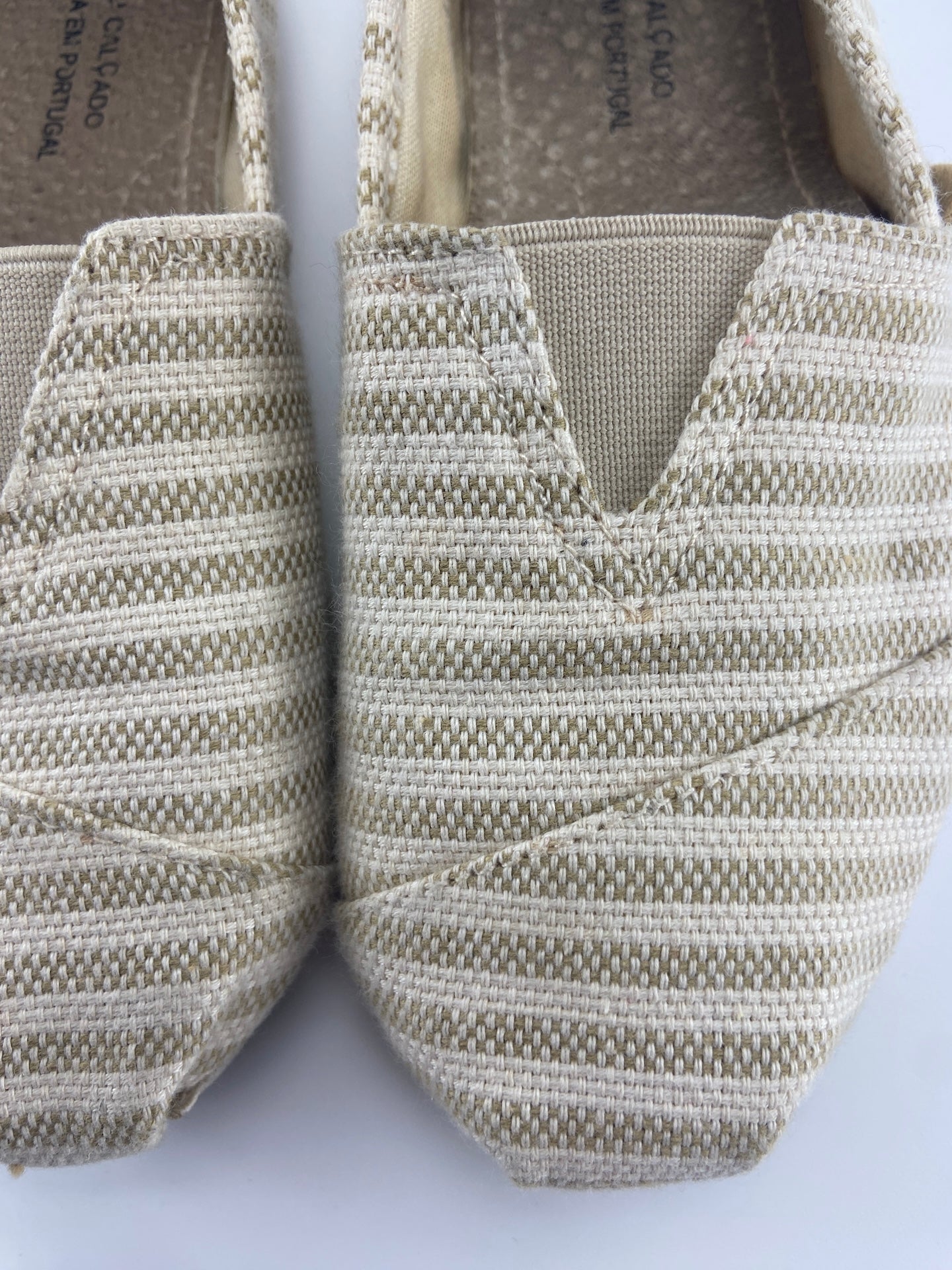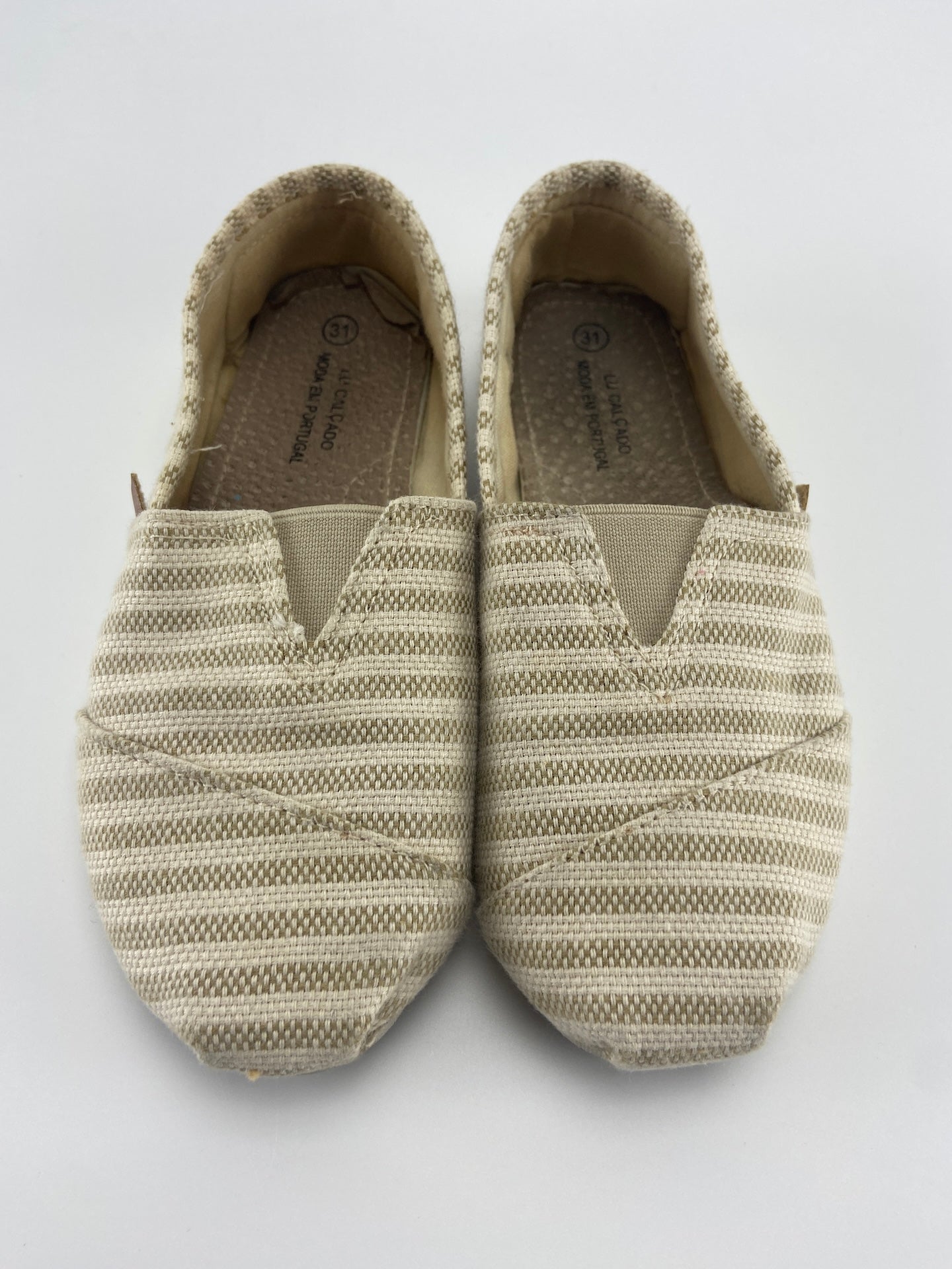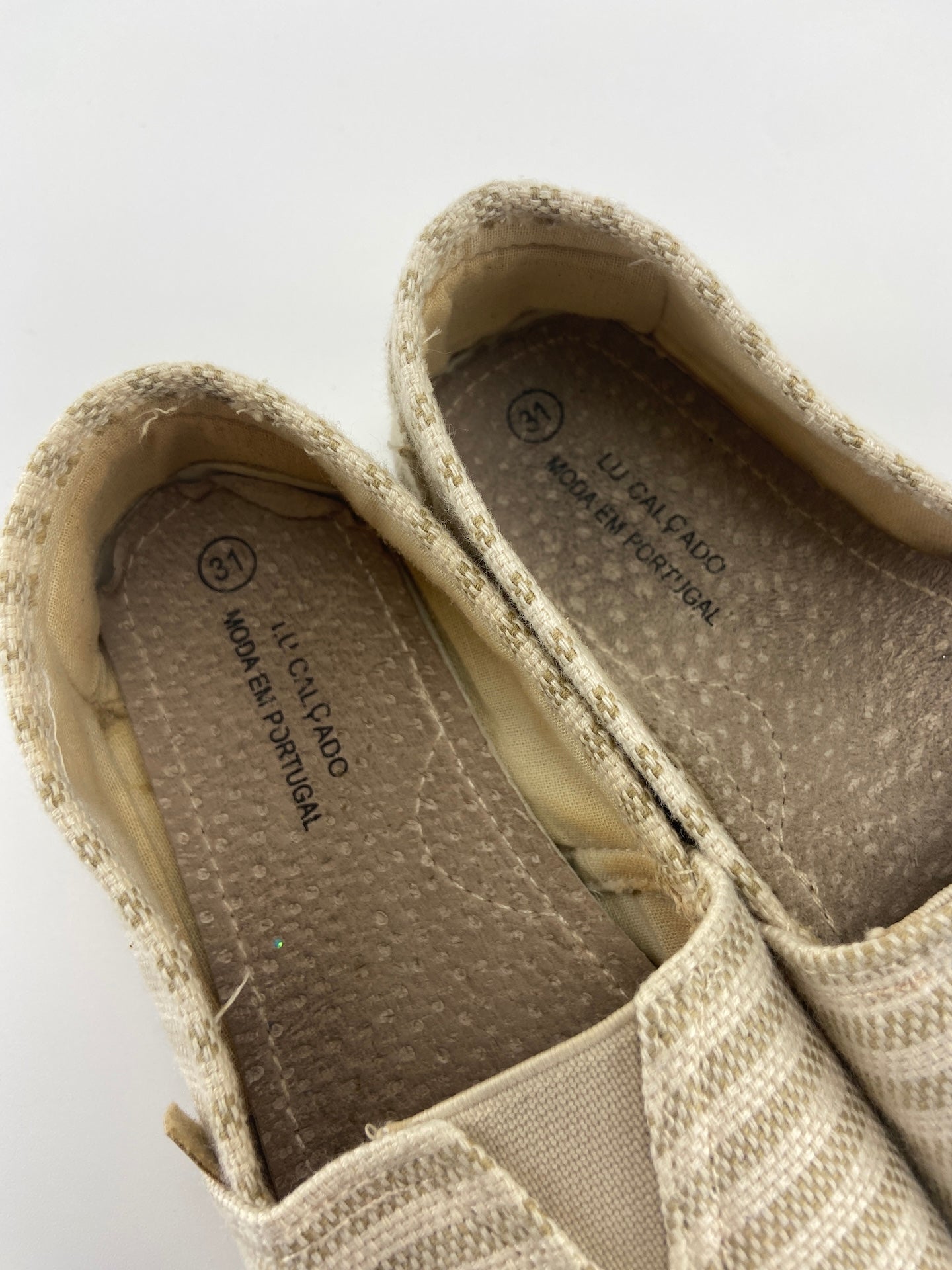 Sapatos slip-on com padrão de riscas e sola de borracha.