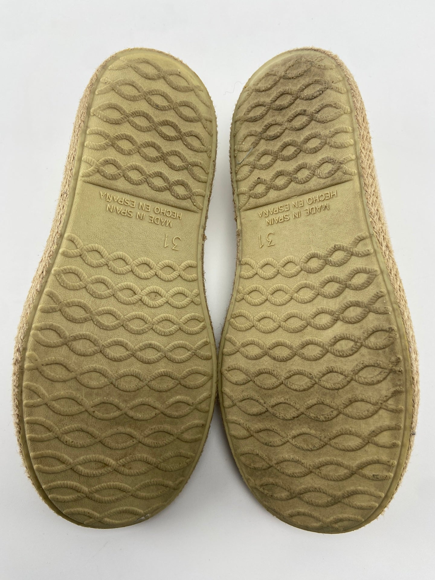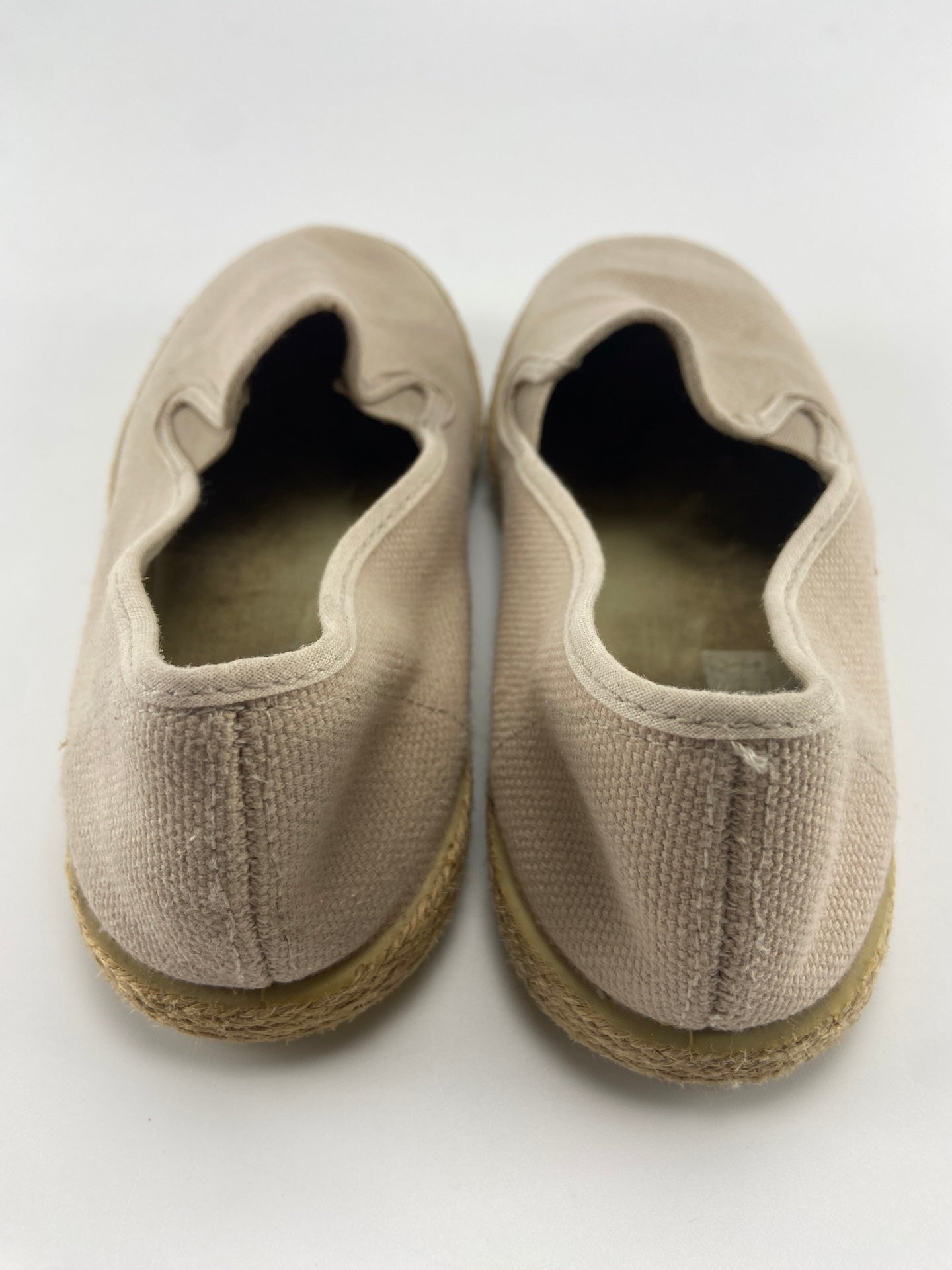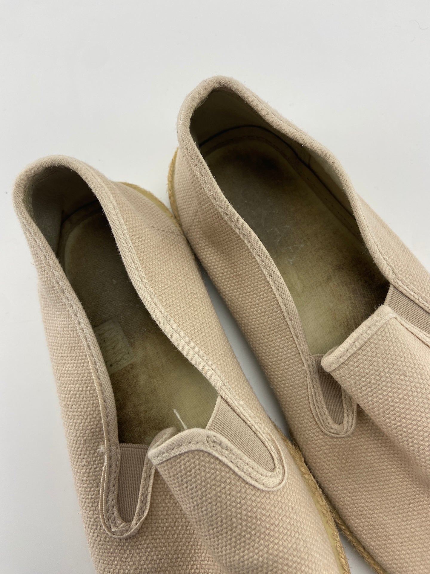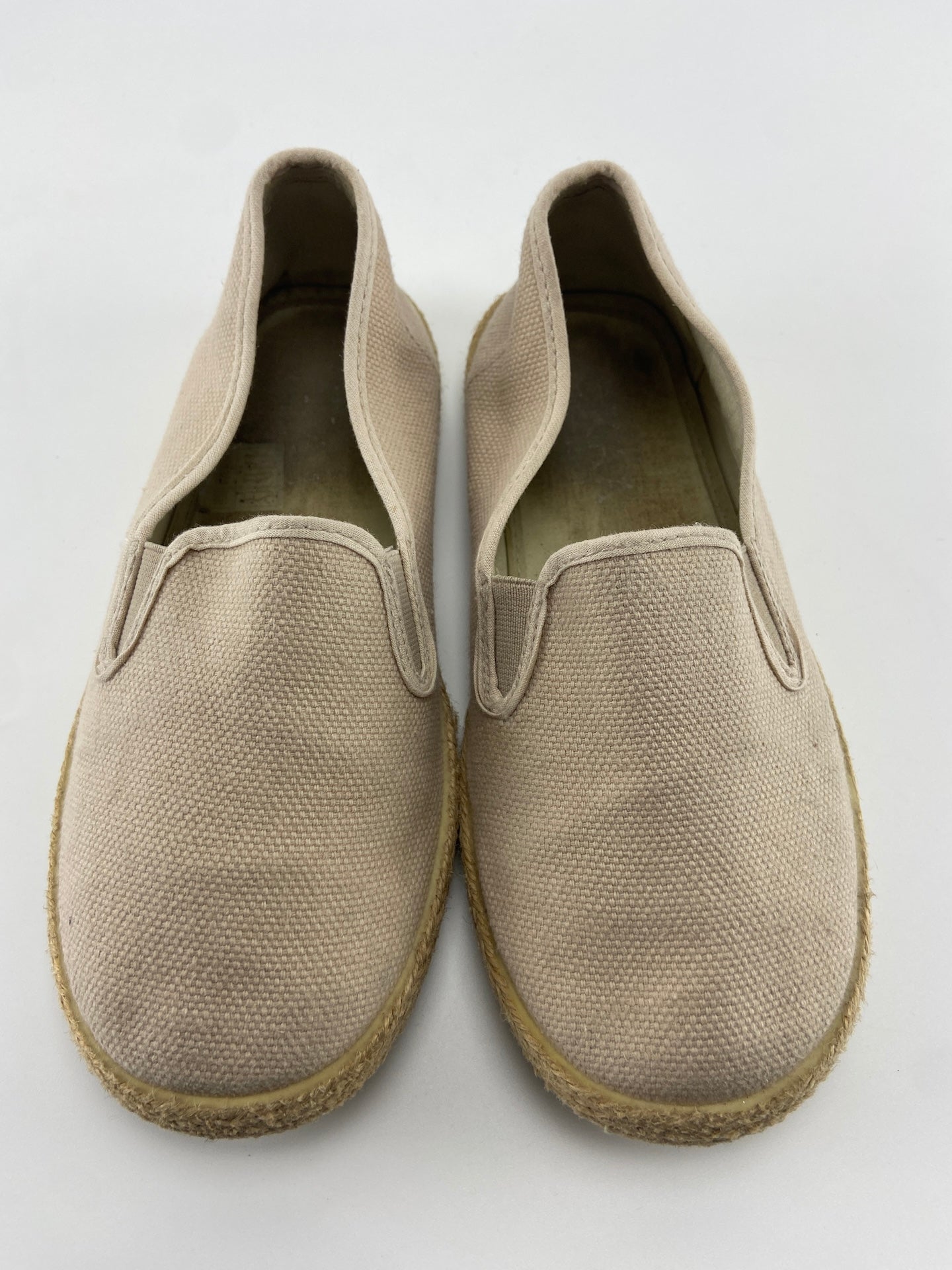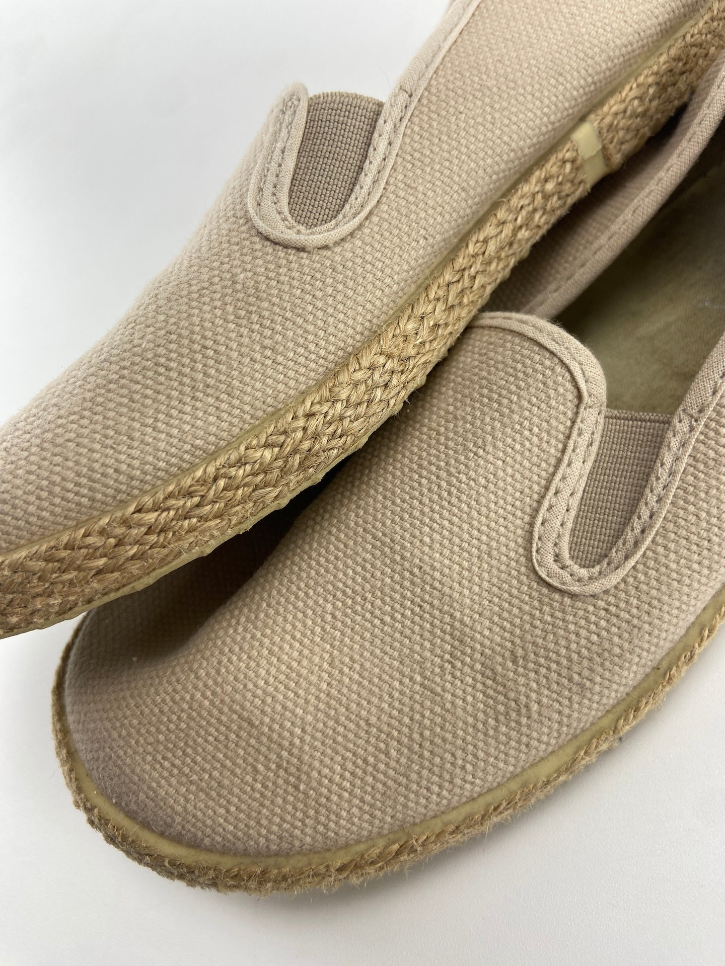 Sapatos de lona e corda com elásticos e sola de borracha.