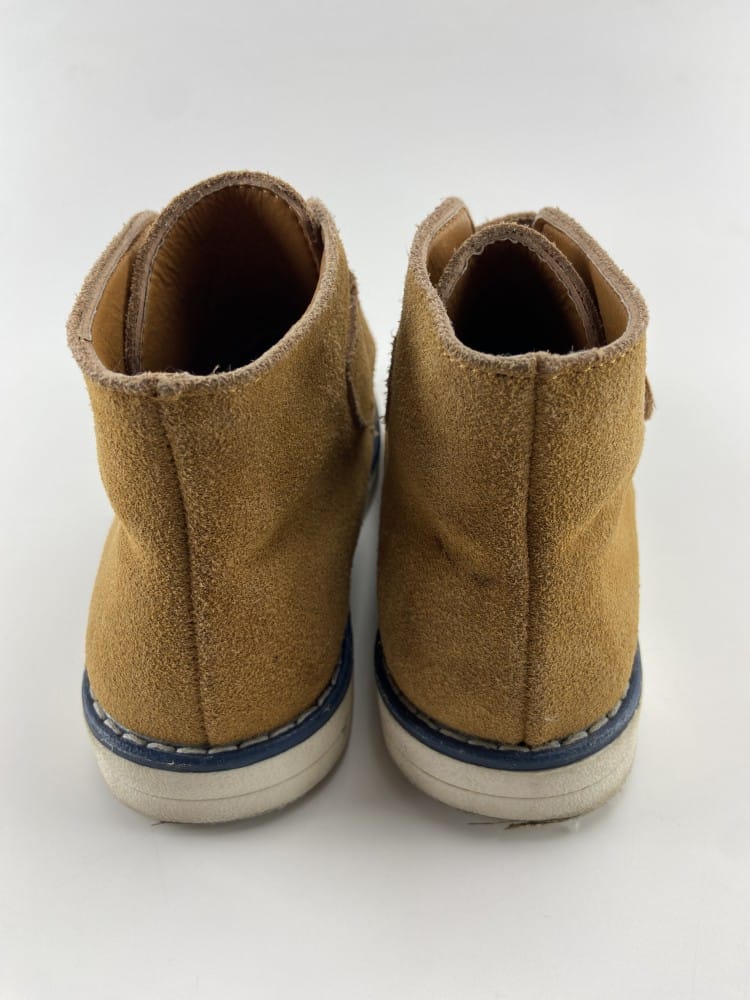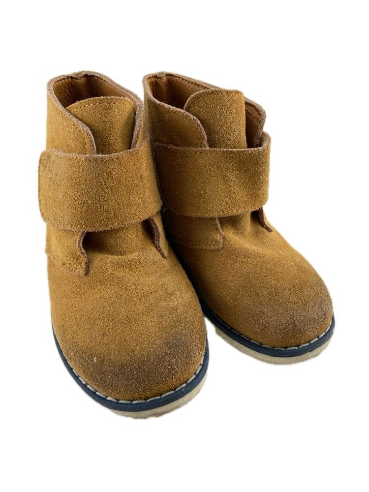Botas em pele tipo camurça com sola de borracha e fecho de velcro.