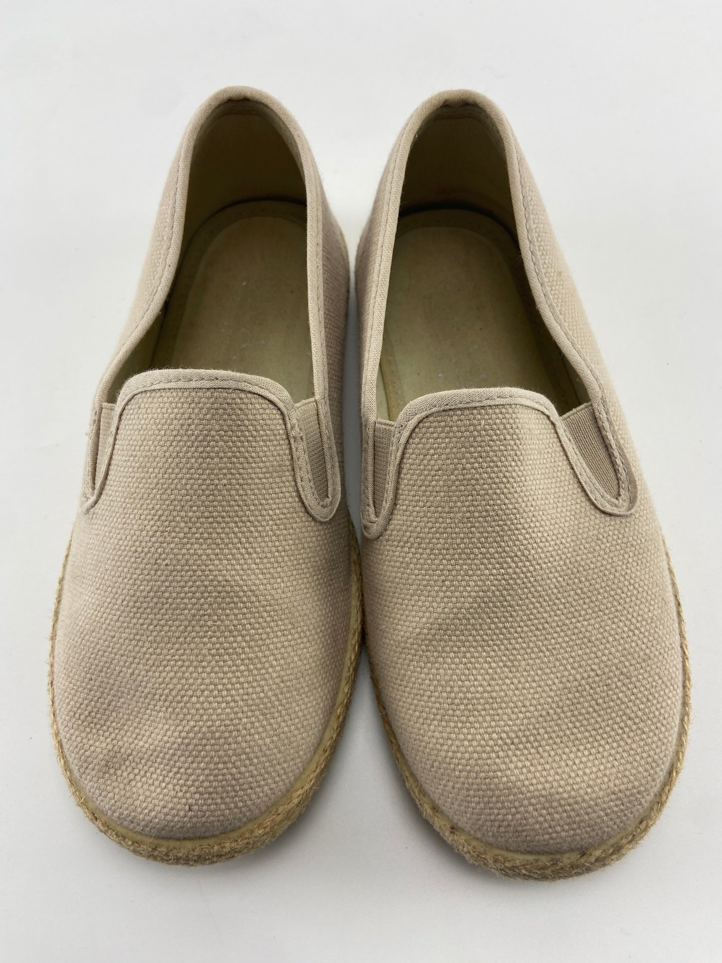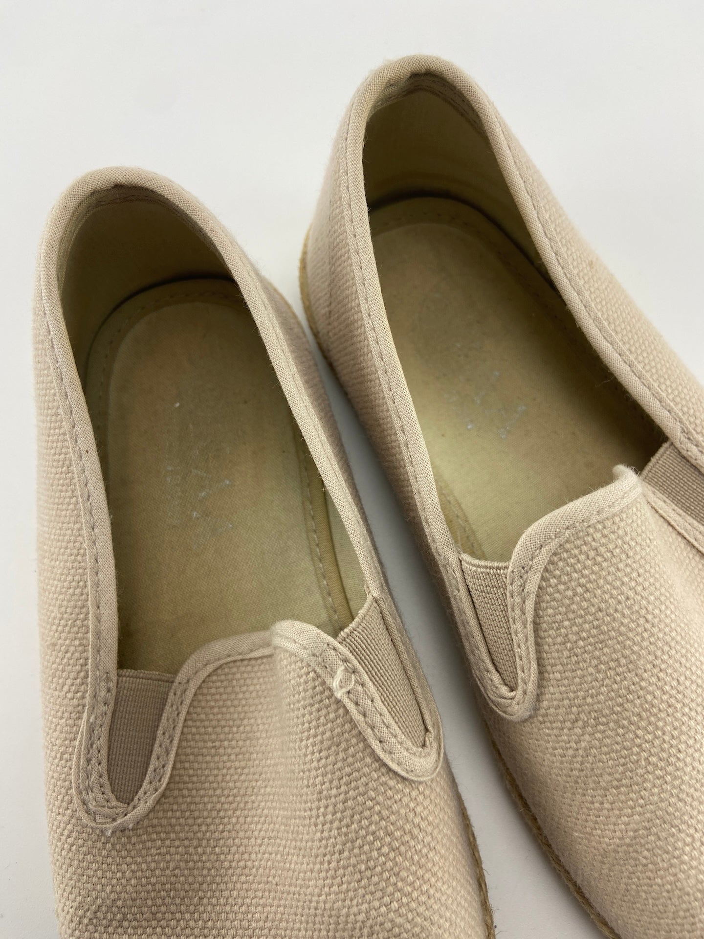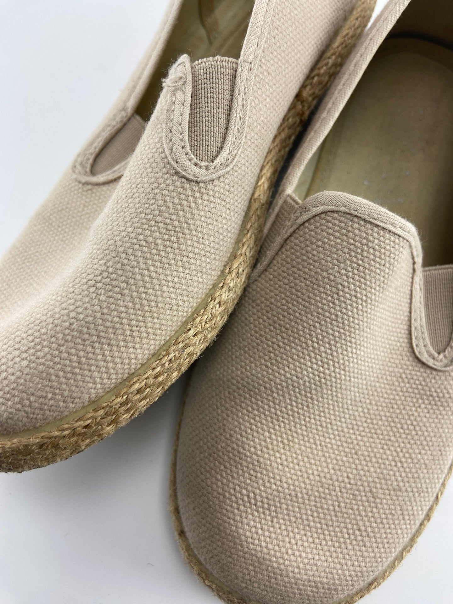 Sapatos de lona e corda com elásticos e sola de borracha.