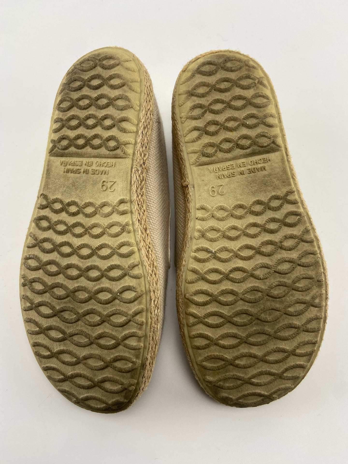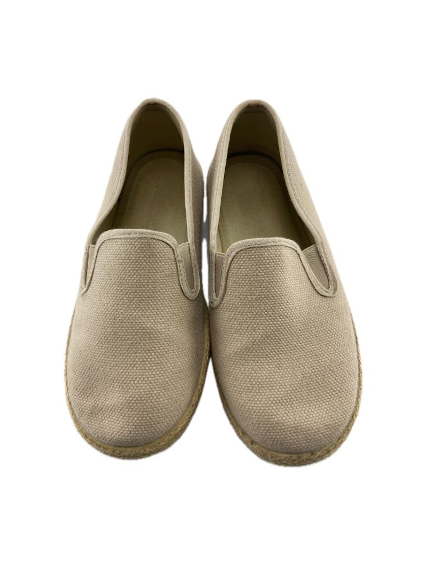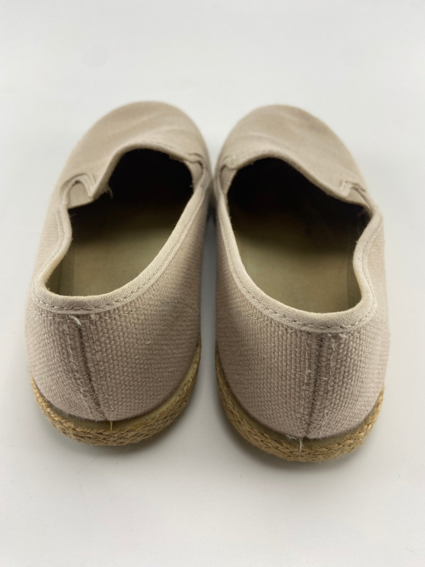 Sapatos de lona e corda com elásticos e sola de borracha.
