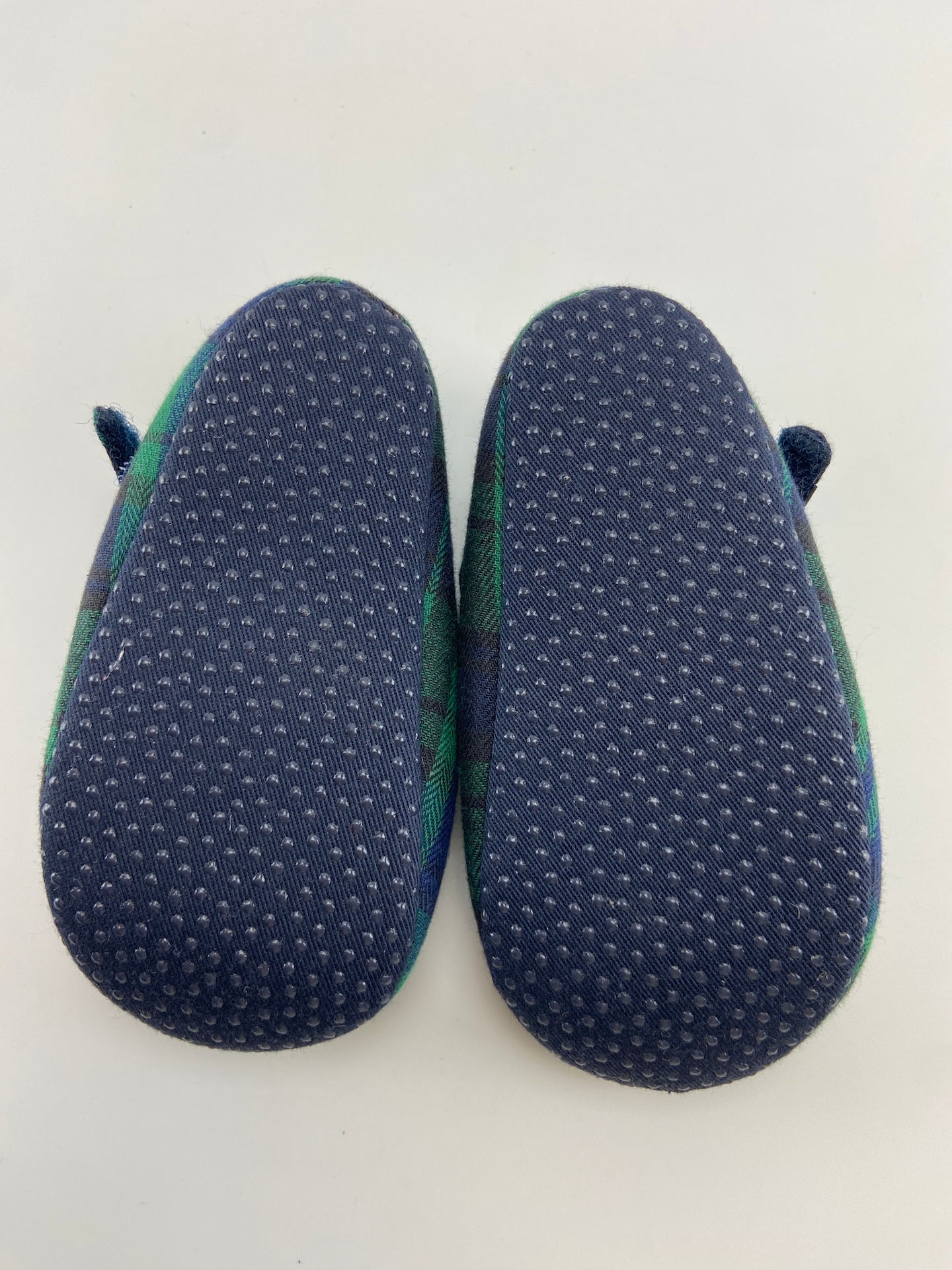 Merceditas com sola mole antiderrapamte. Com padrão escocês e fecho em velcro.
