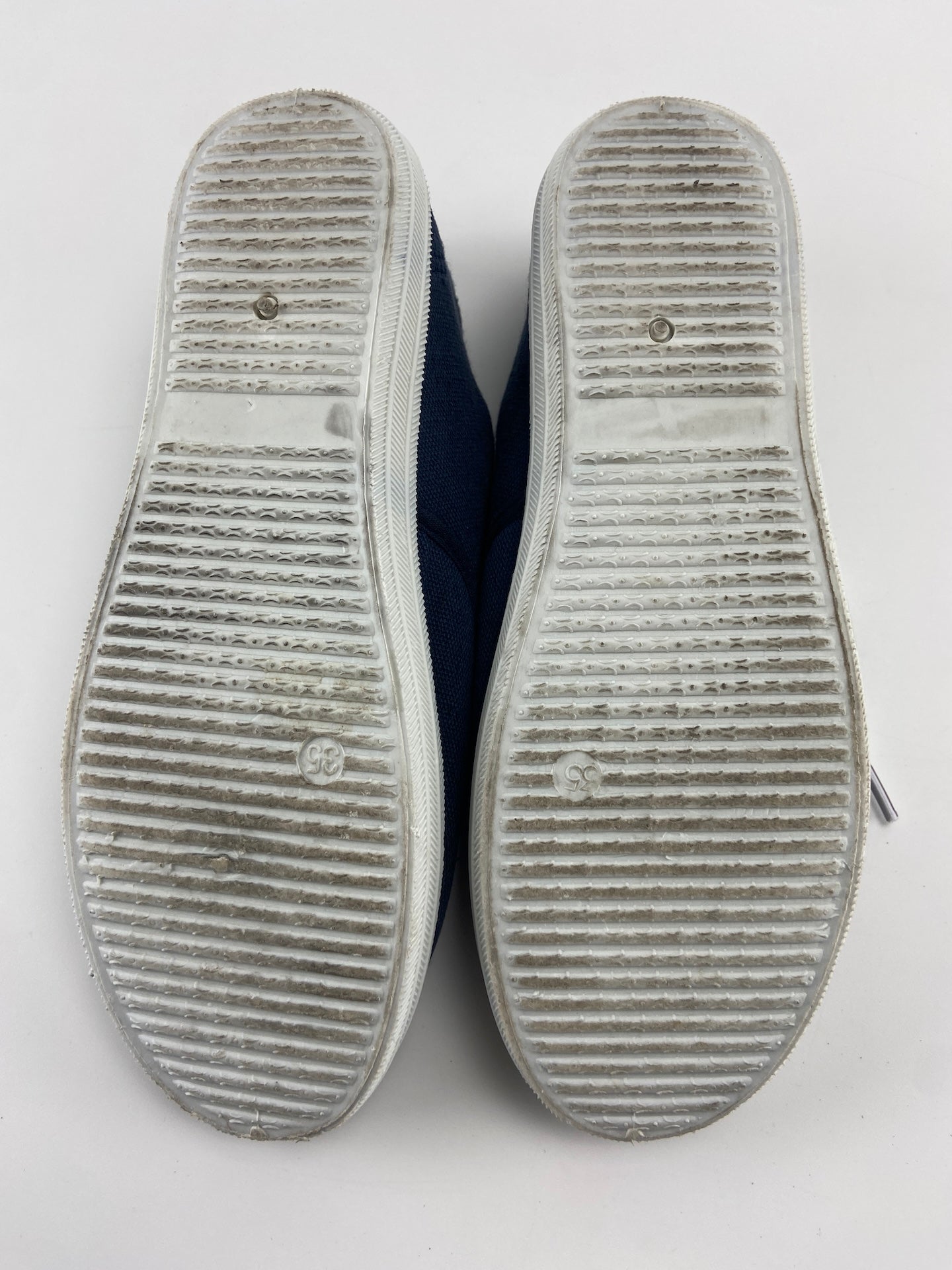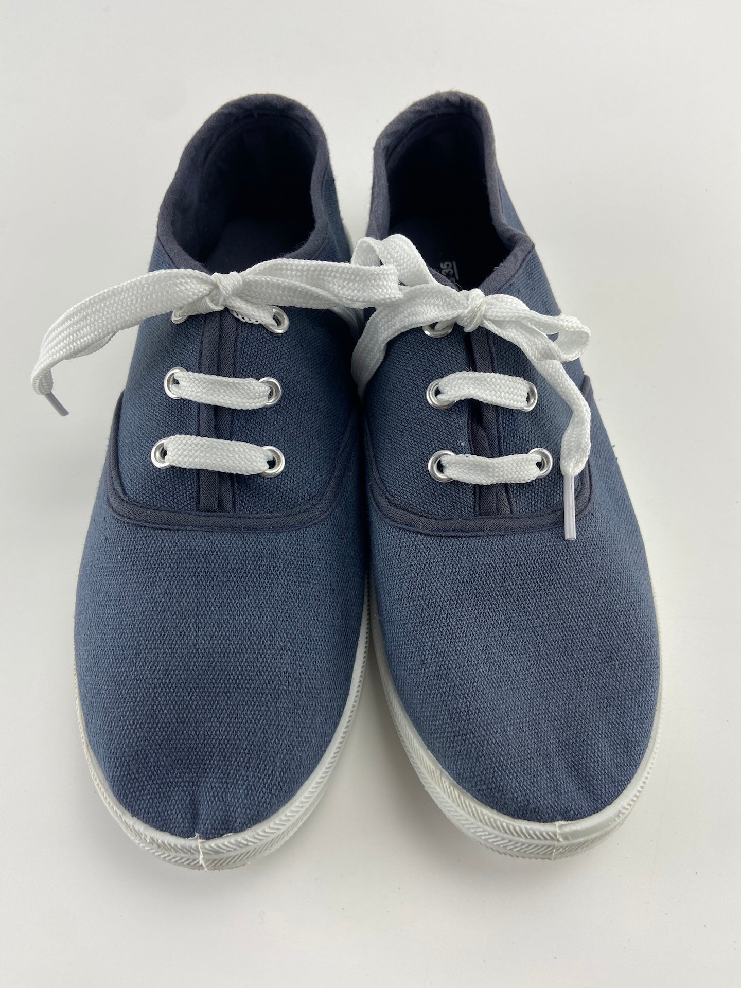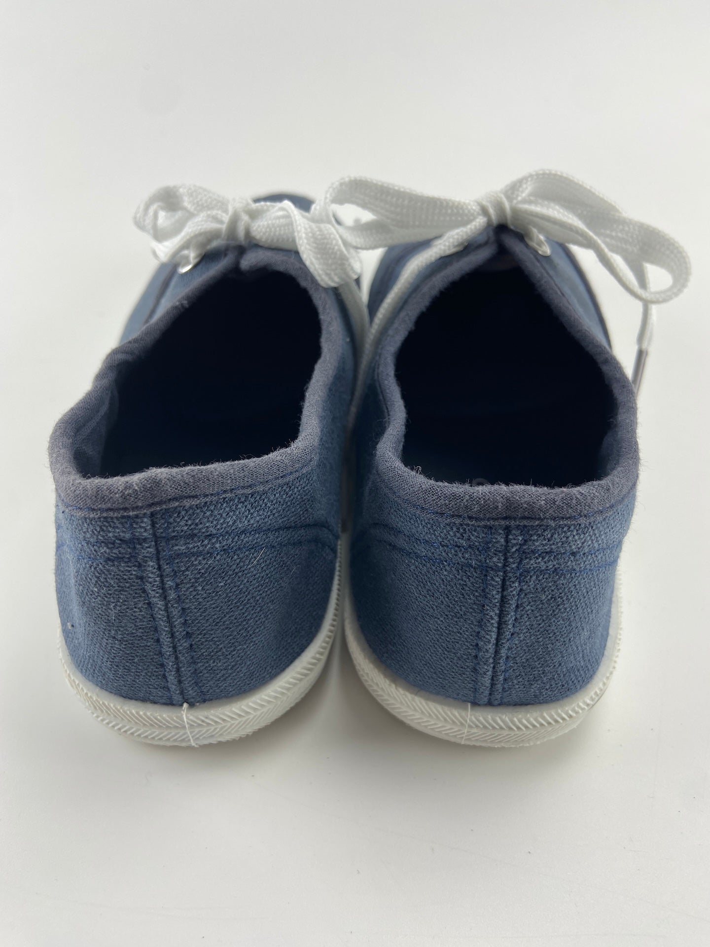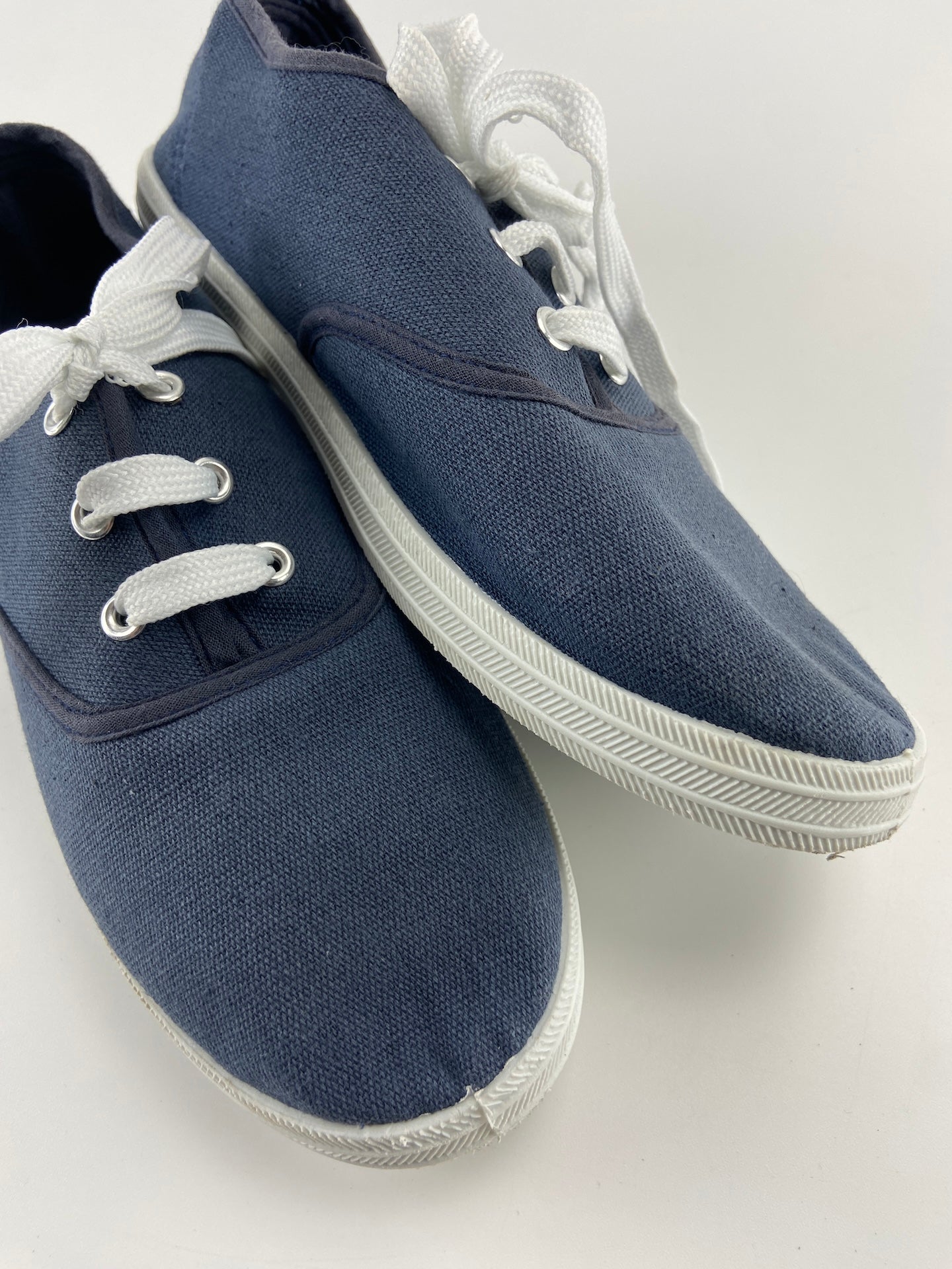 Sapatilhas básicas de lona com atacadores e sola de borracha.