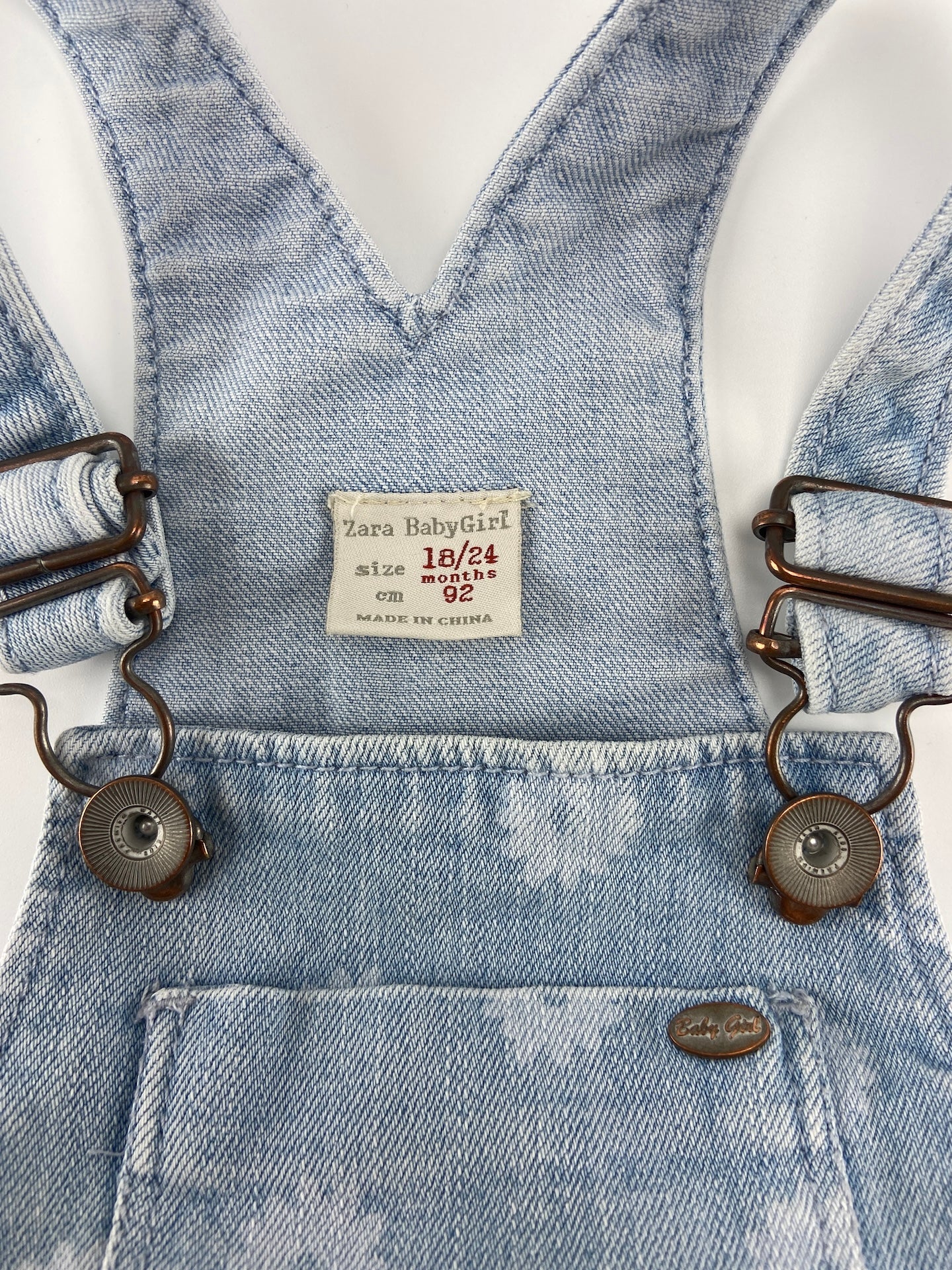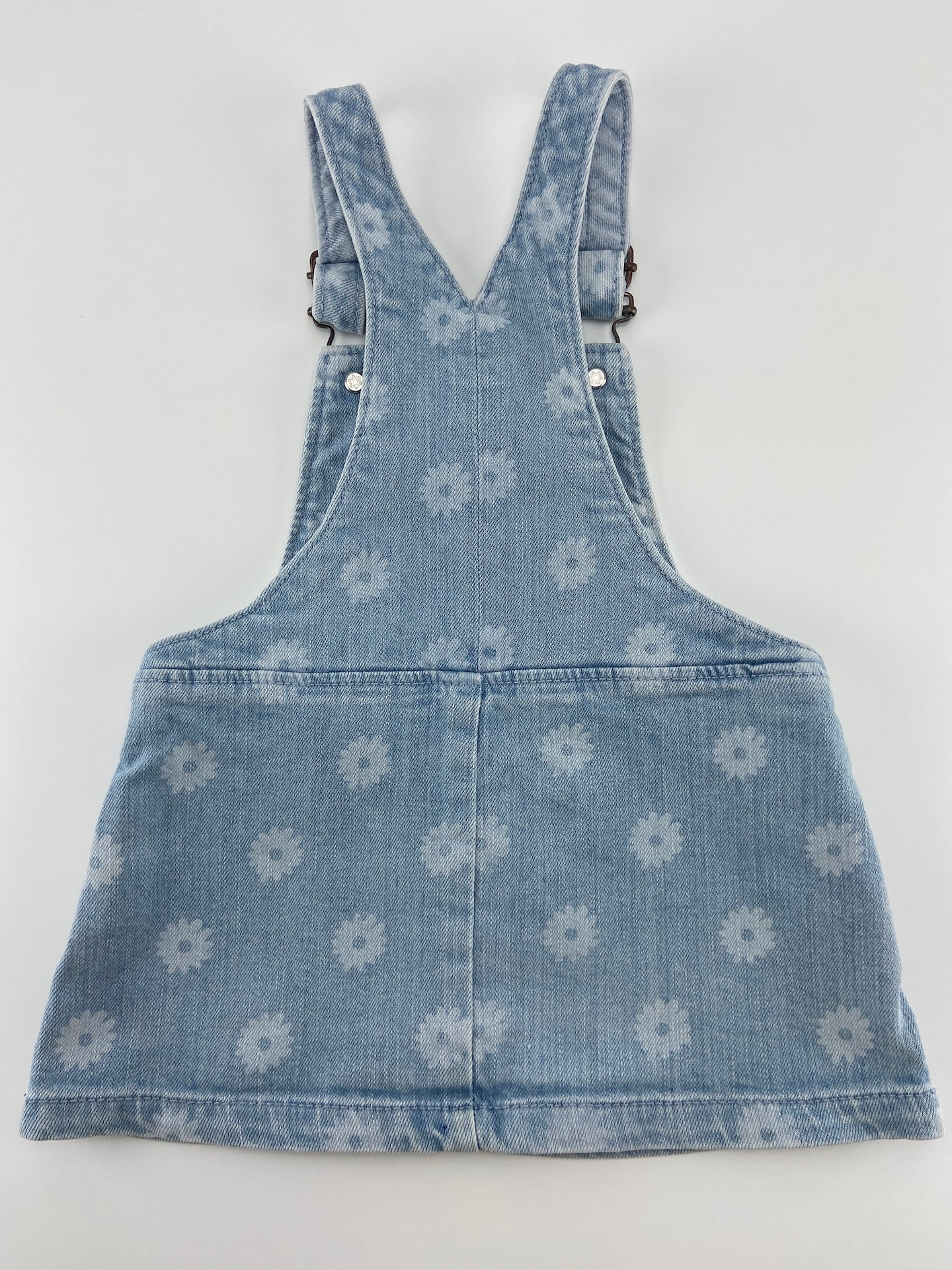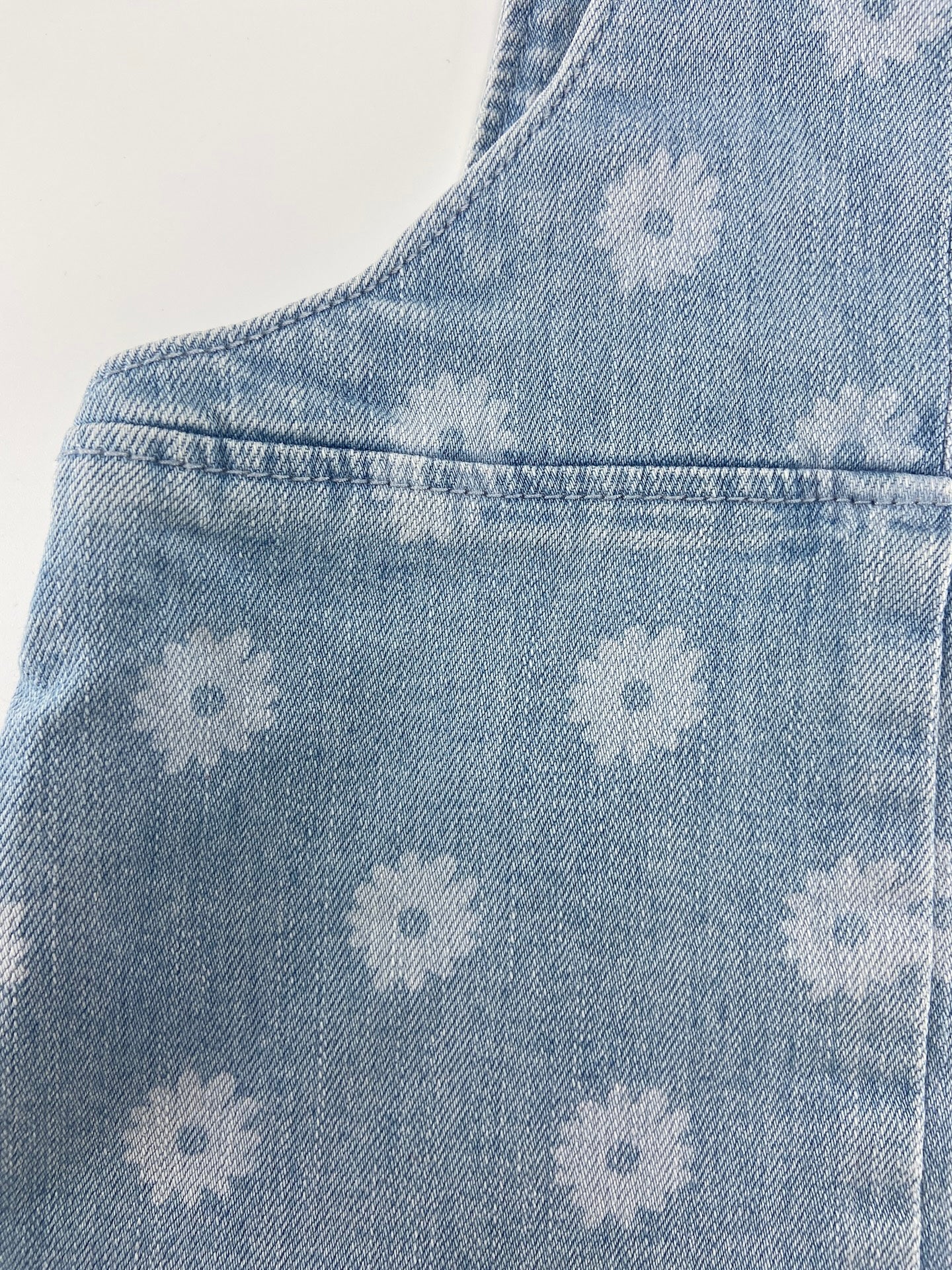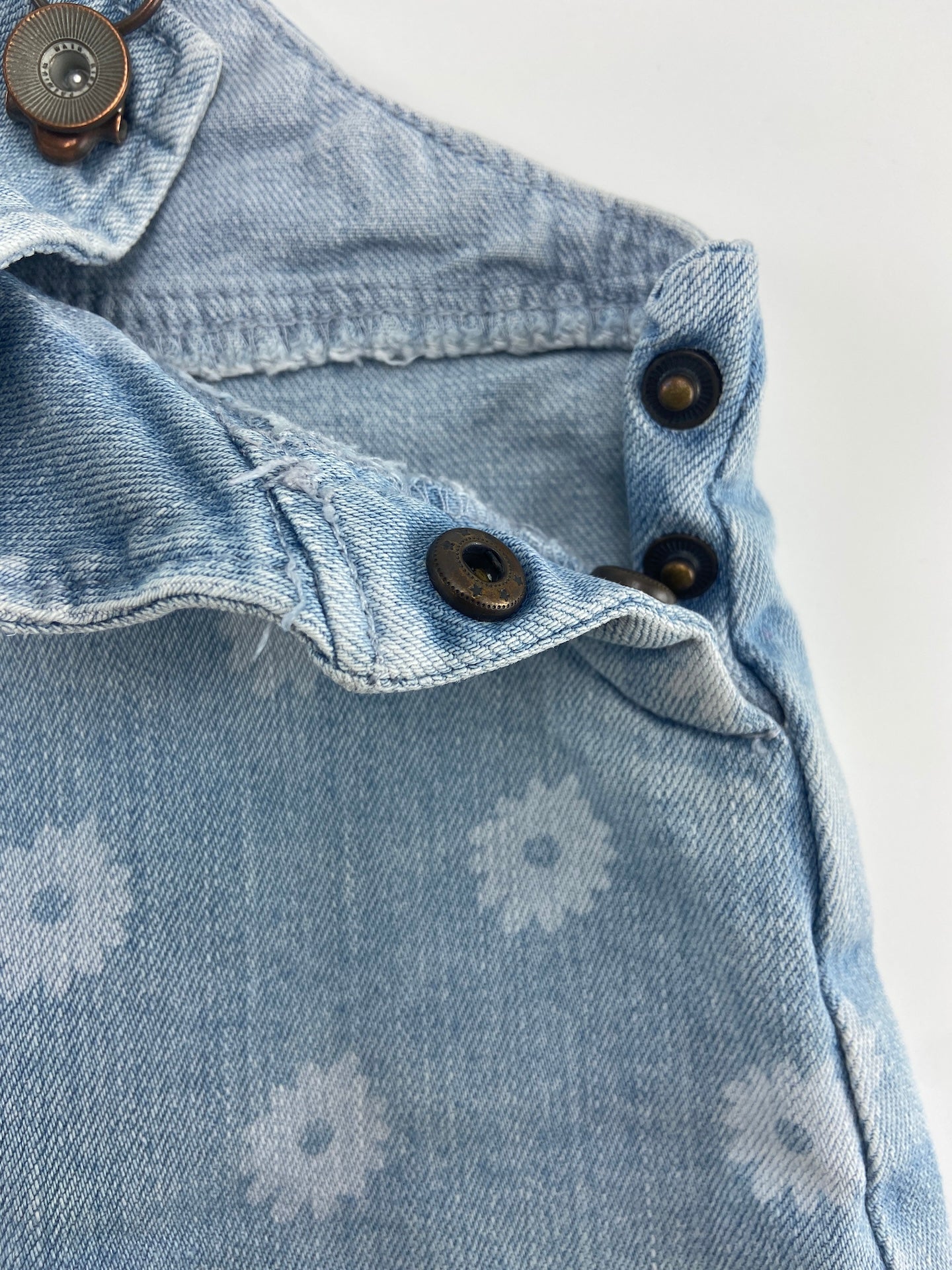 Saia de peitilho em ganga com flores estampoadas e botões laterias de mola.