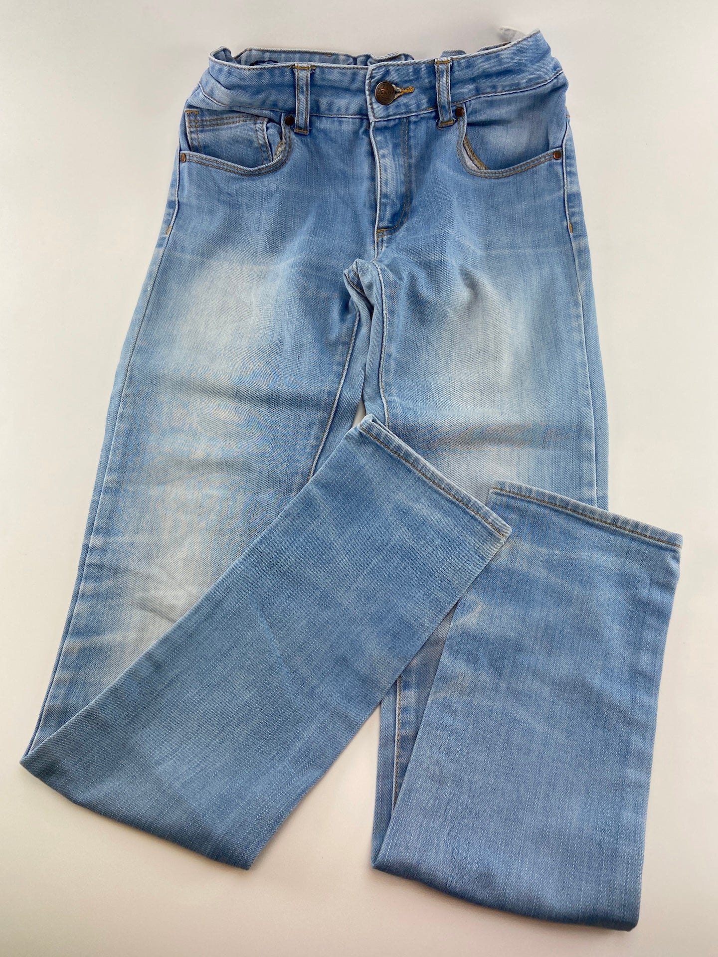 Calças de ganga slim fit com 5 bolsos e elástico de ajuste na cintura.