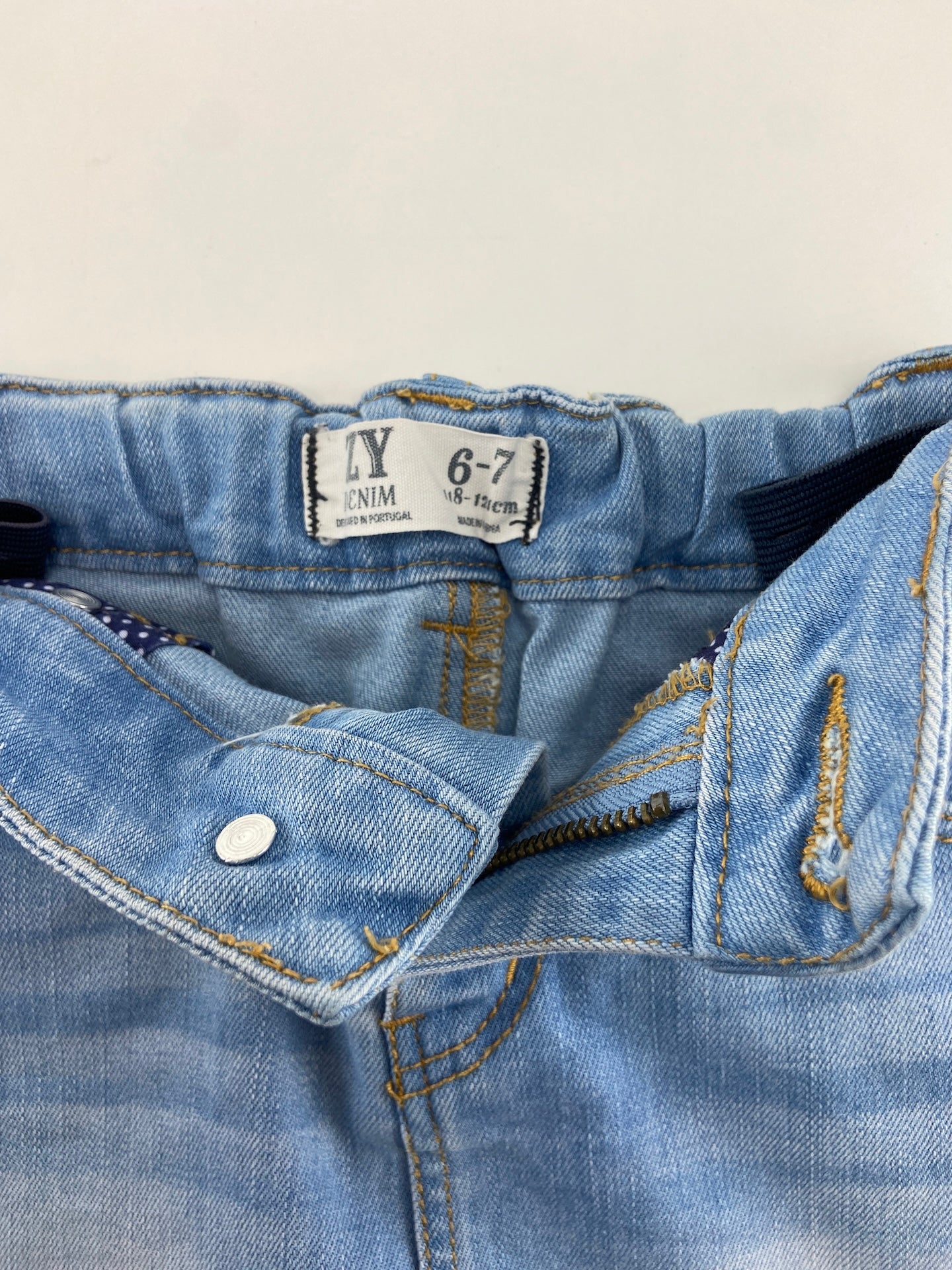 Mini saia de ganga com 5 bolsos e elástico de ajuste na cintura.