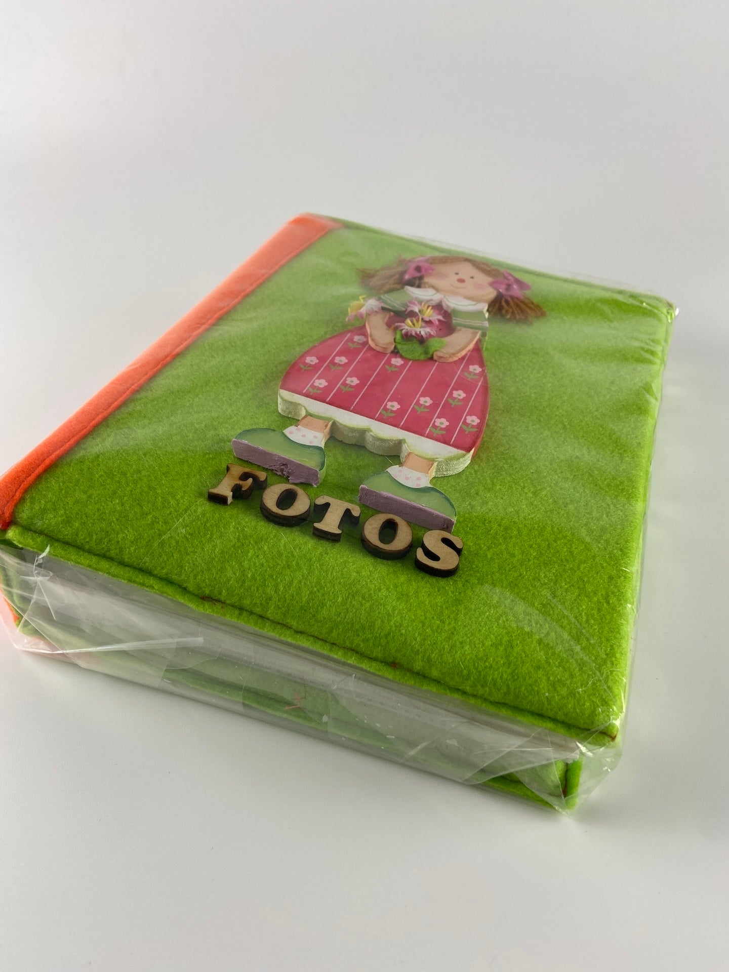 Album fotográfico forrado a tecido ainda na embalagem. Paginas com duas bolsas de forografias 10x15.