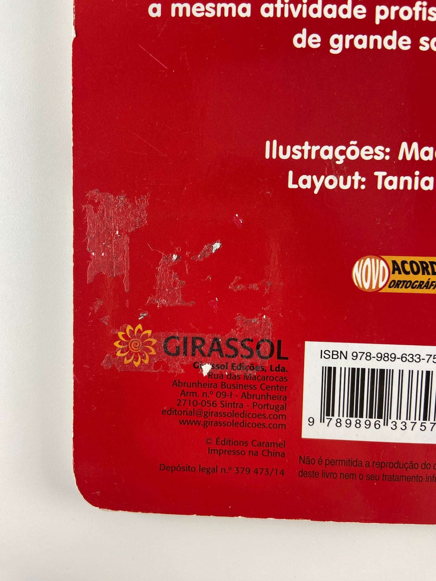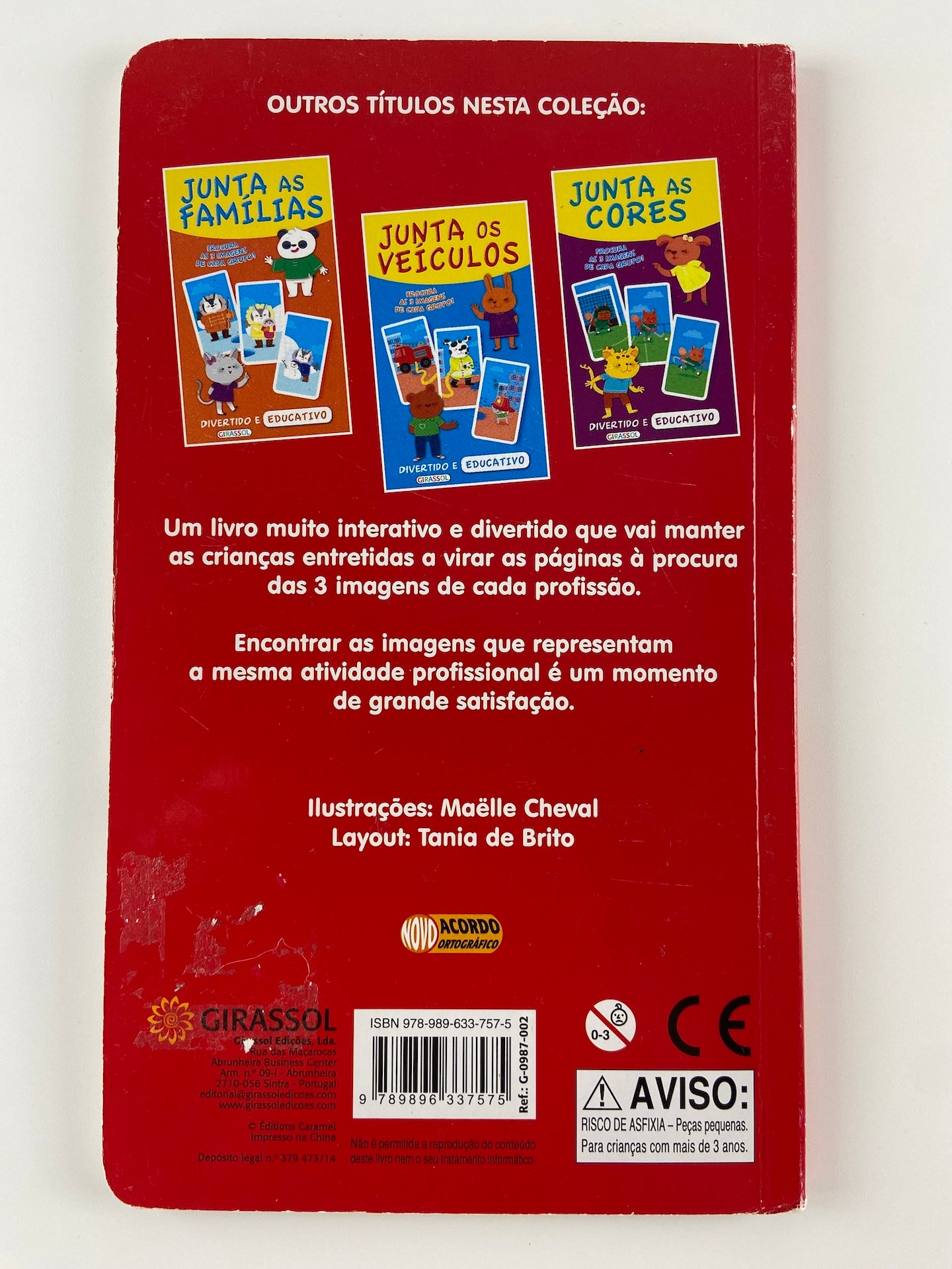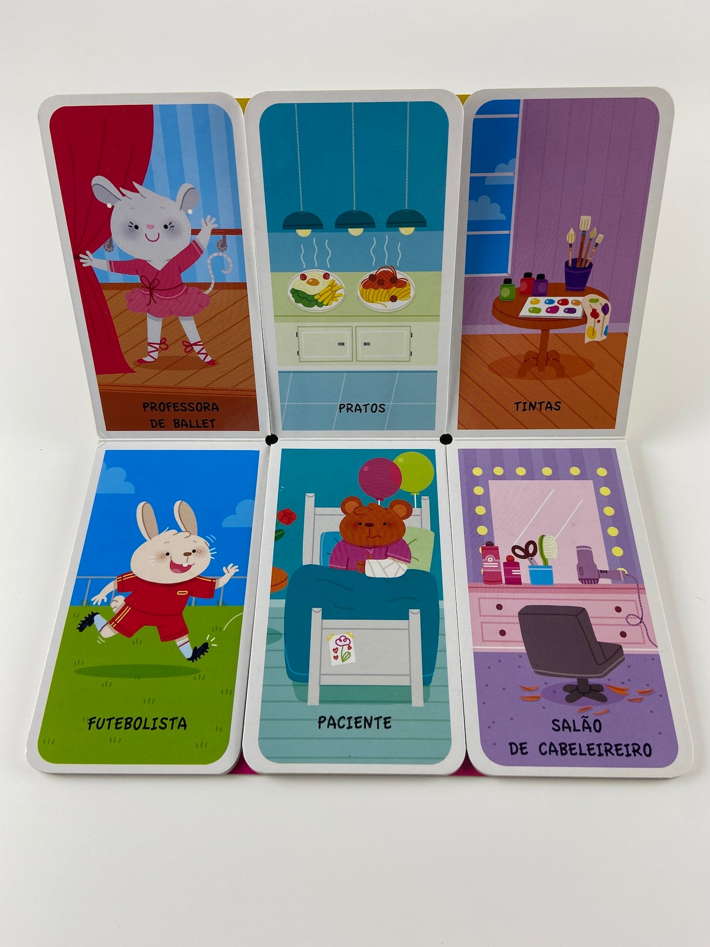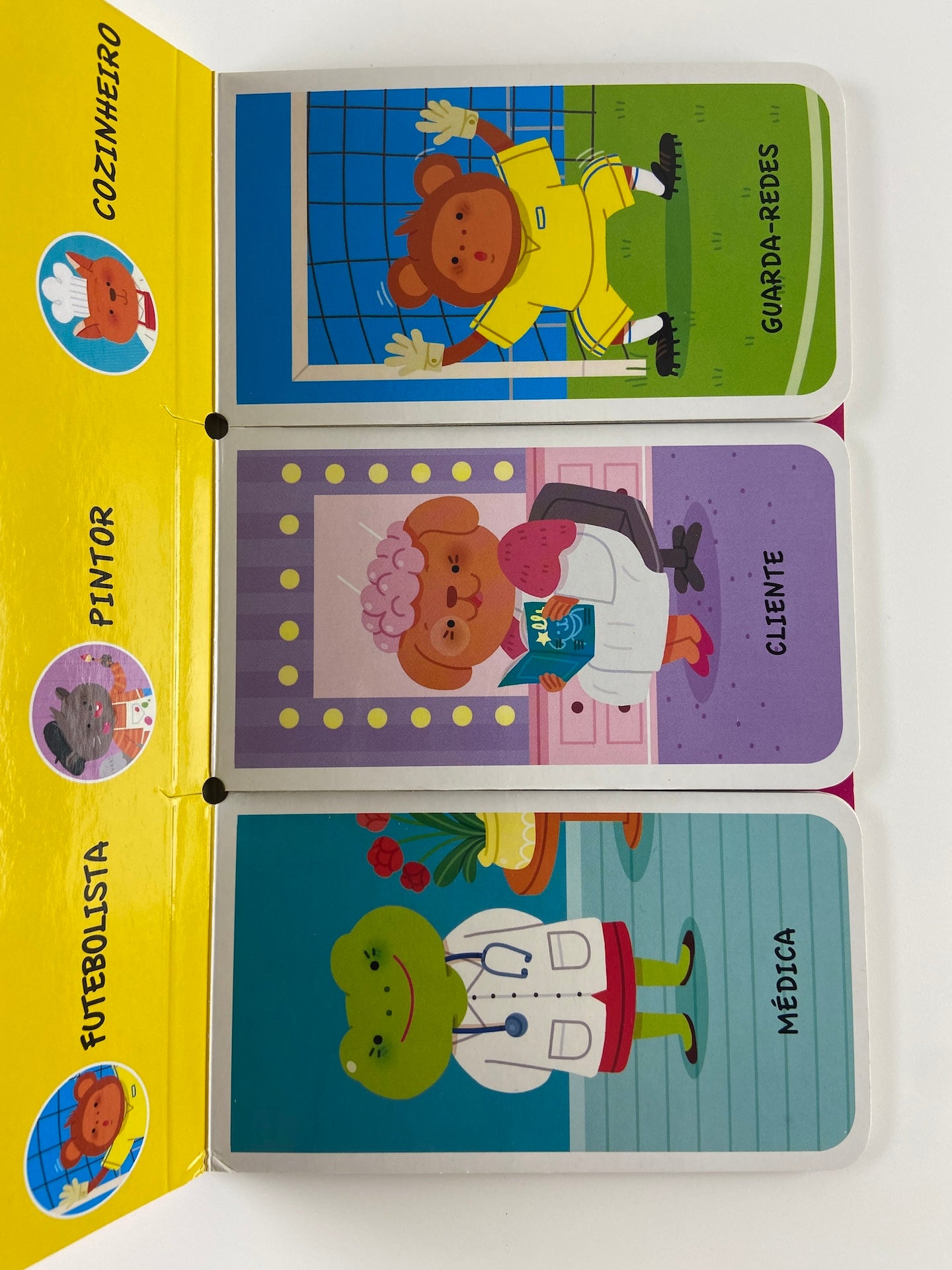 Livro tripartido interactivo em que a criança tem de coordenar as profissões com a sua actividade. Com folhas cartonadas.
