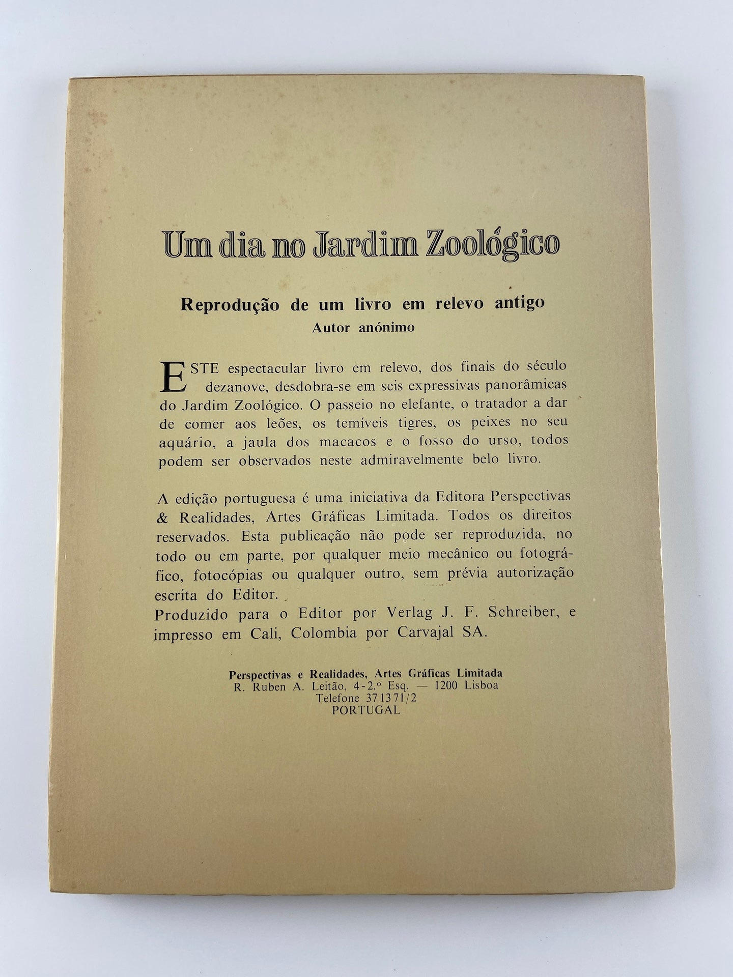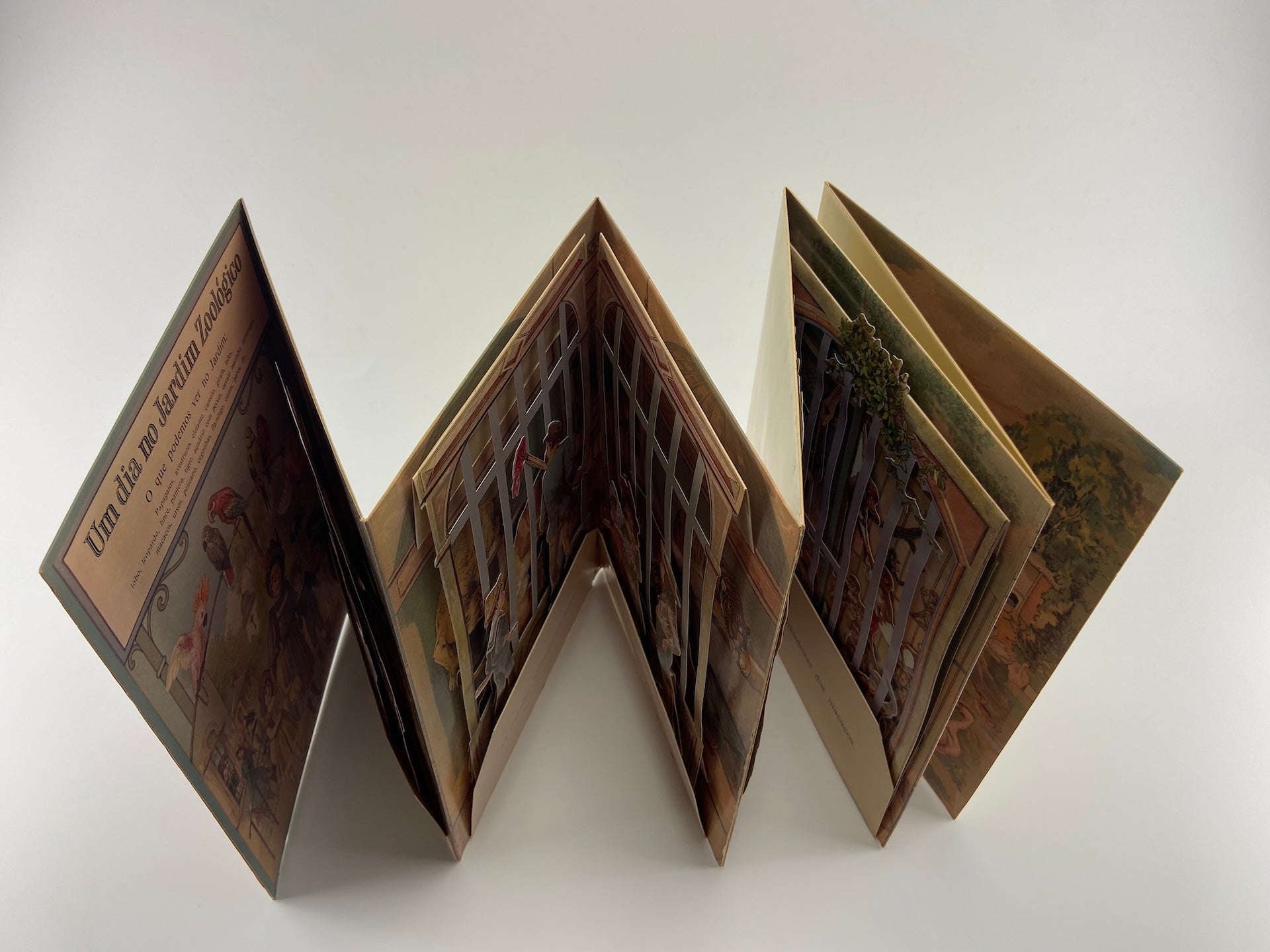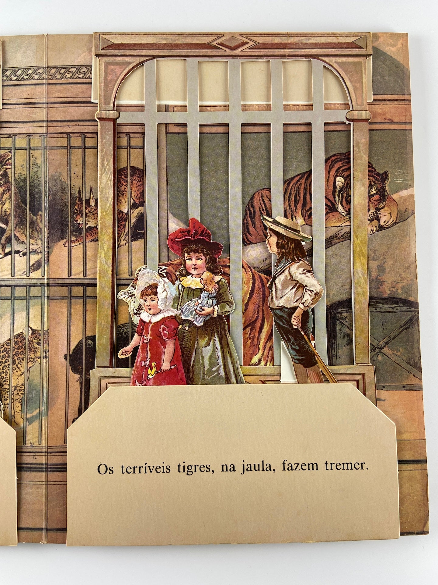 Livro desdobrável pop up com cenas de uma visita ao jardim zoológico. Adequado a crianças pequenas mas deve ser manuseado por um adulto.