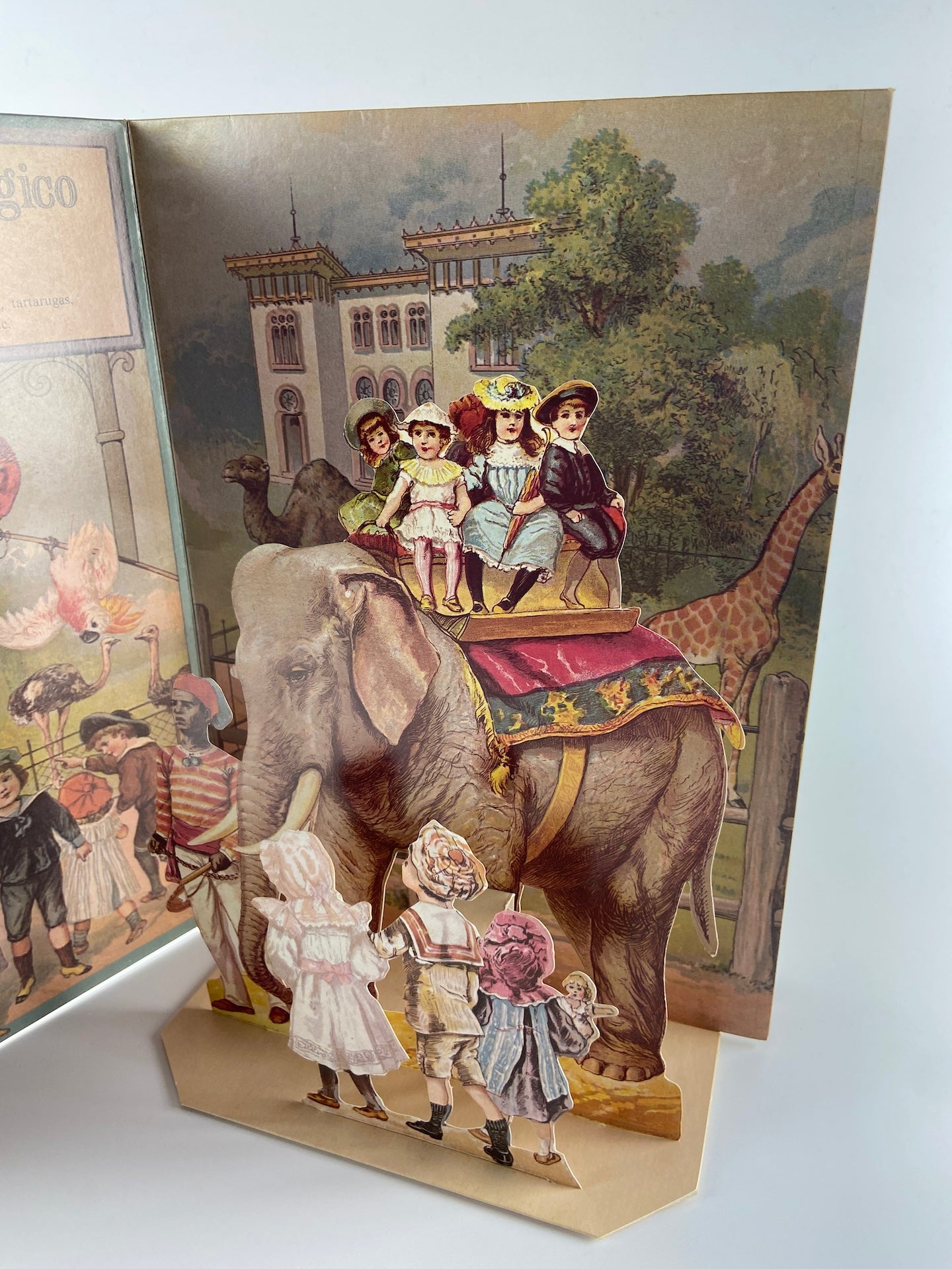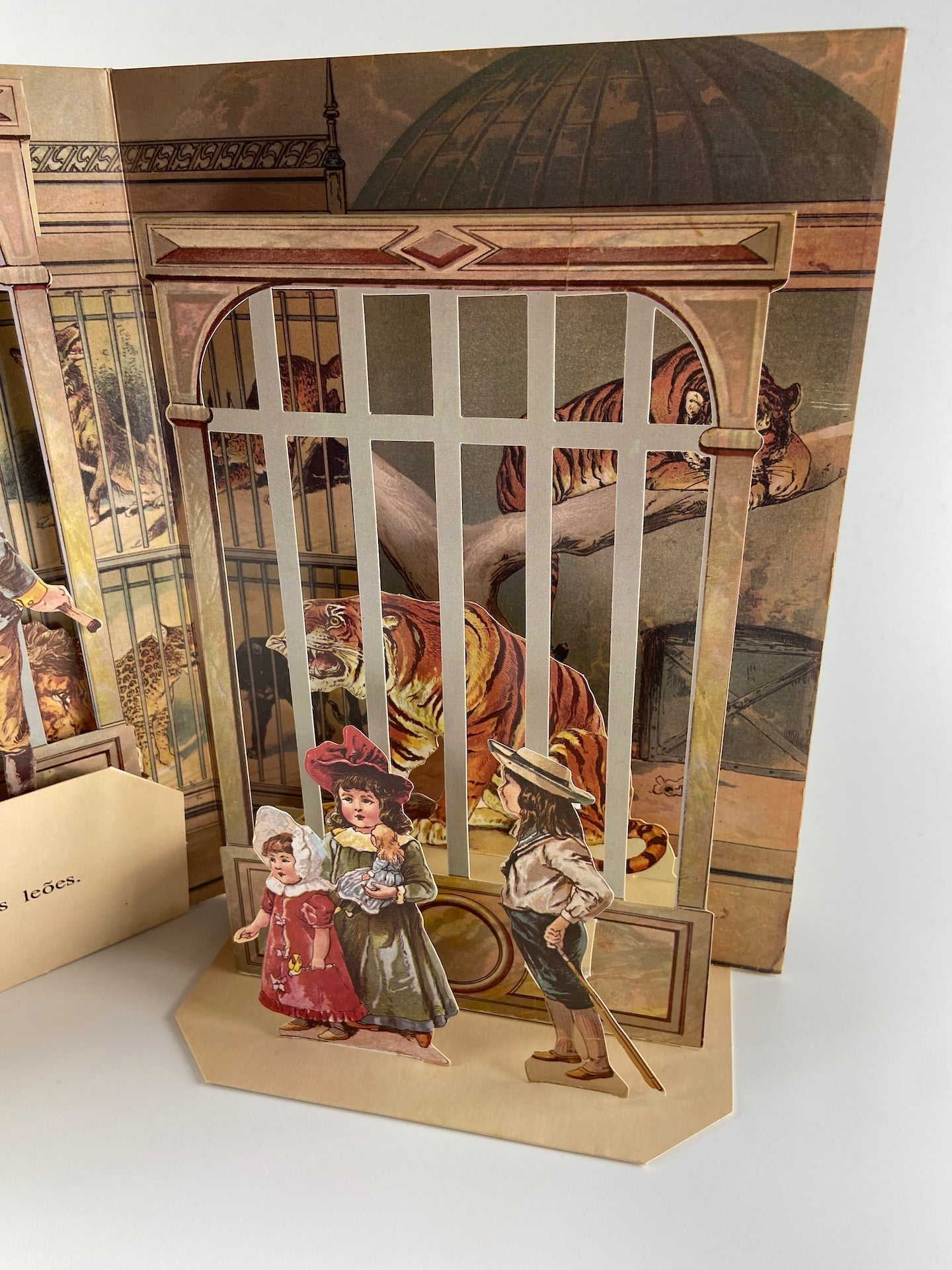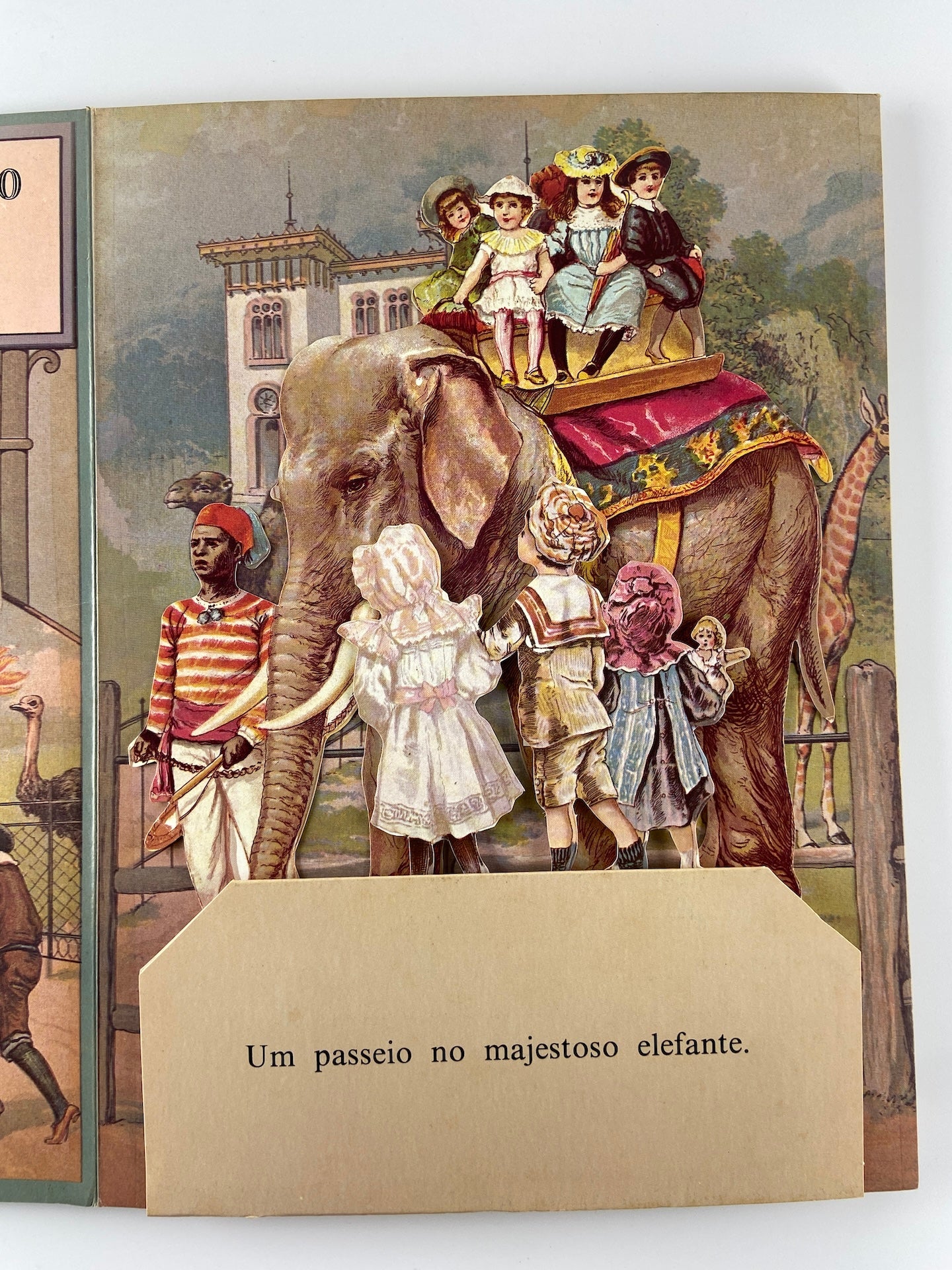 Livro desdobrável pop up com cenas de uma visita ao jardim zoológico. Adequado a crianças pequenas mas deve ser manuseado por um adulto.