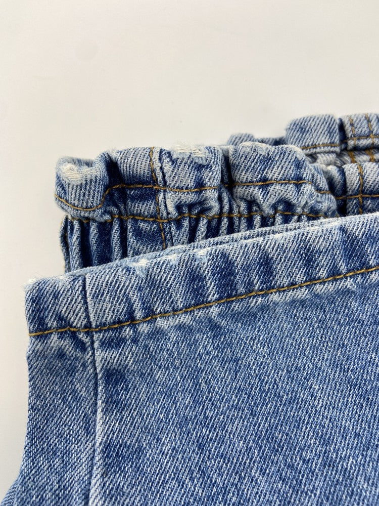 Calças de ganga estilo paperbag de cinco bolsos com elástico na cintura.