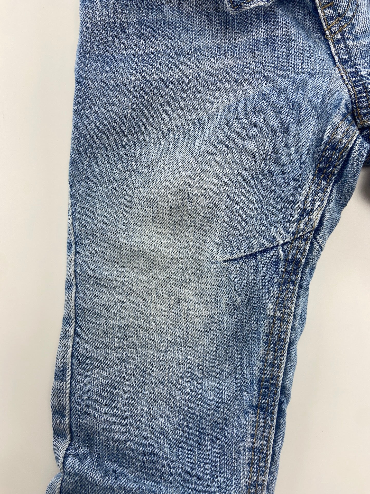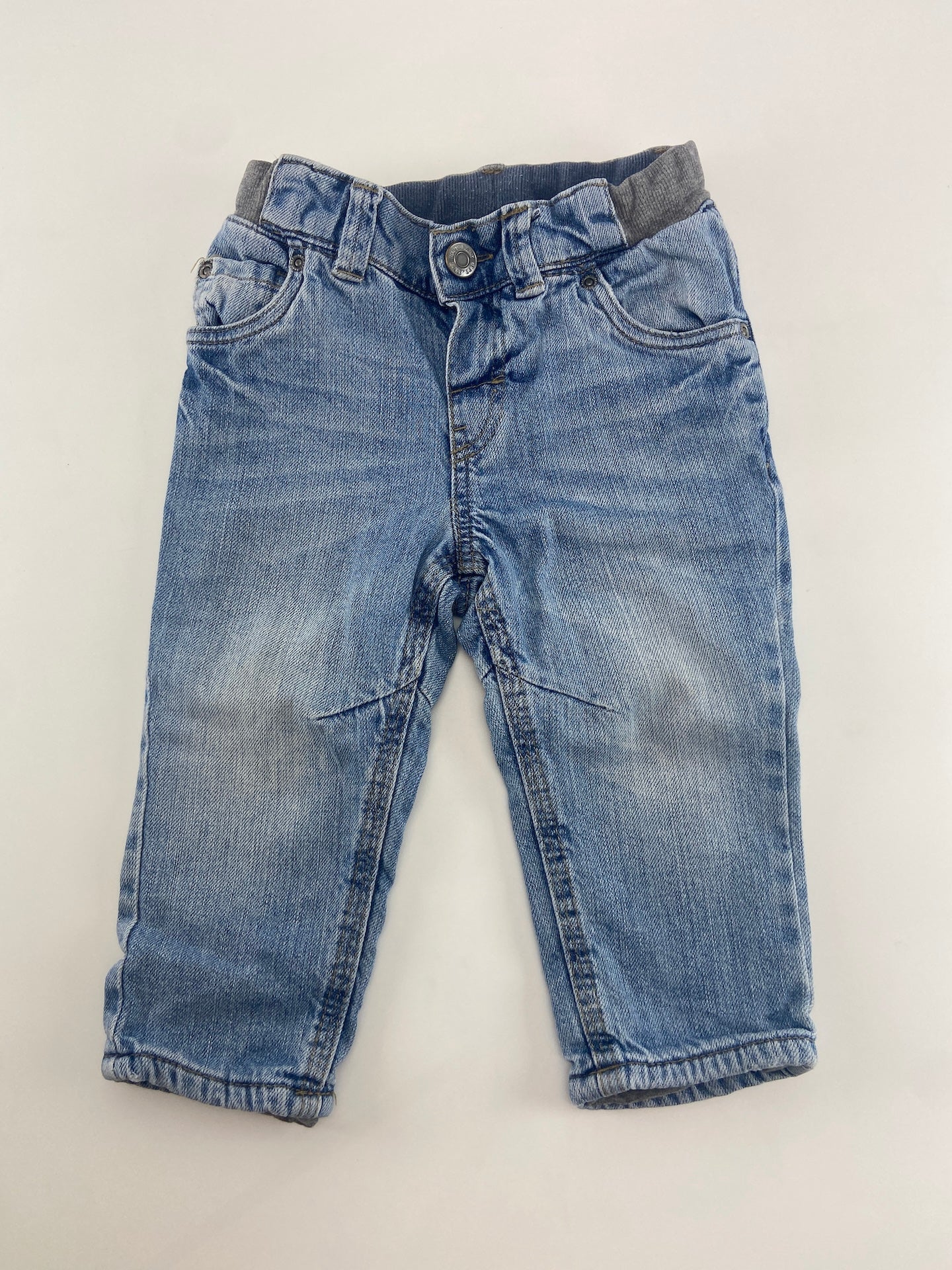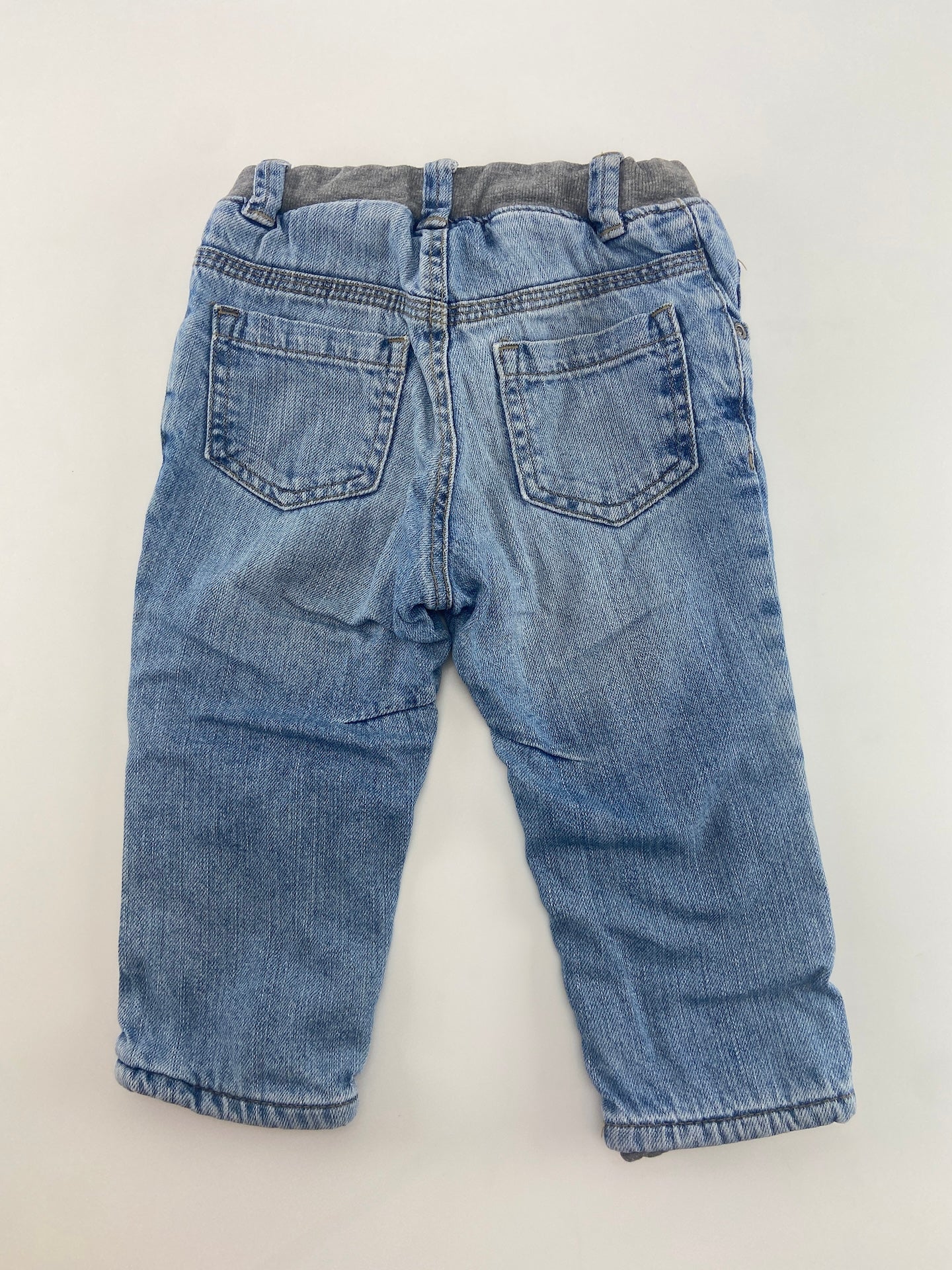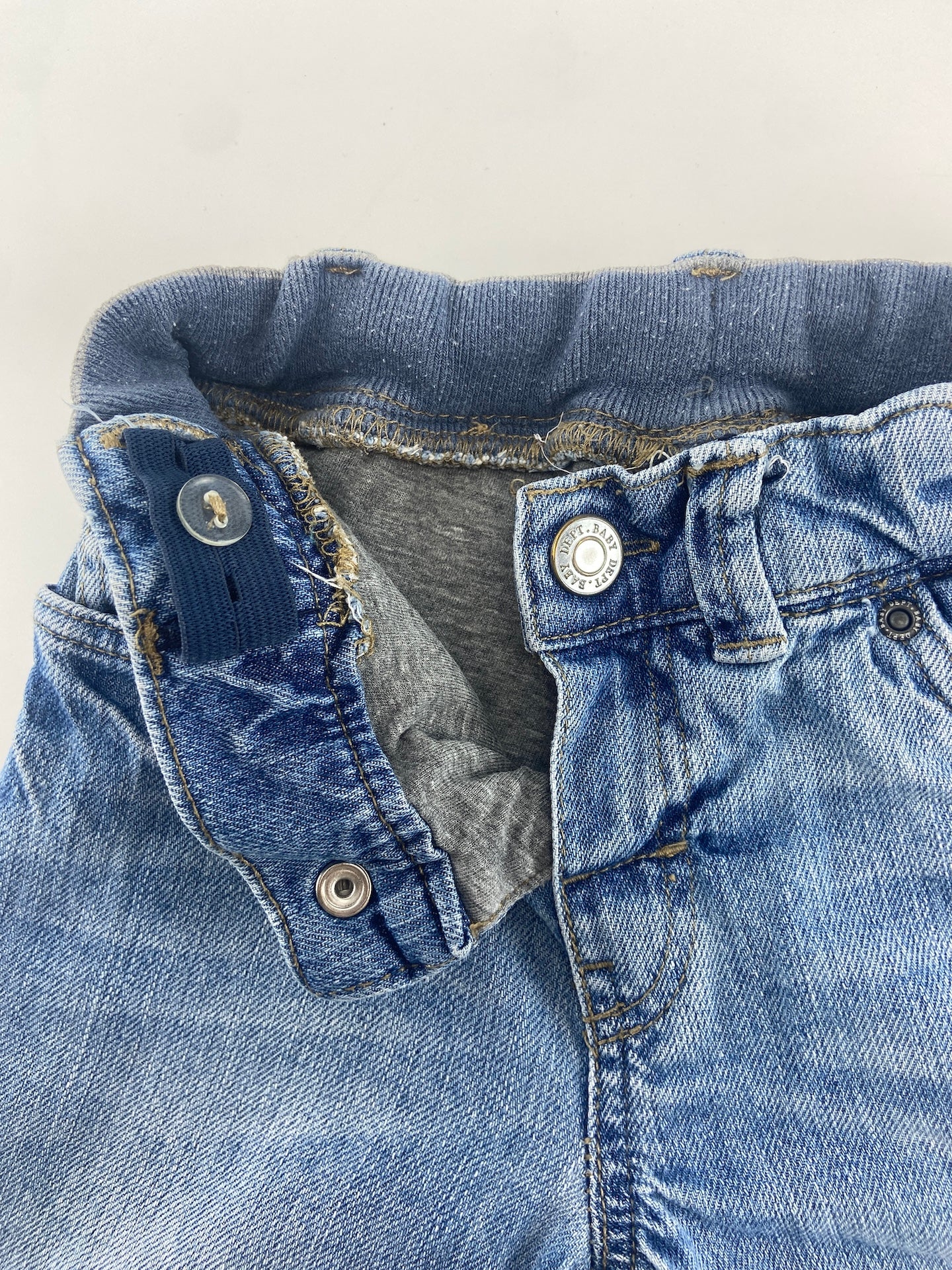 Calças de ganga com forro de algodão e elástico ajustavel na cintura.