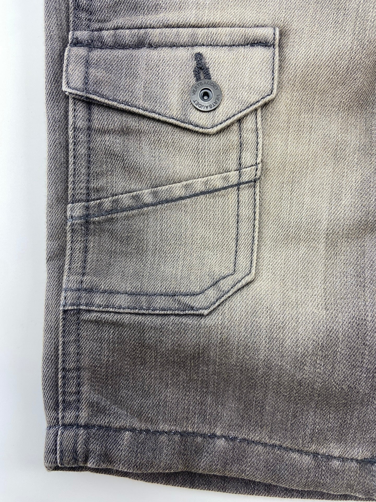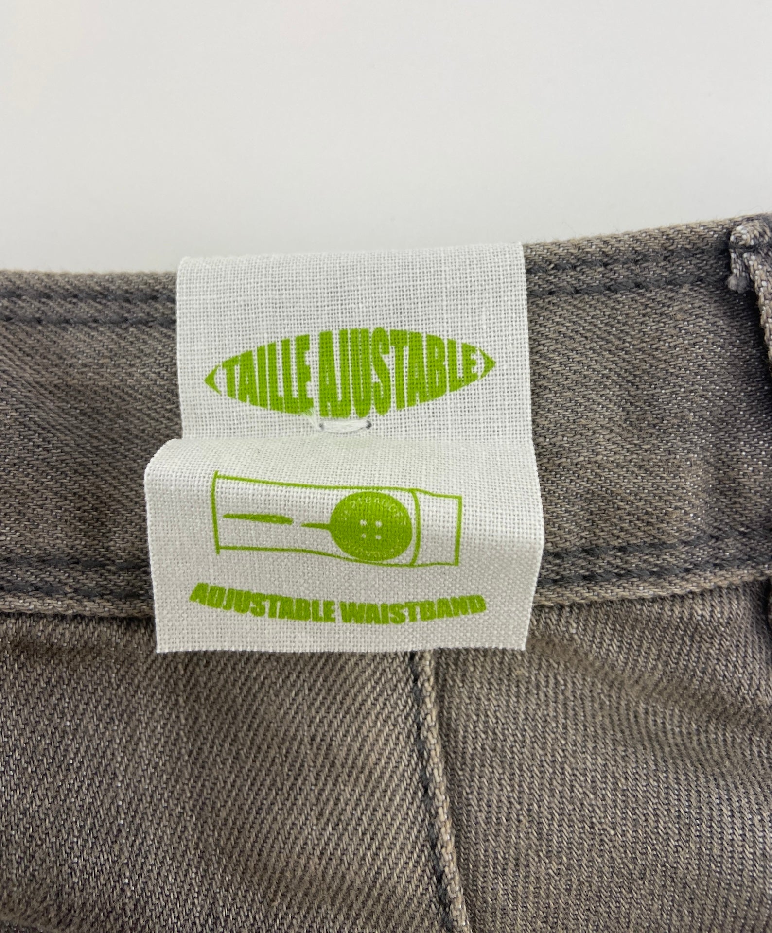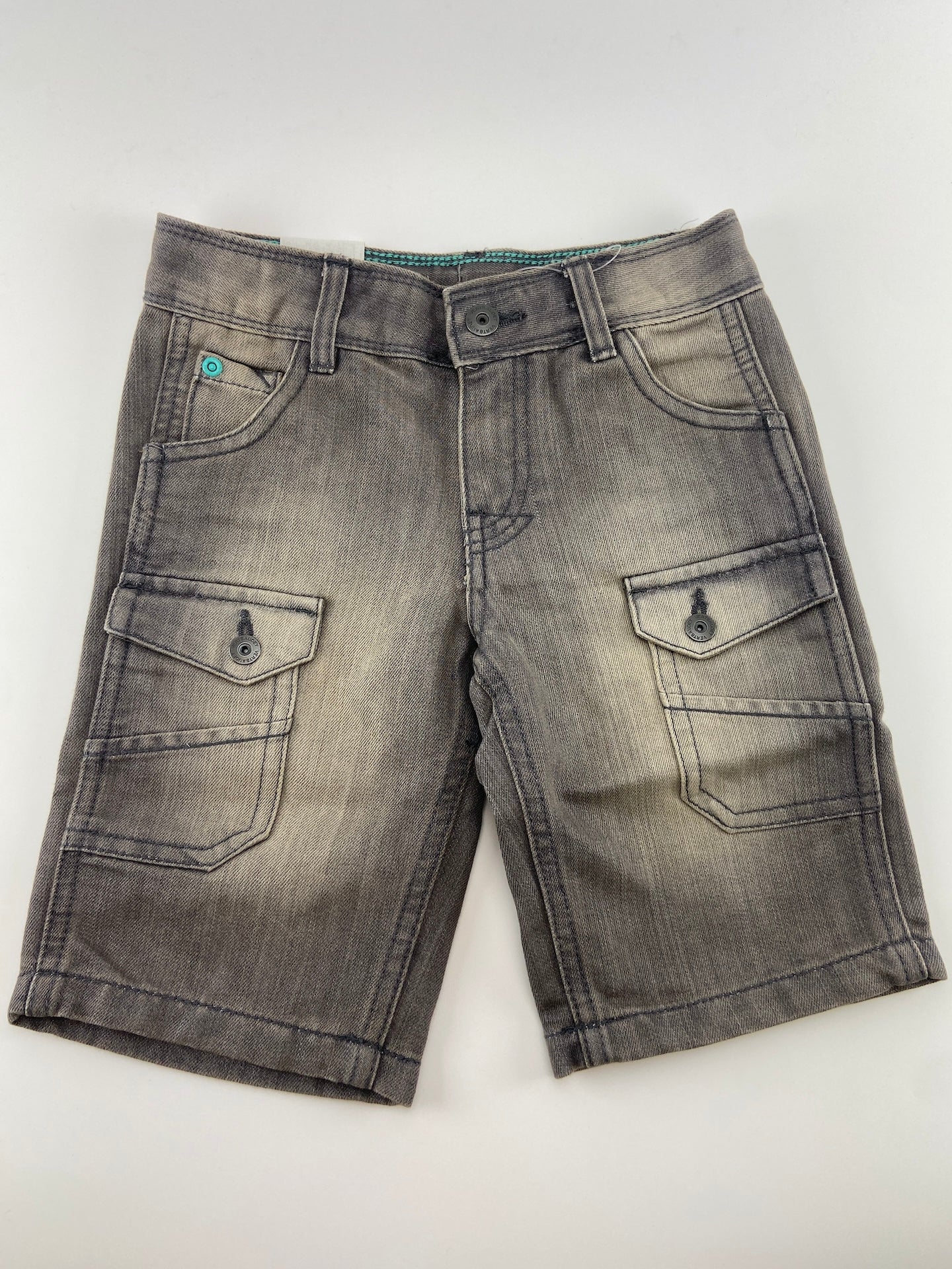 Calções de ganga com bolsos nas pernas e elástico para ajustar na cintura.