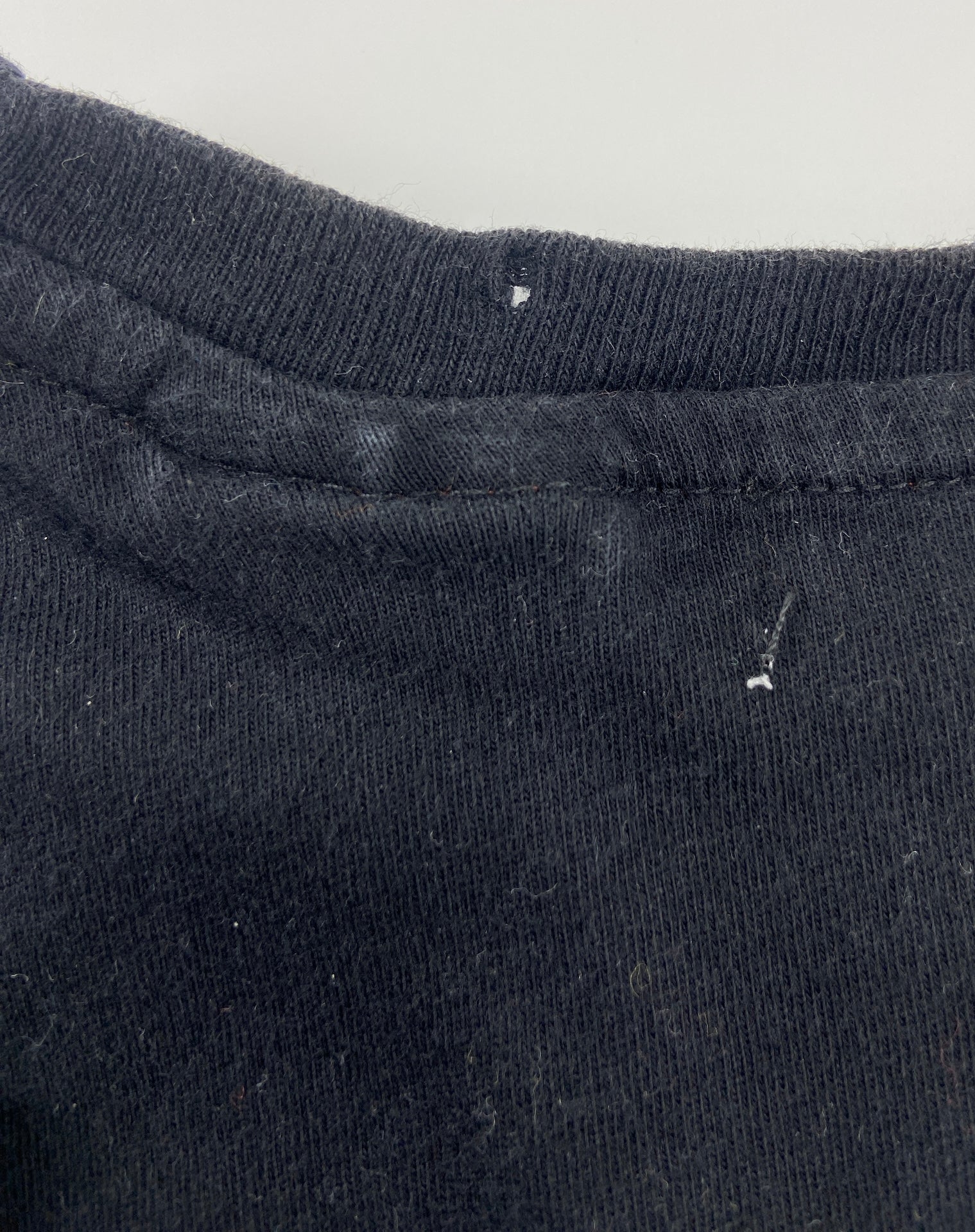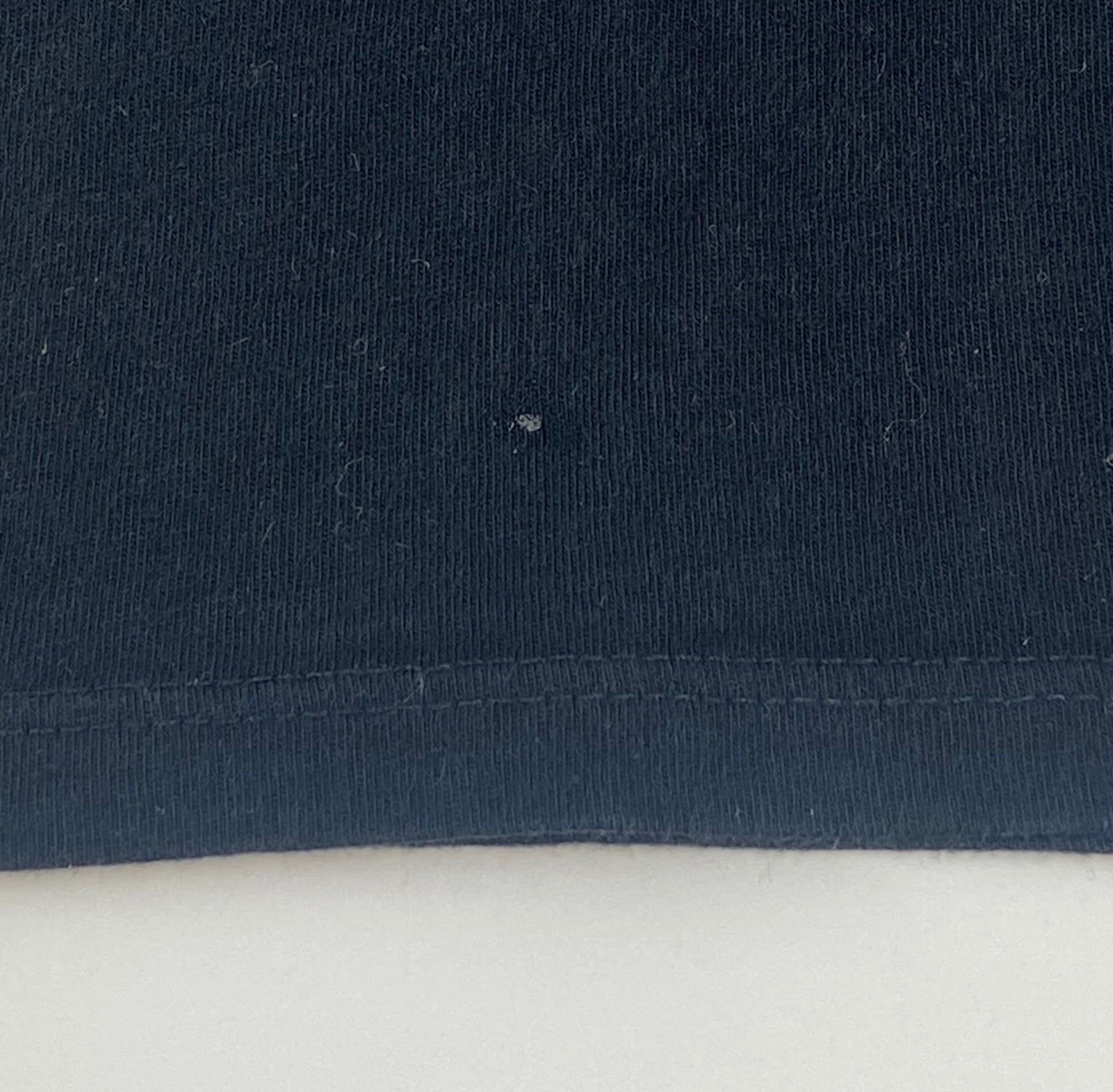 Bom estado geral mas tem um buraco na parte de trás da gola, um buraco mínimo junto à costura e uma pequena nodoa de cola na frente.