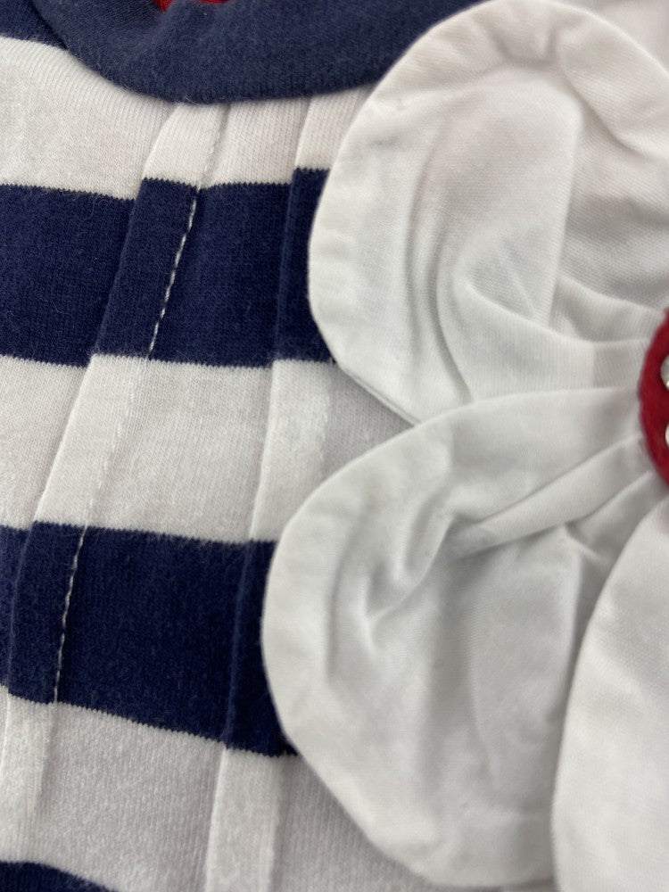 Vestido com padrão de riscas, aberto nas costas com saiote em tule.