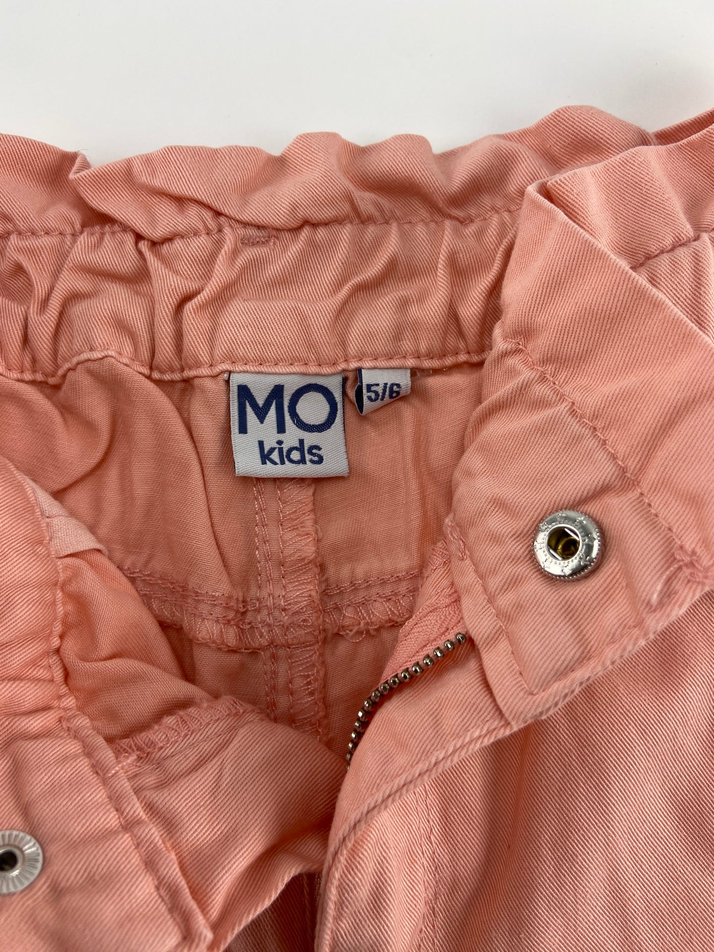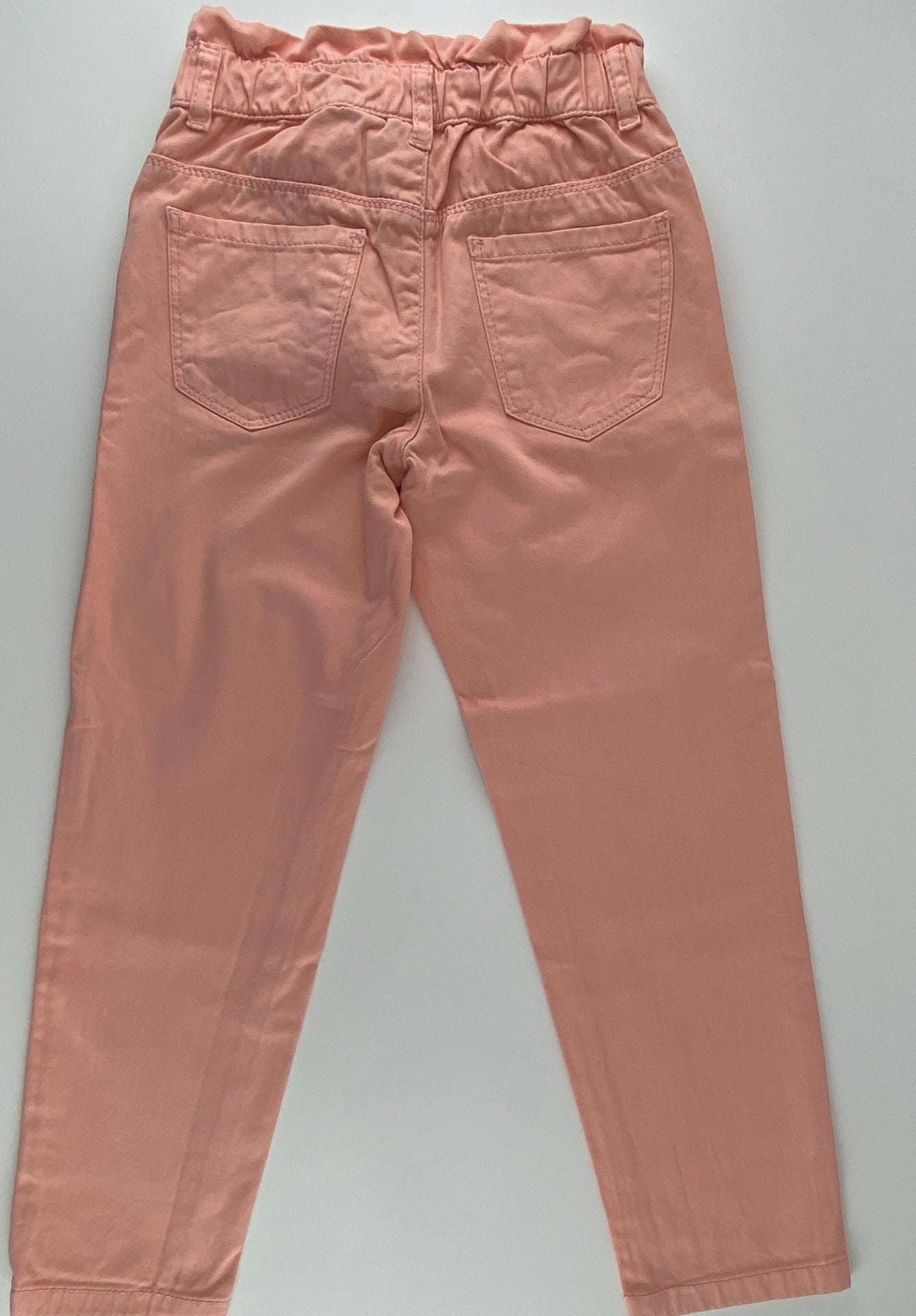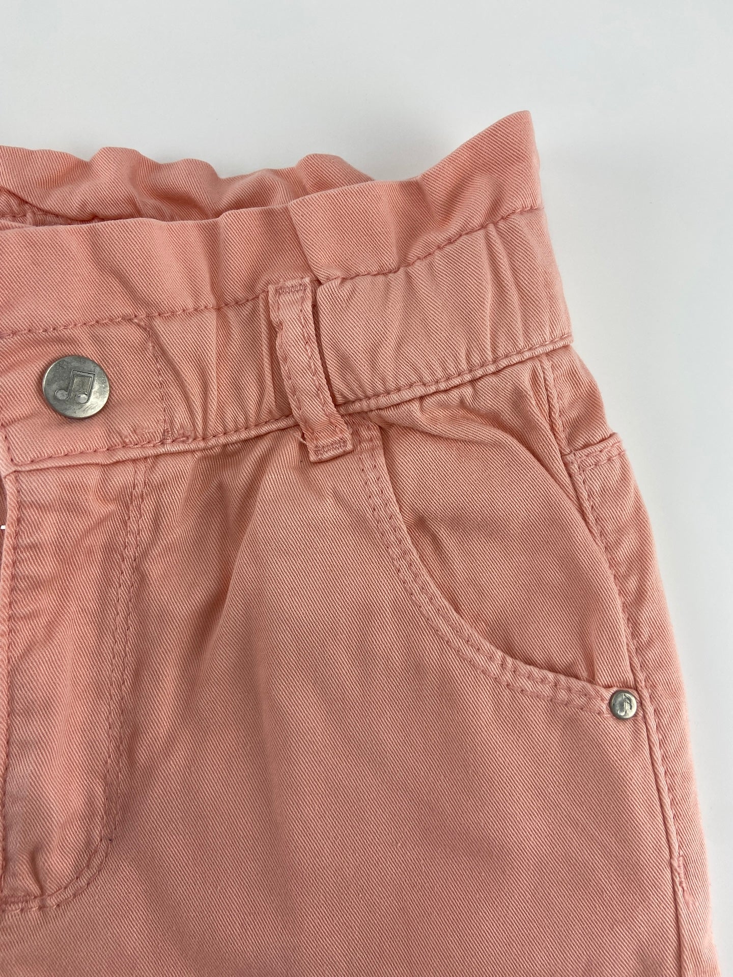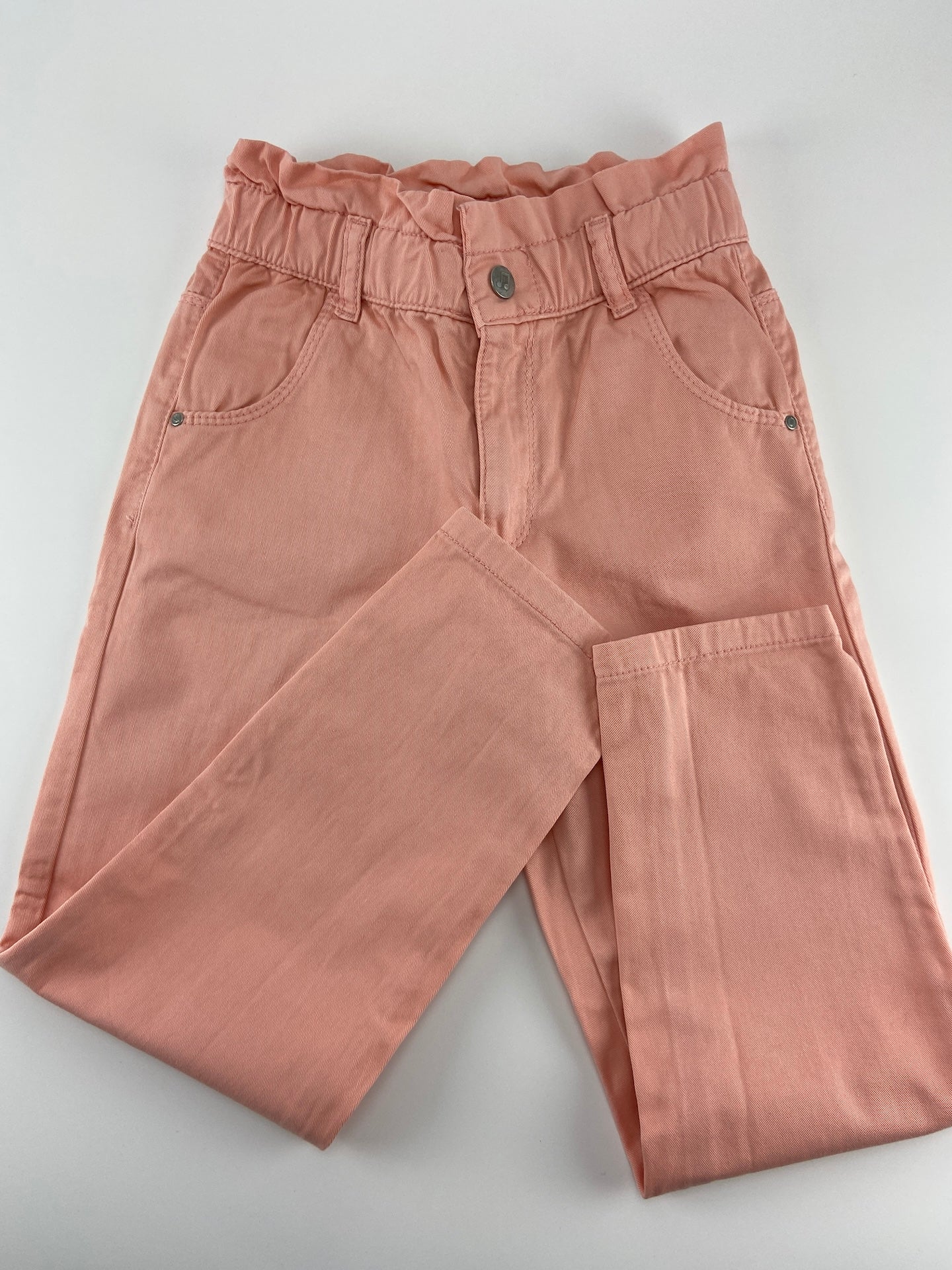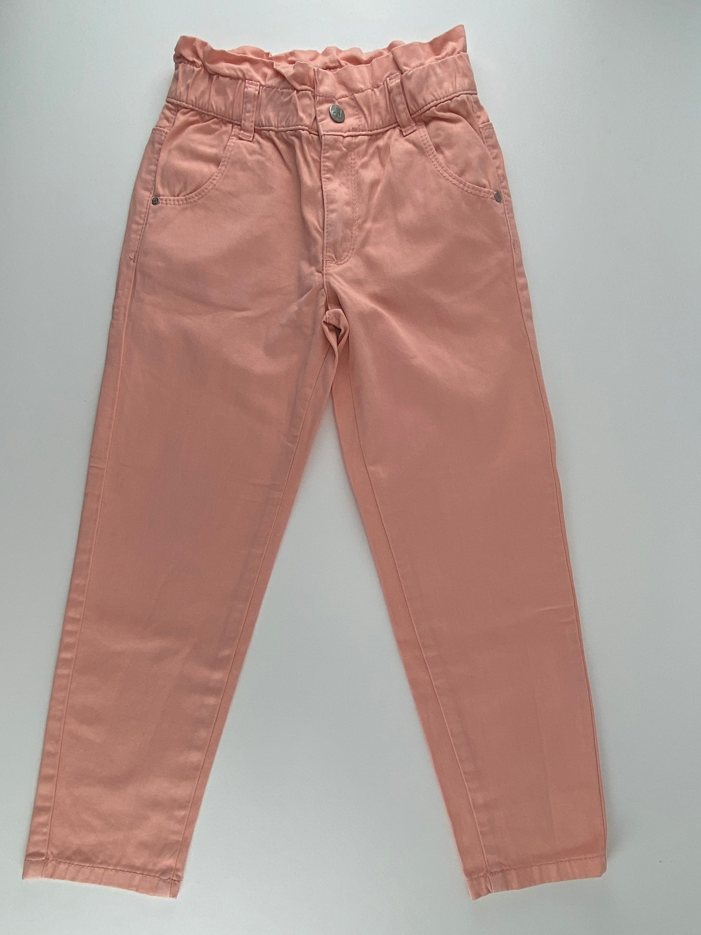Calças em sarja com botão de mola e elástico na cintura. Com 4 bolsos.