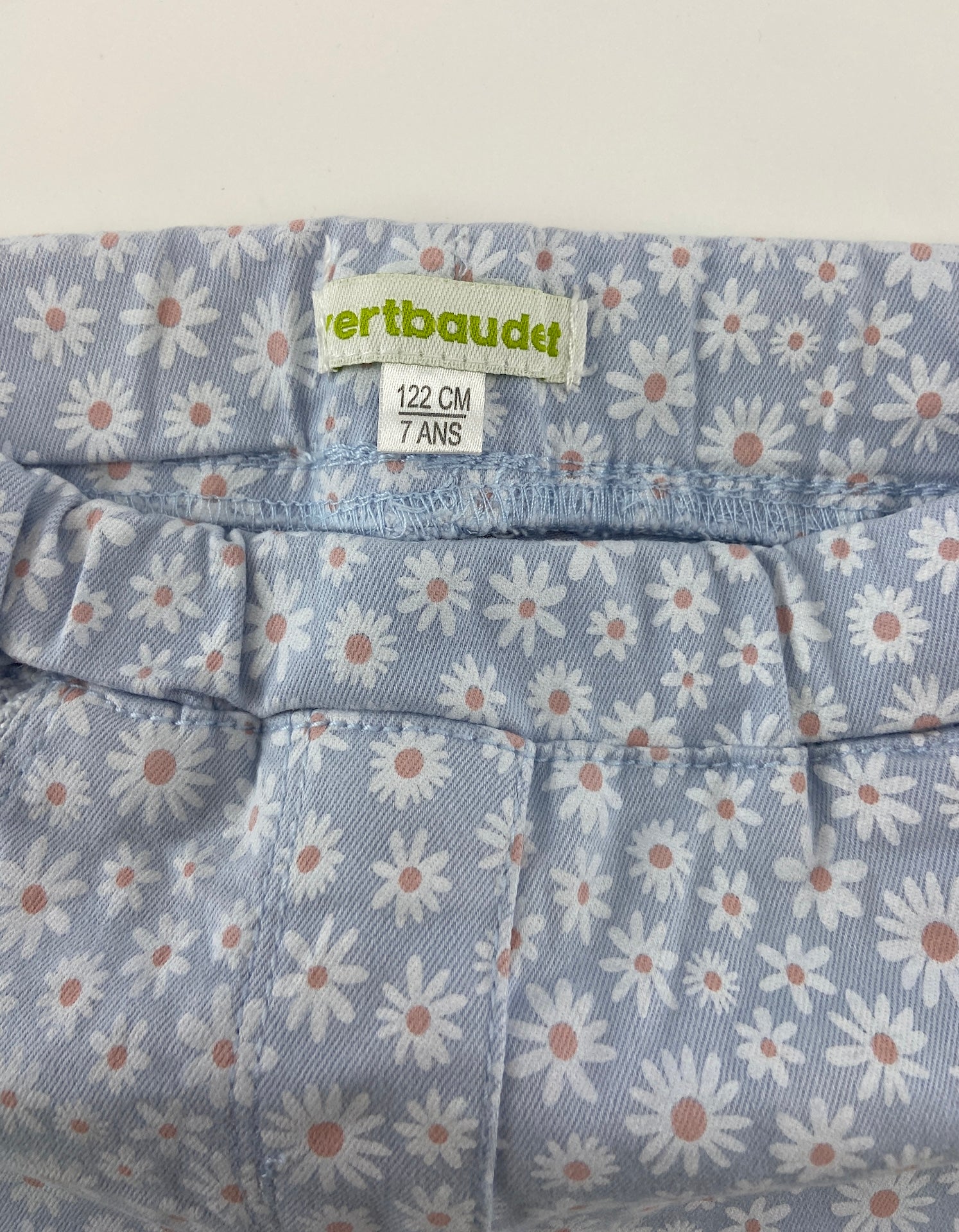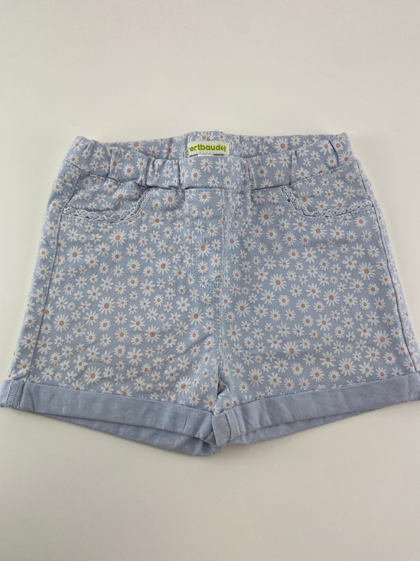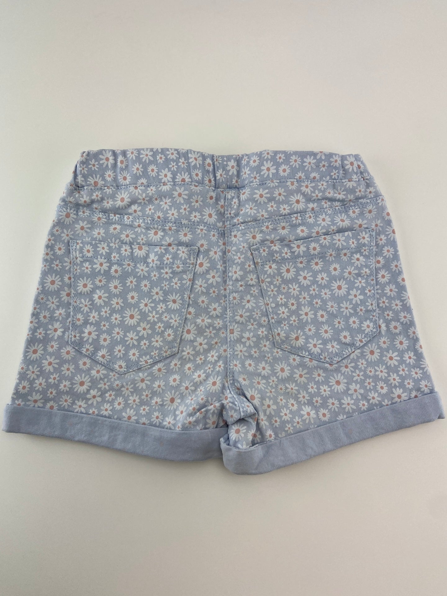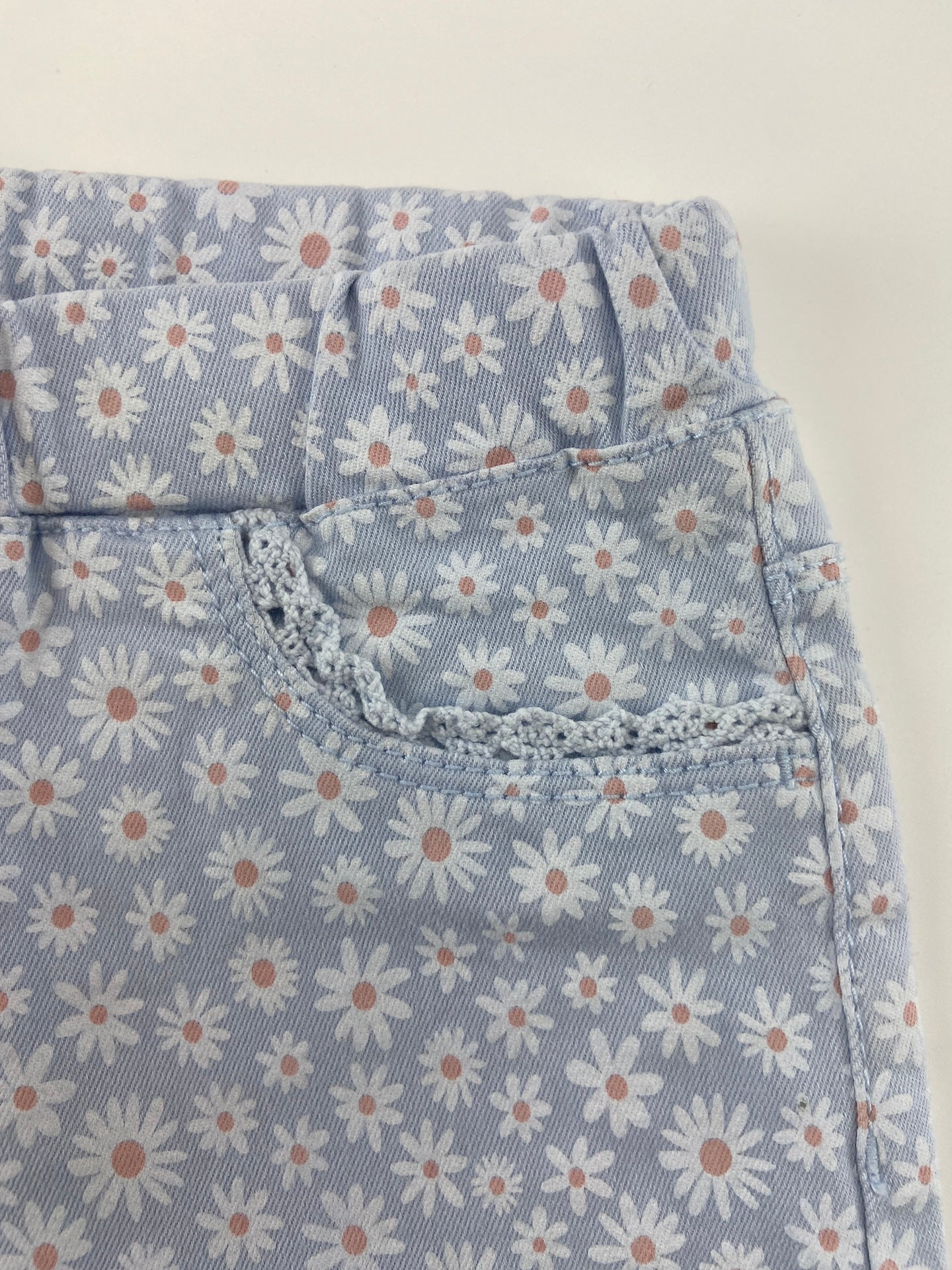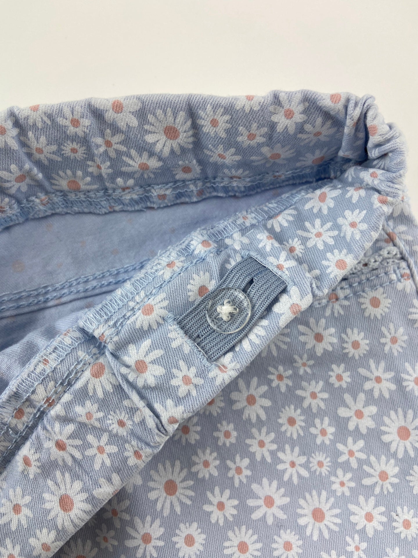 Calções com elástico na cintura, com flores estampados. Veste pequeno.