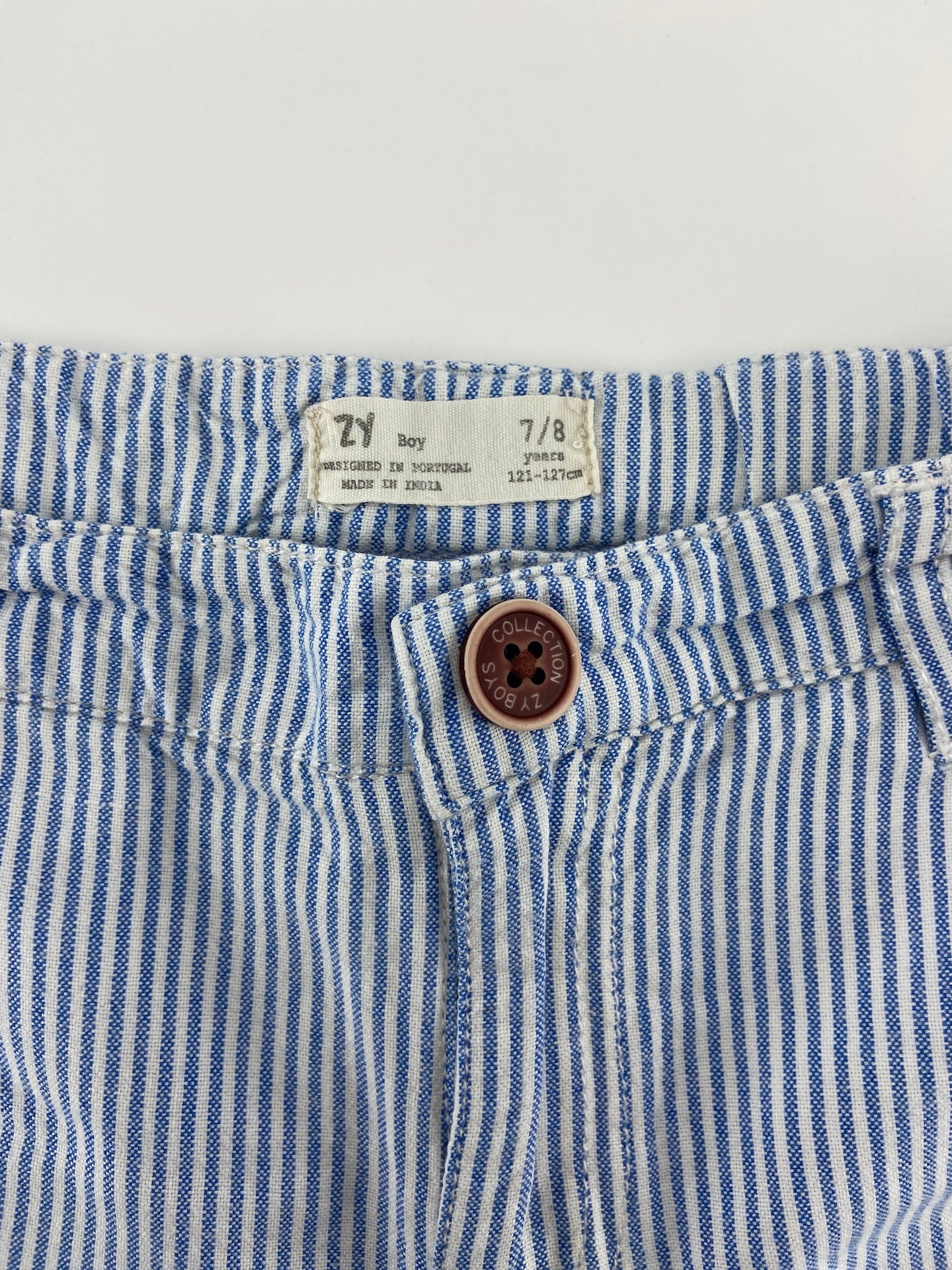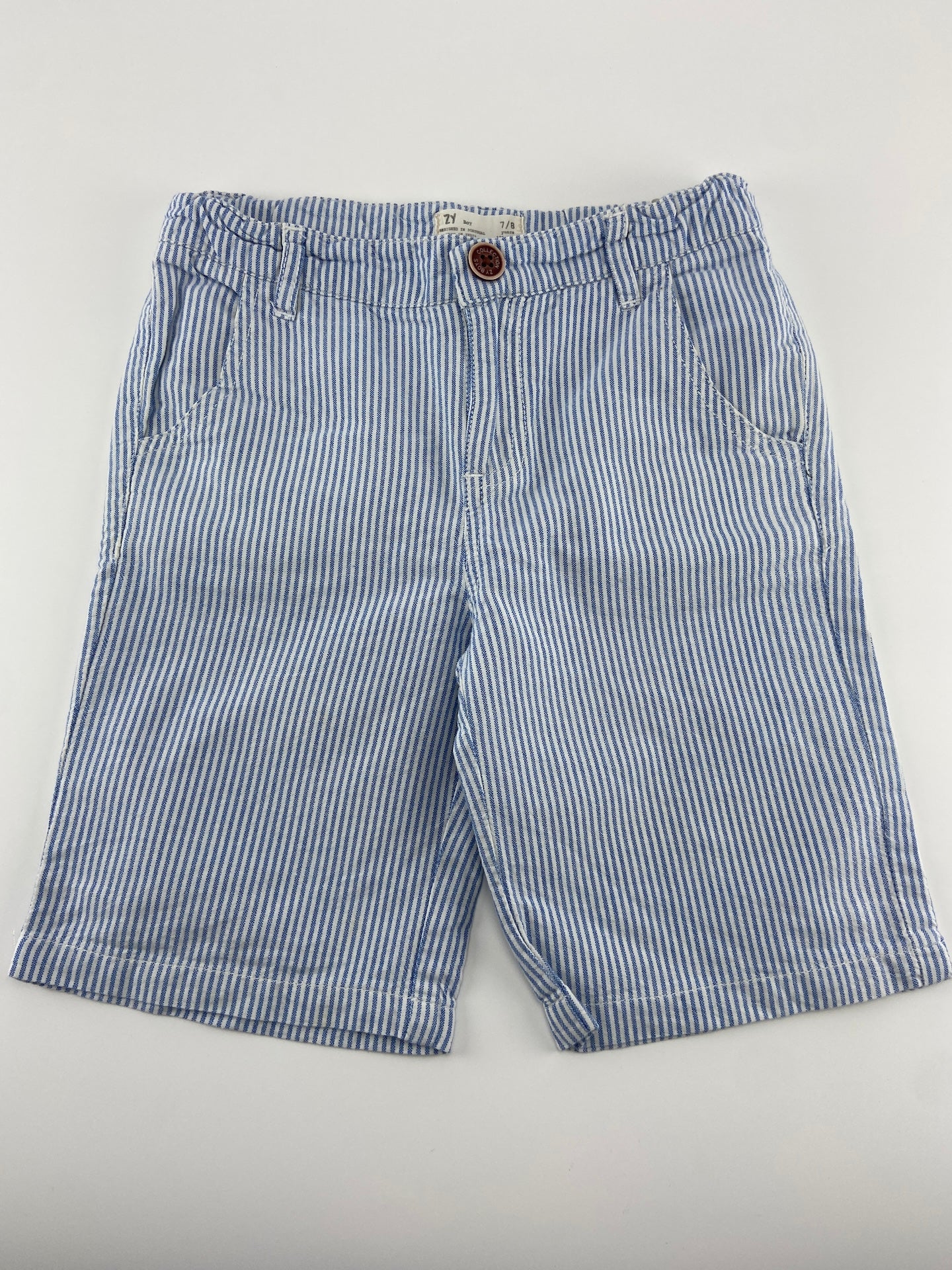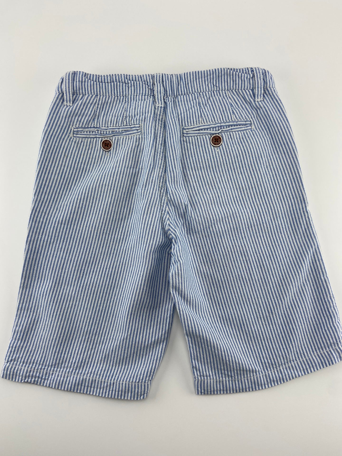Calções de algodão às riscas com botão de mola e 4 bolsos.